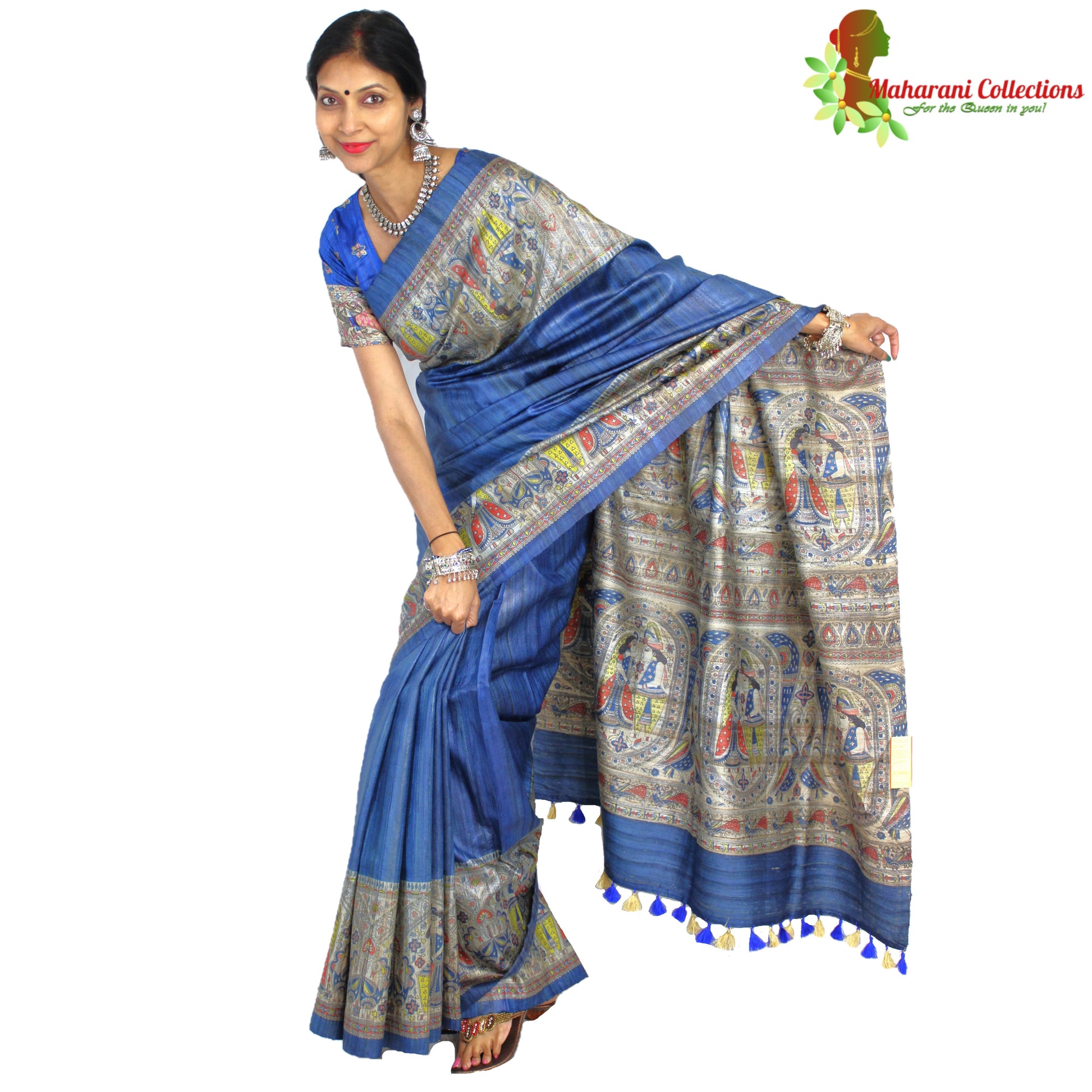 Maharani's Pure Tussar Silk Saree (Silk Mark) - Robin Blue with Madhubani Hand Painting