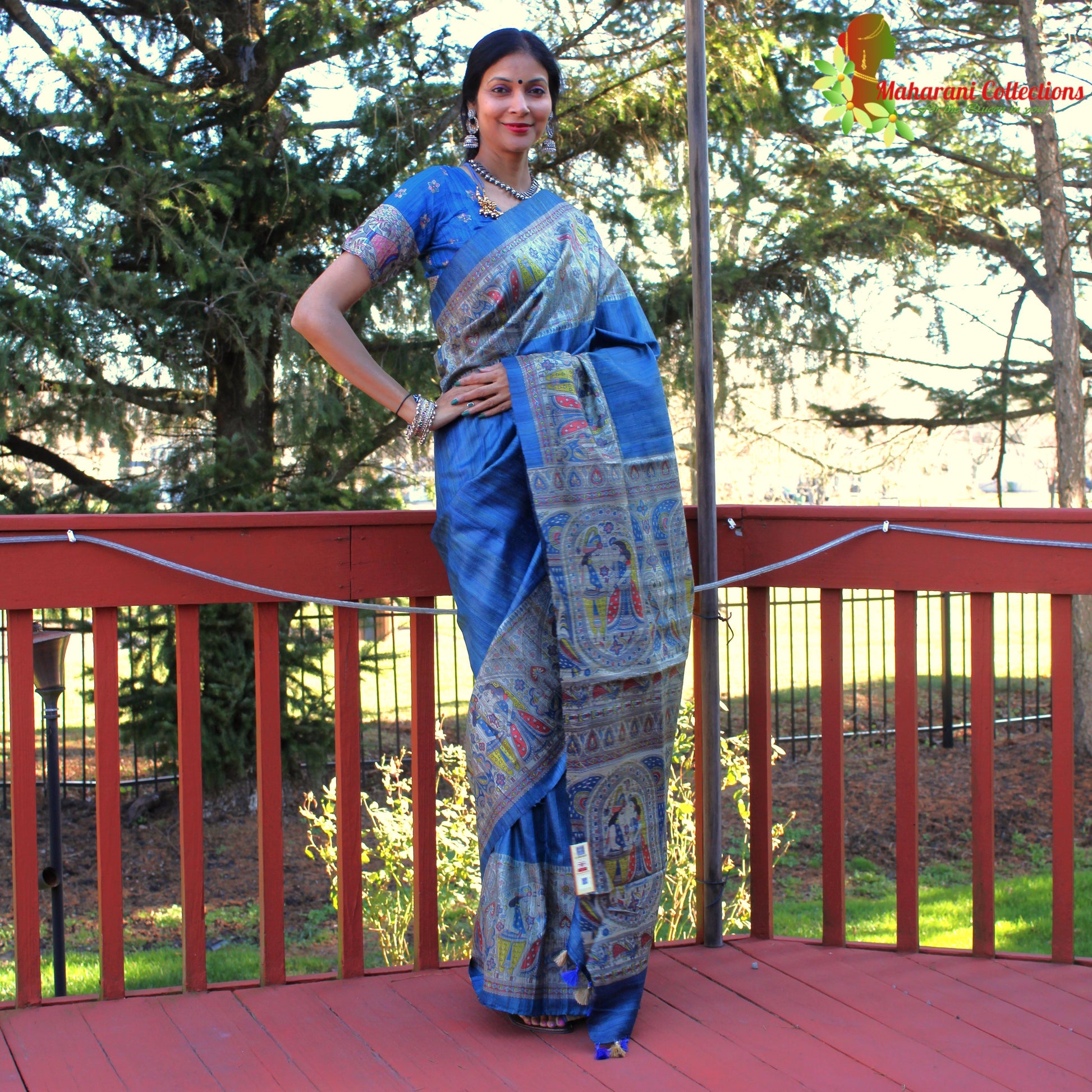 - Saree: Color - Robin Blue, Material - Pure Tussar Silk, Work - Details Madhubani Hand-print work
