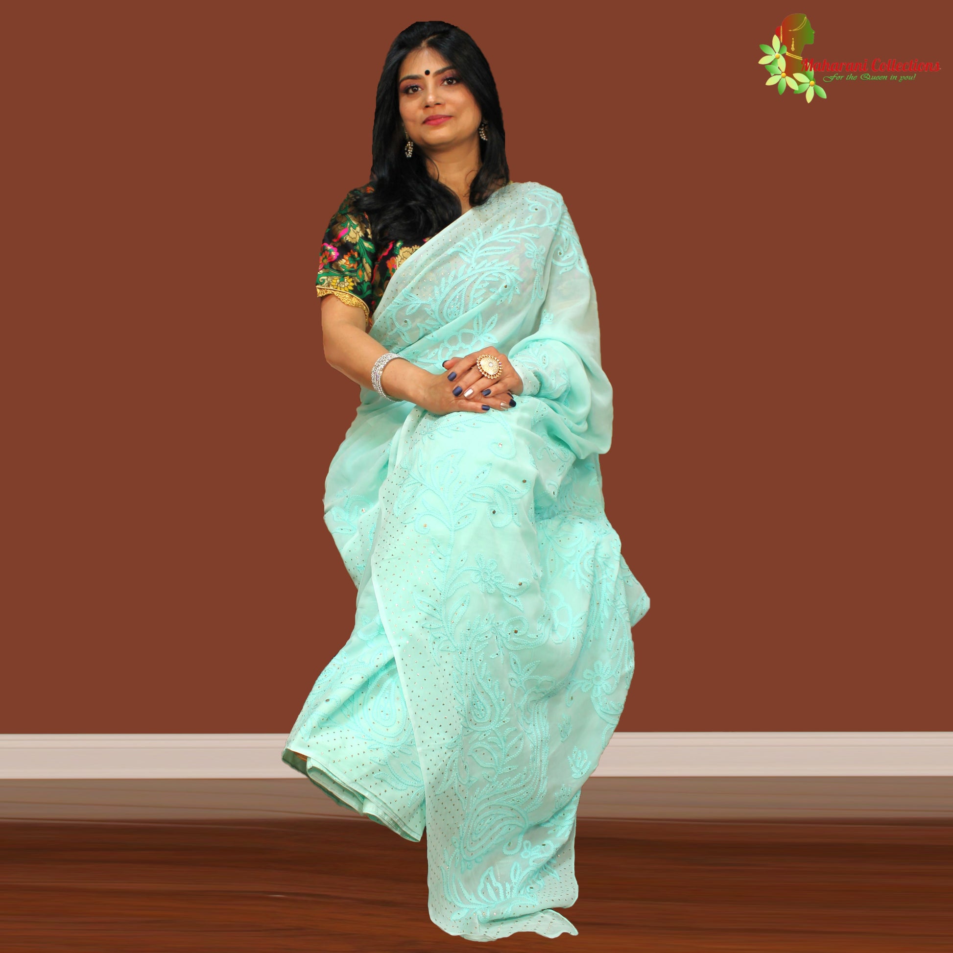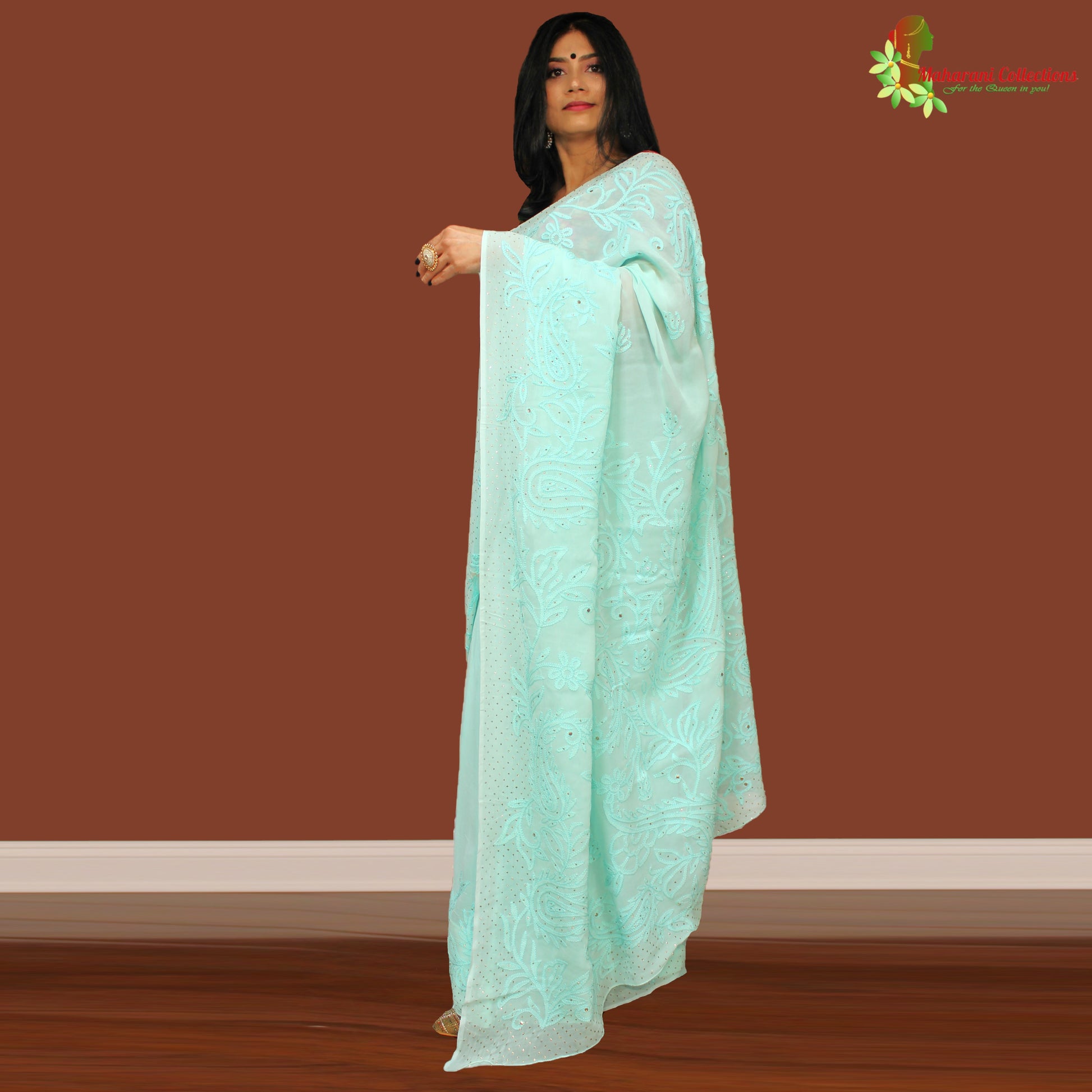 Maharani's Party Wear Lucknowi Chikankari Saree - Sea Green - Pure Georgette