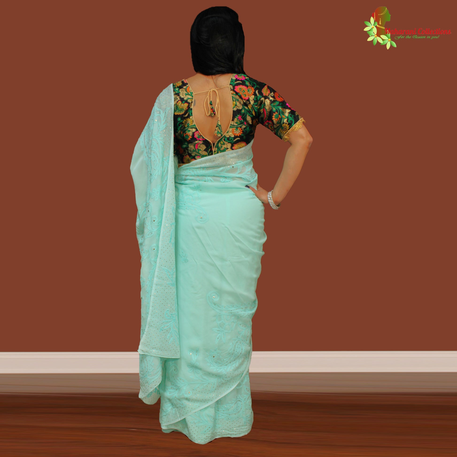 Pure Georgette saree with authentic Lucknowi Chikankari work, comes with ready-to-wear stitched petticoat. All stitching is done as per Maharani's specification with original and authentic material.