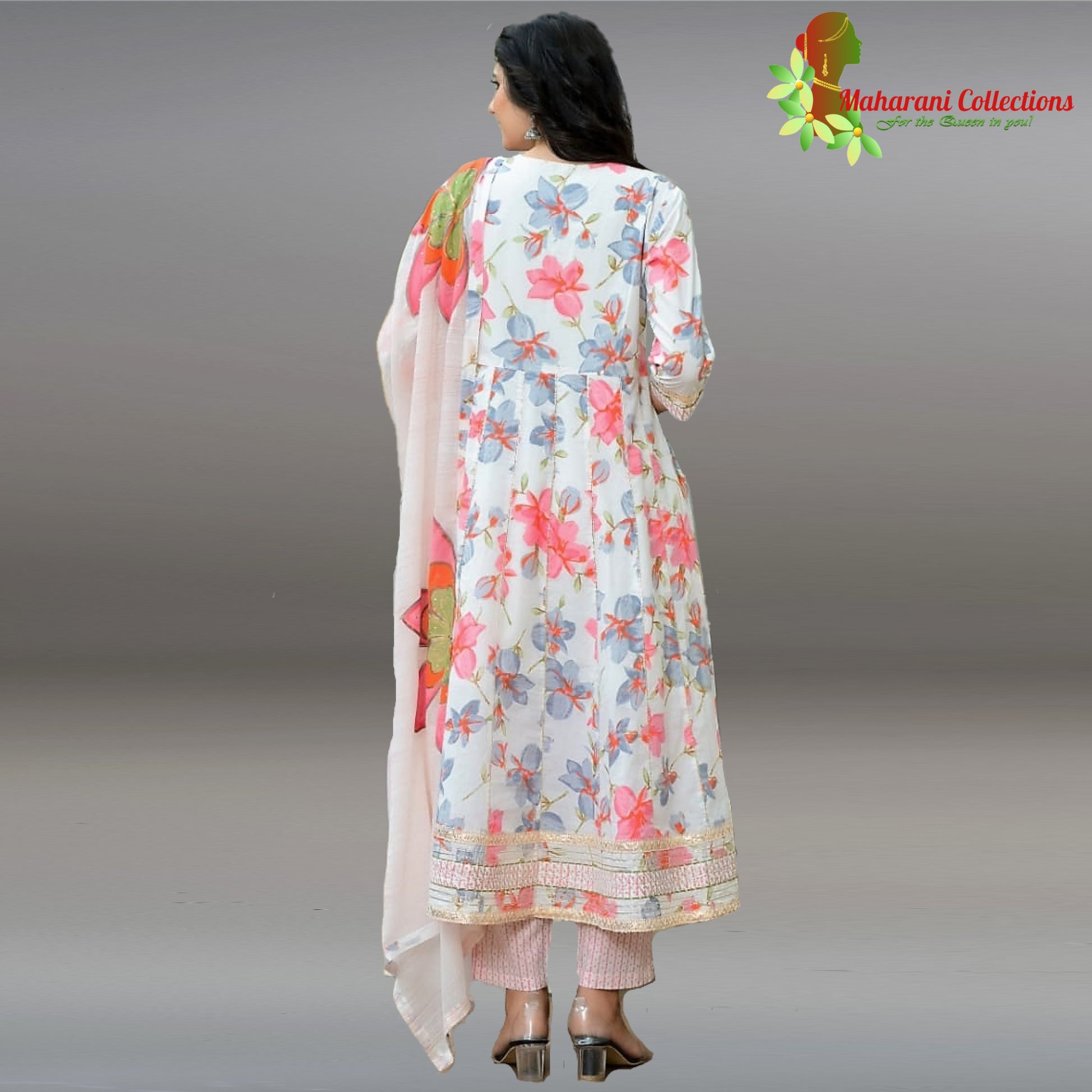 Maharani's Anarkali Suit - White Floral (L) - Pure Muslin Silk