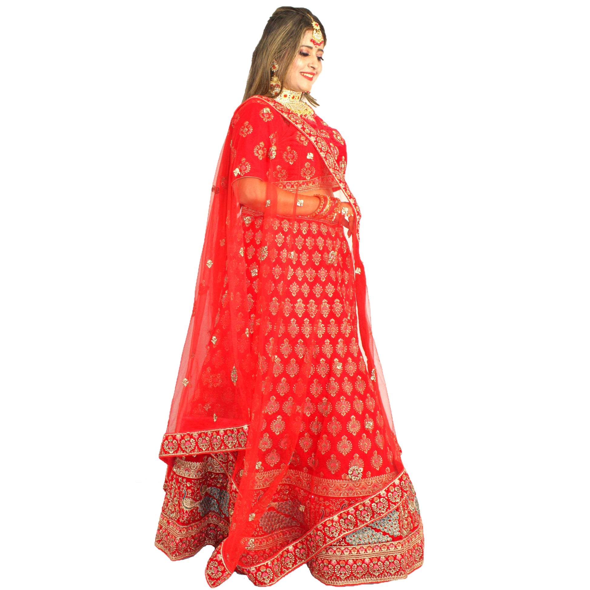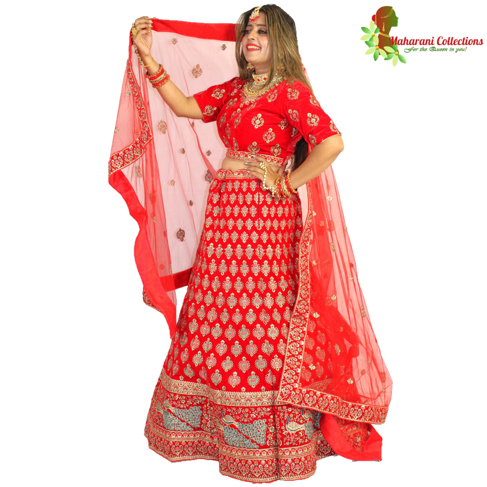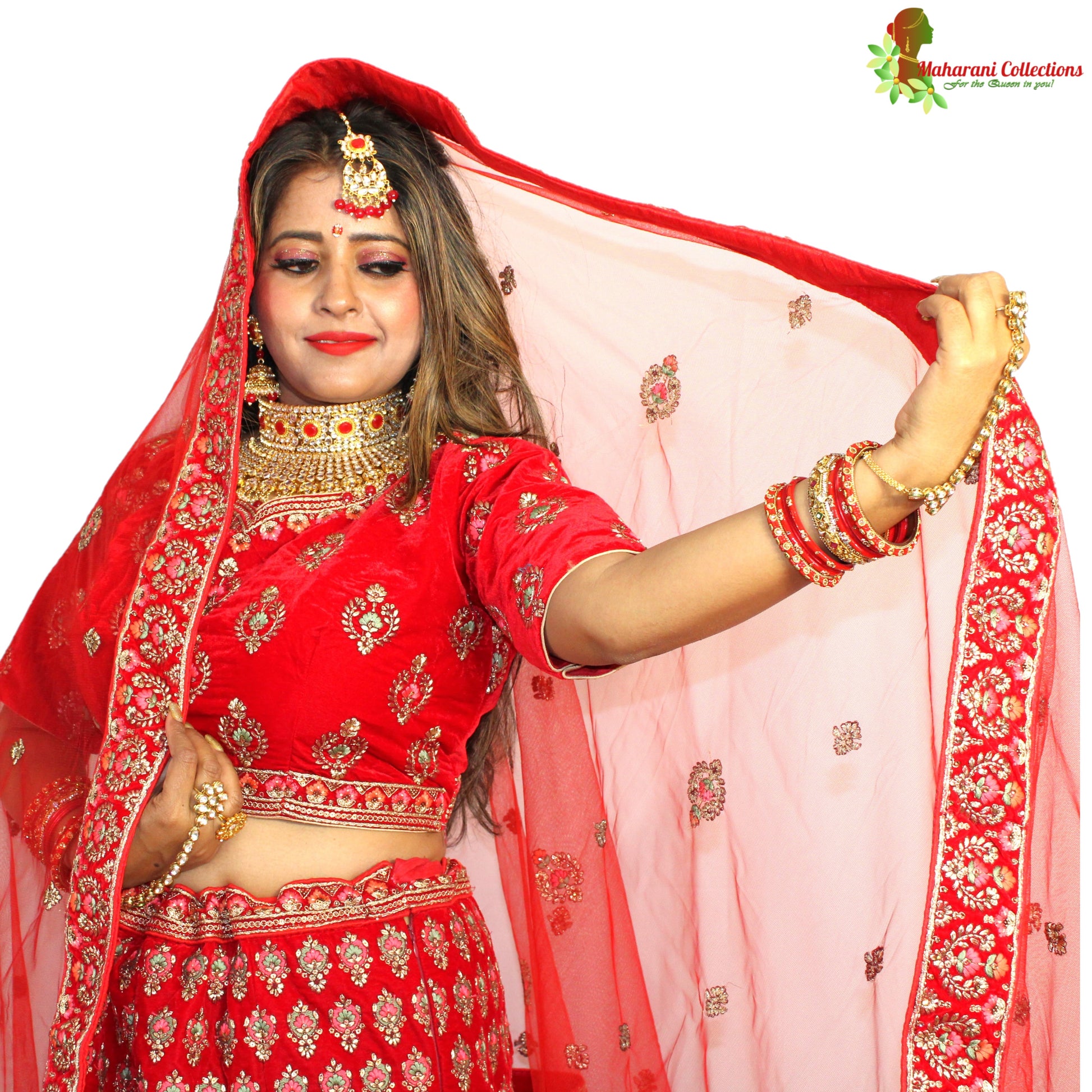 Maharani's heavy Velvet, Silk and Net bridal Lehenga in shining bridal red color, stitched choli and dupatta. Lehenga has stitched cotton lining, detailed thread, sequins, stone and Zardoji work. Choli is padded with side zipper and back string. This beautiful Lehenga comes with a matching net Dupatta, also with thread, sequins, stone and Zardoji work.