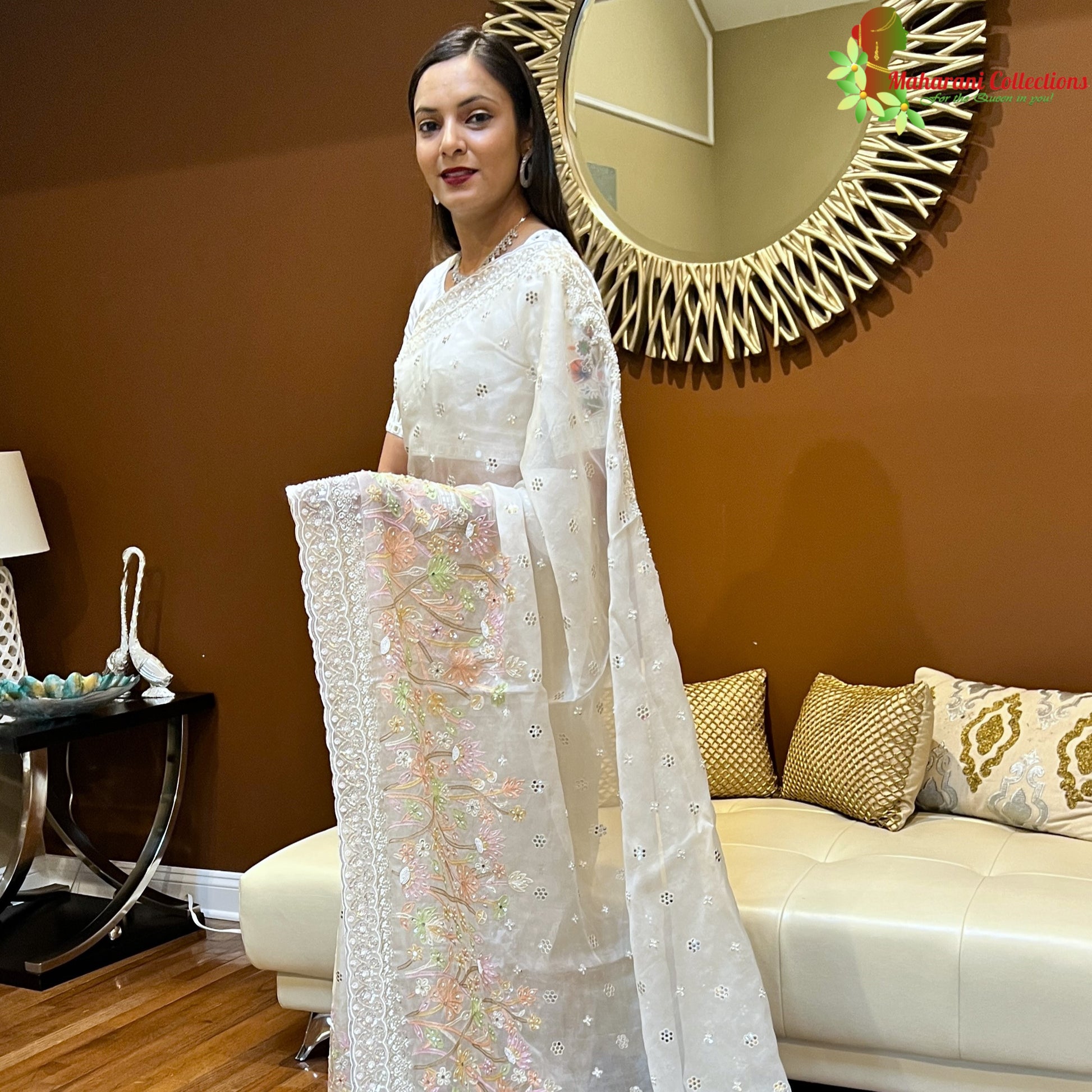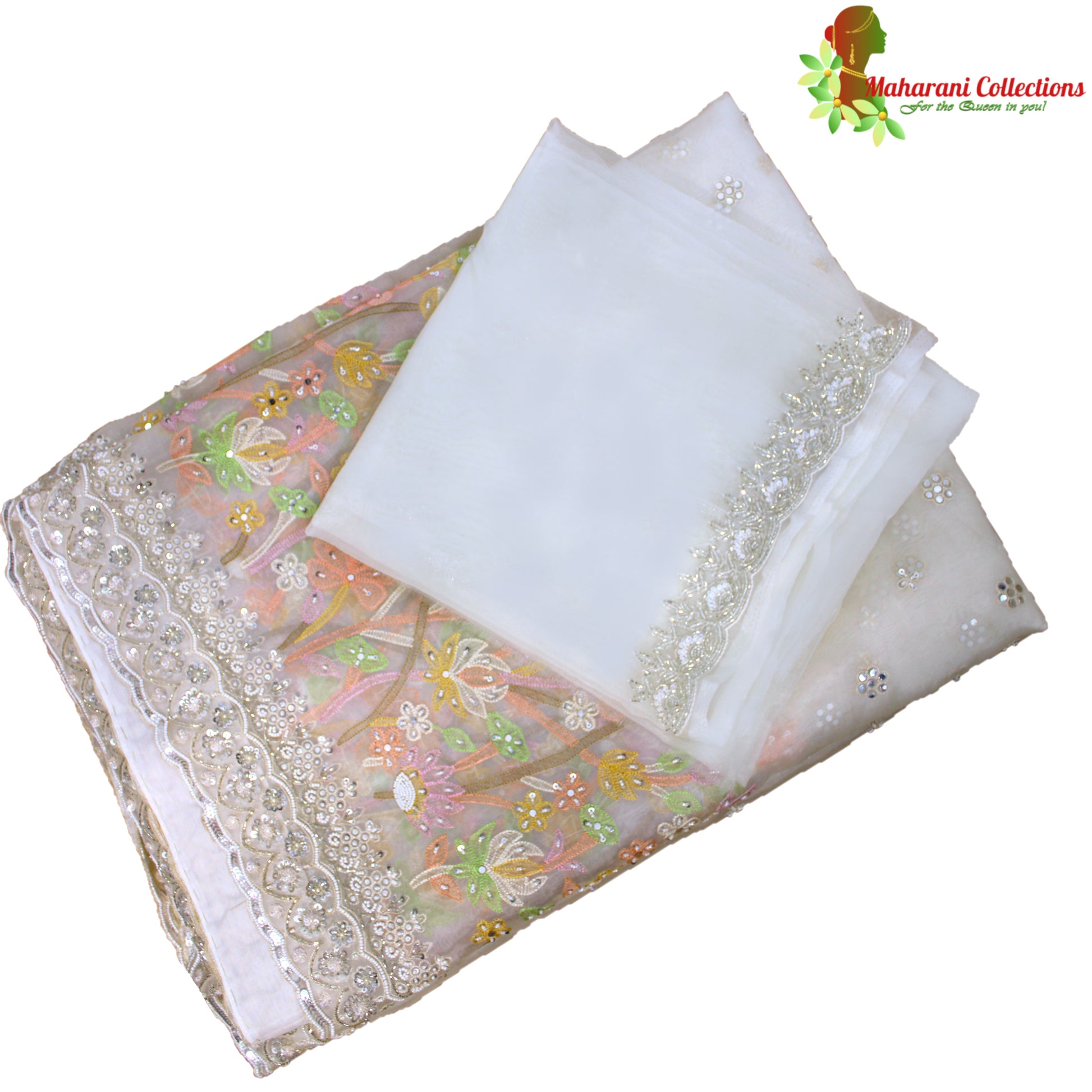 Maharani's Designer Party Wear Organza Saree - White (with Stitched Petticoat)