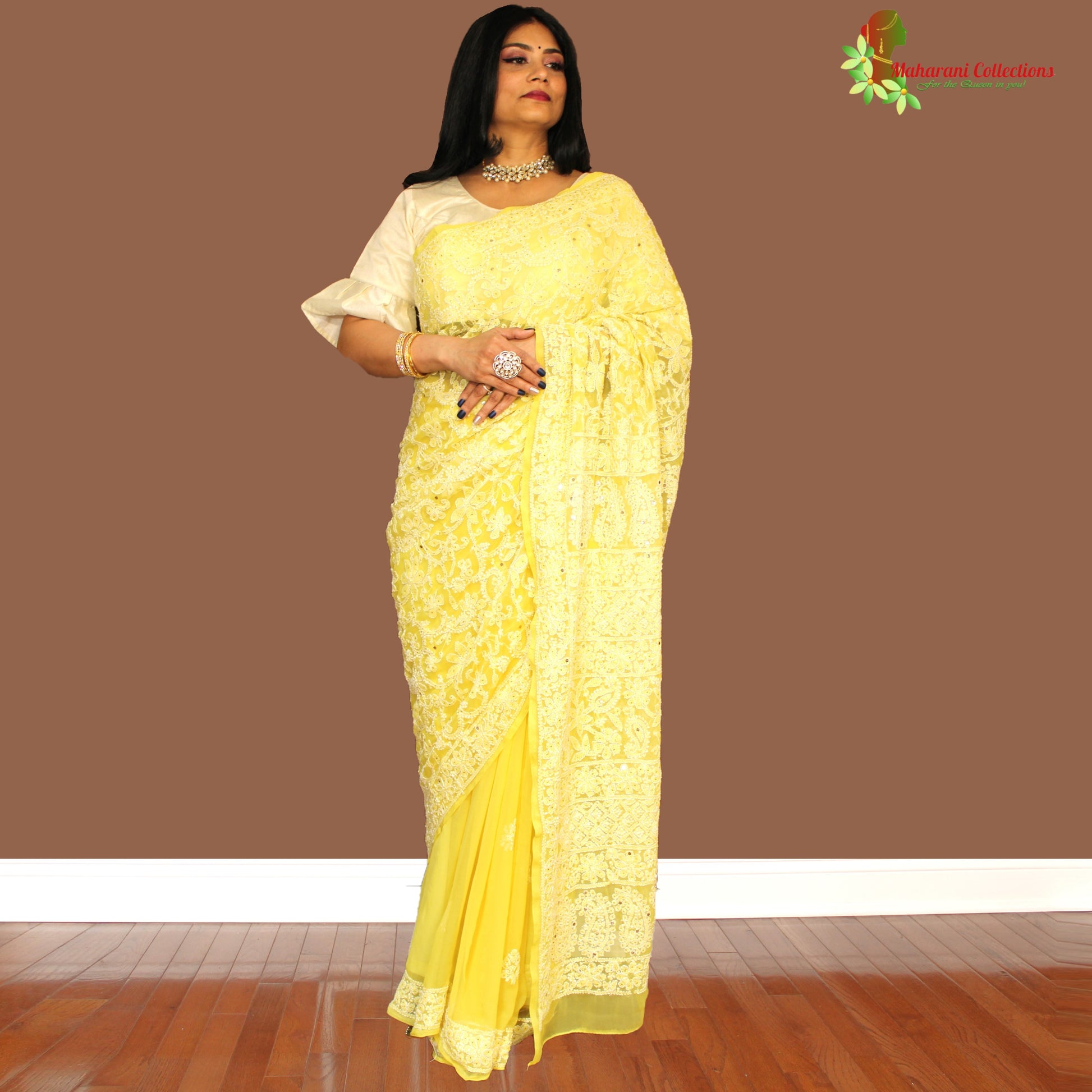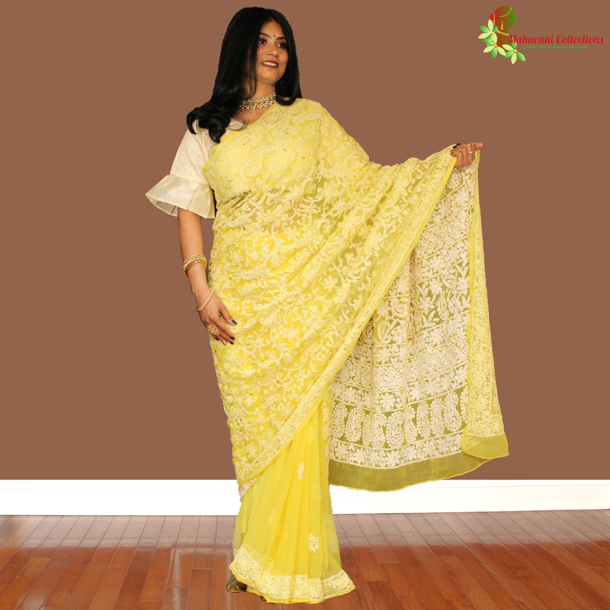 Maharani's Party Wear Lucknowi Chikankari Saree - Yellow - Pure Georgette