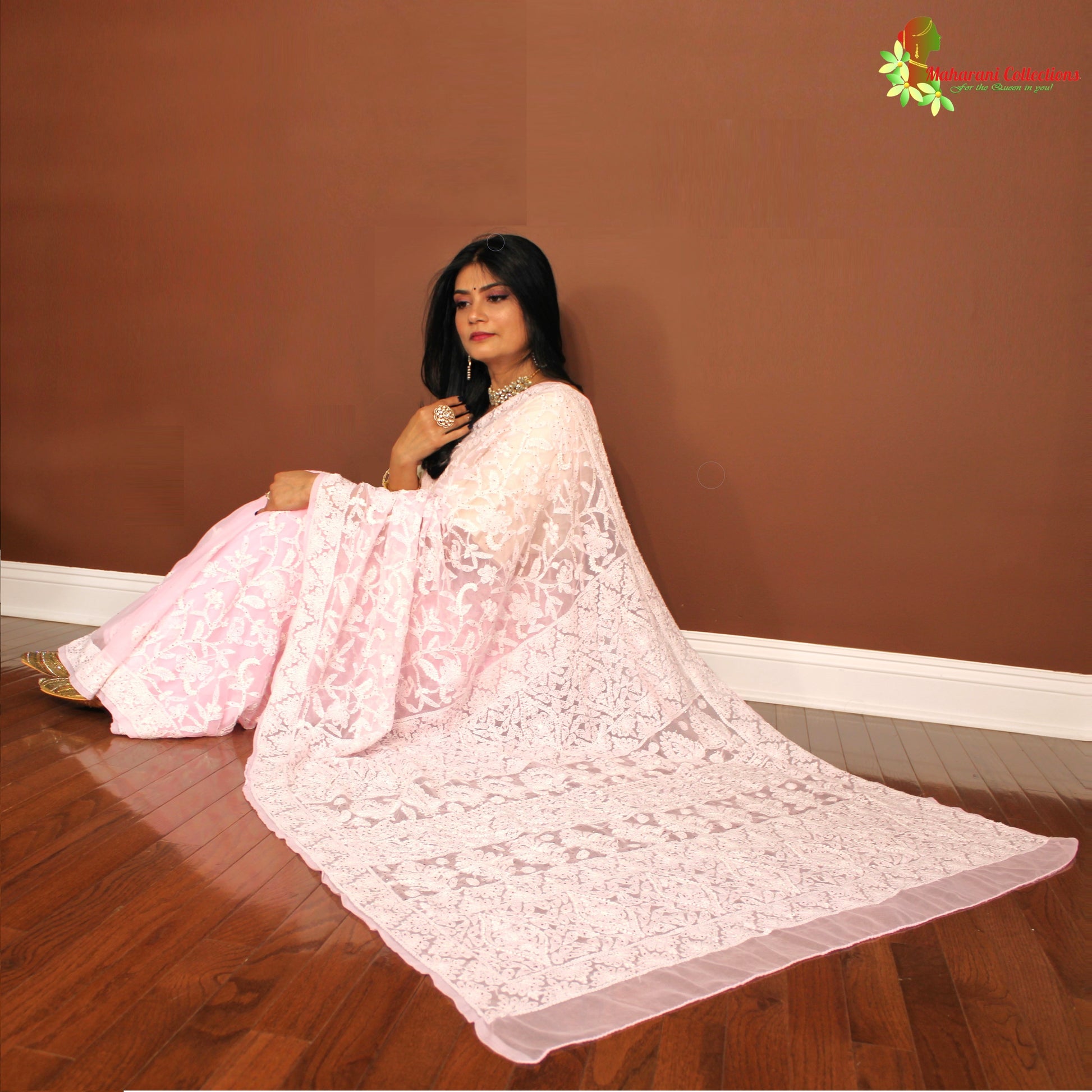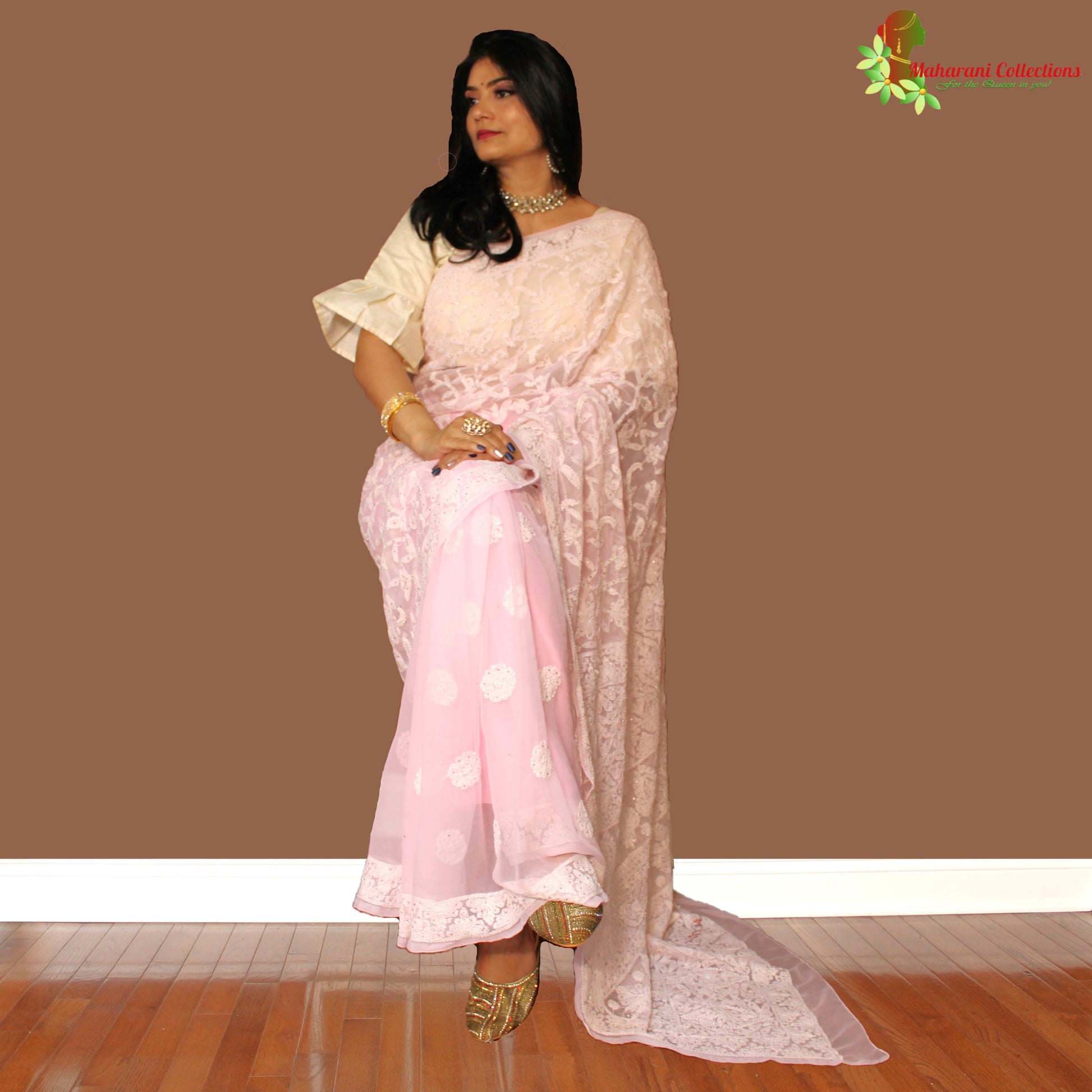 Pure Georgette saree with authentic Lucknowi Chikankari work, comes with ready-to-wear stitched petticoat. All stitching is done as per Maharani's specification with original and authentic material.