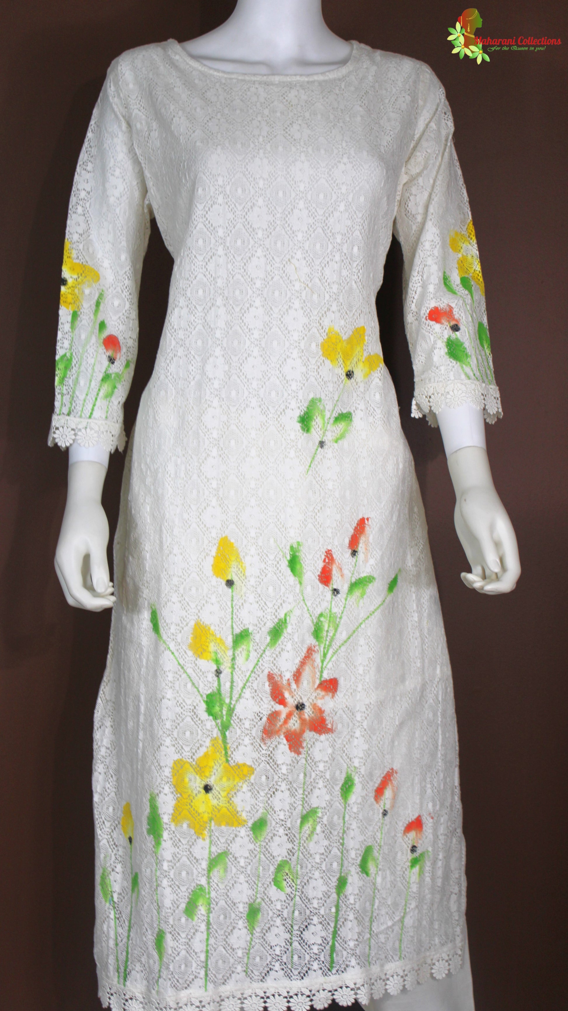 Maharani's Pant Suit with subtle floral prints, stitched Cotton liner, matching Pant and beautiful White, Floral Prints, Chiffon Dupatta.