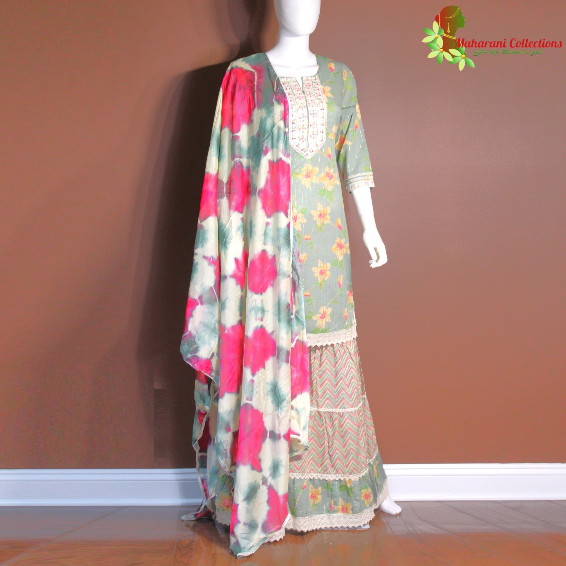 Maharani's Sharara Suit with Thread, Sequins, and Beads Work. Overall Floral Prints and Lace Work. Matching Sharara Pant and Georgette Lace Work Dupatta.