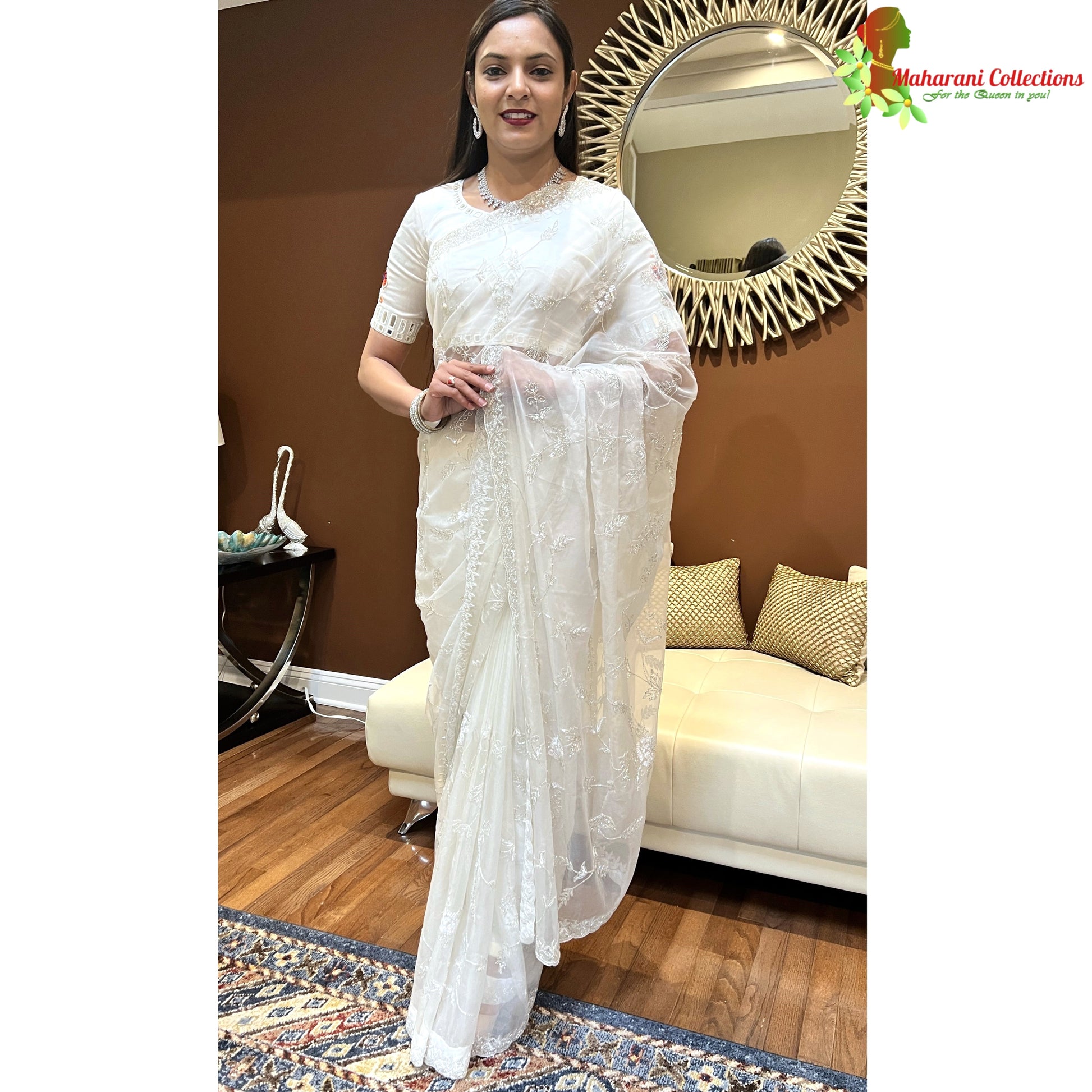 Maharani's Party Wear Tissue Chiffon Saree - White (with Stitched Petticoat)