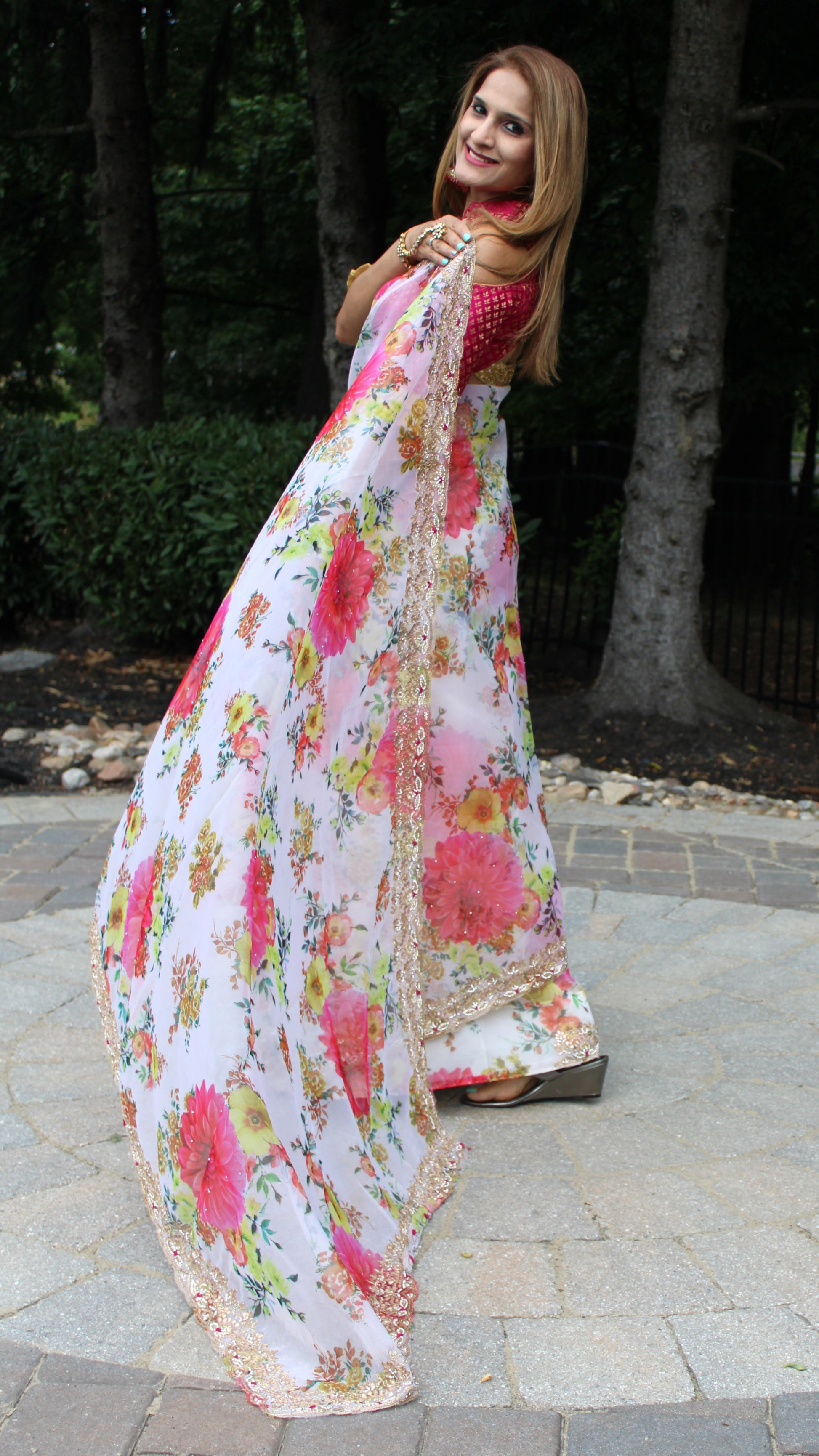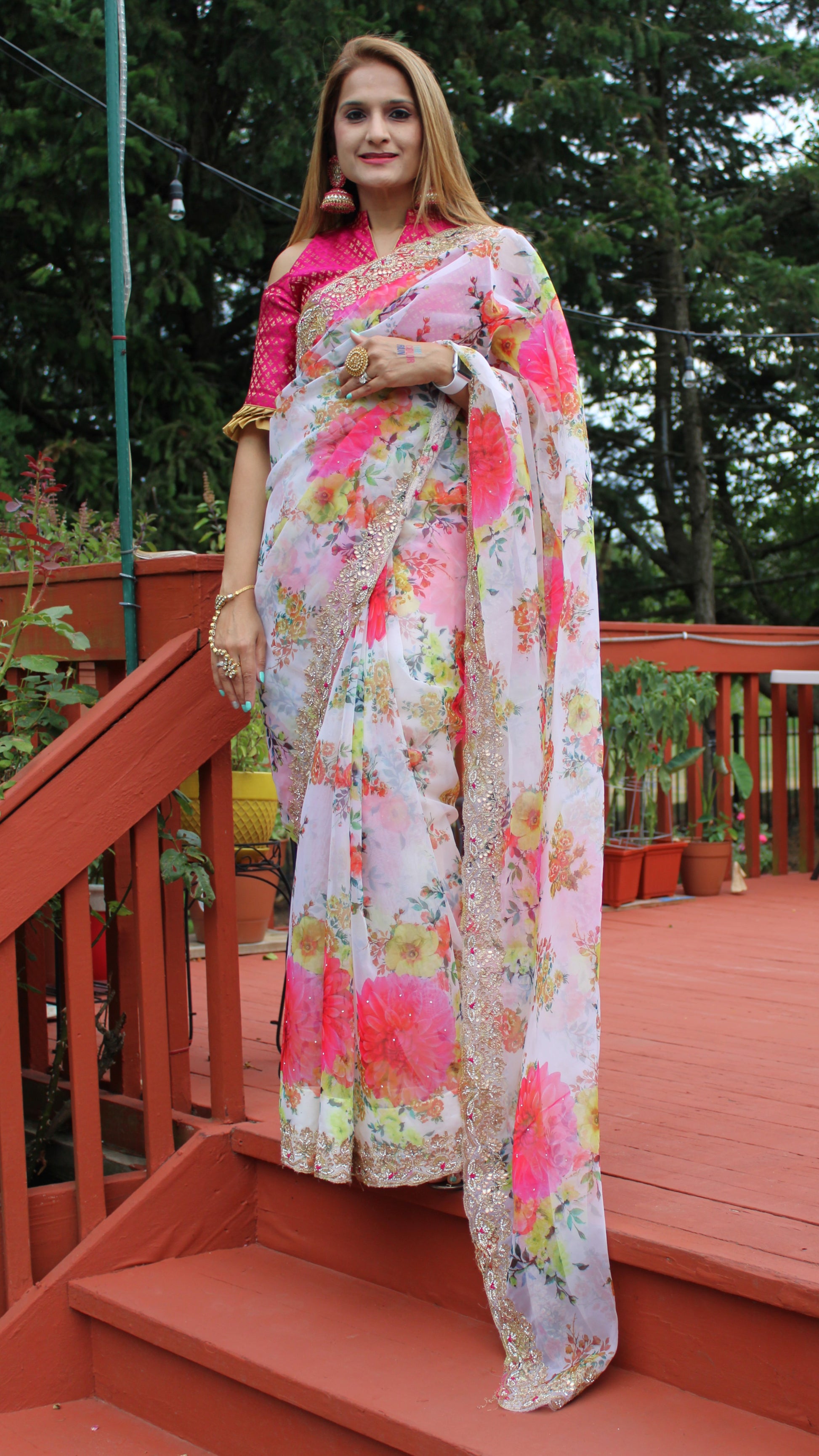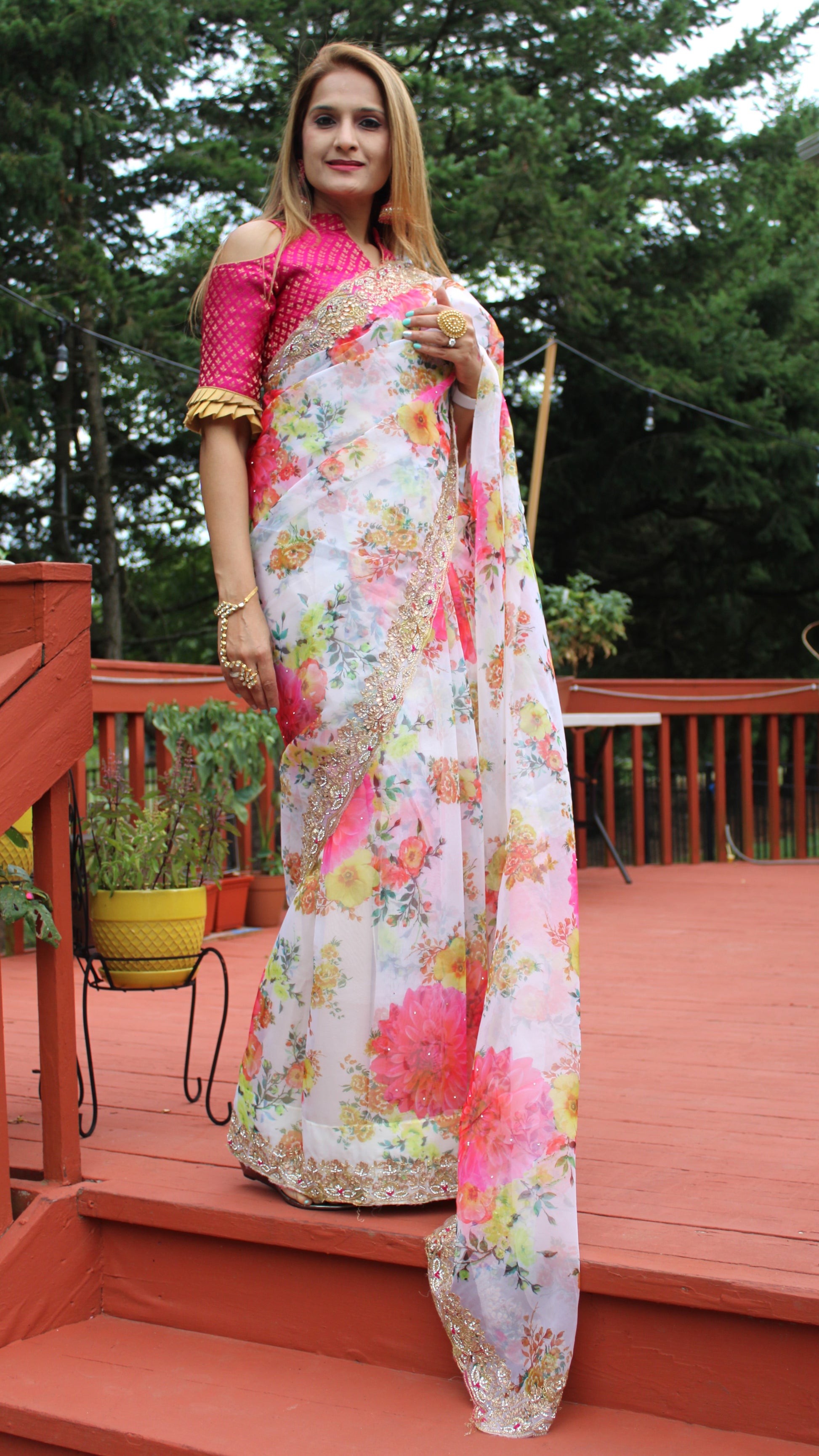 Maharani's pure Organza silk saree is made from Organza silk, a very lightweight and sheer fabric makes it a must have for all elegant wardrobes! Fall and Pico done. A matching stitched petticoat is included. Unstitched blouse piece is included.