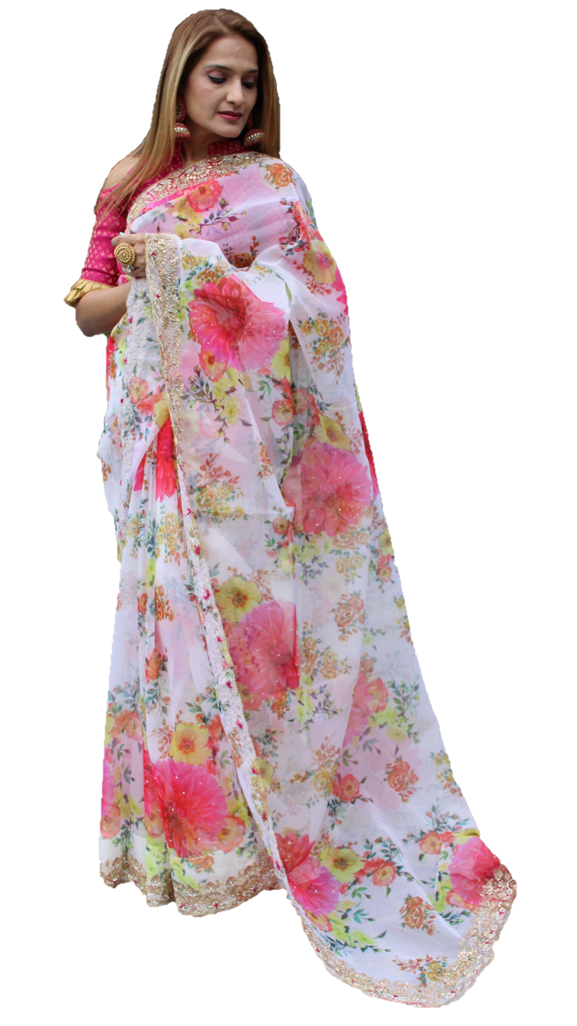 Maharani's Party Wear Organza Silk Saree - Cream Floral (with stitched Petticoat)