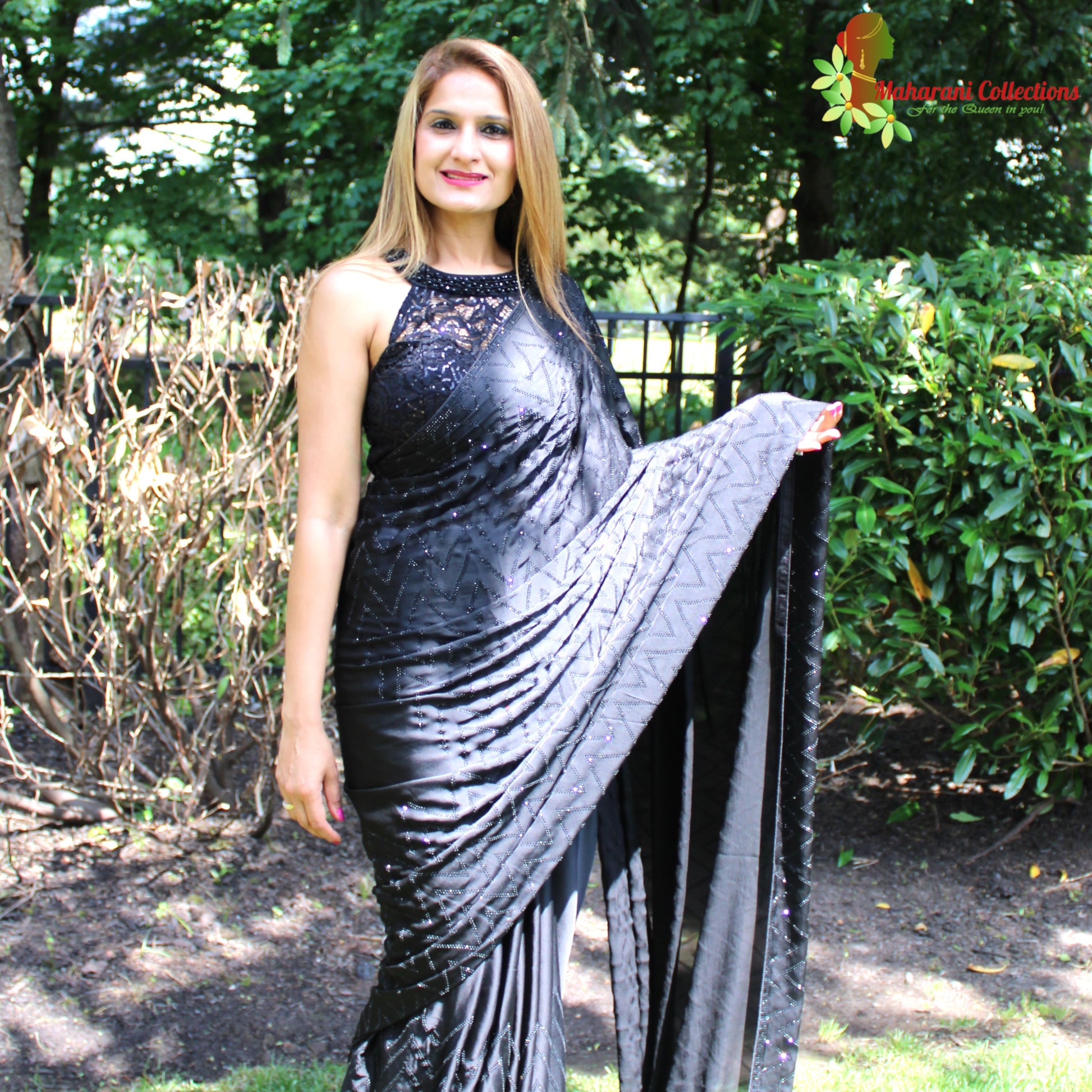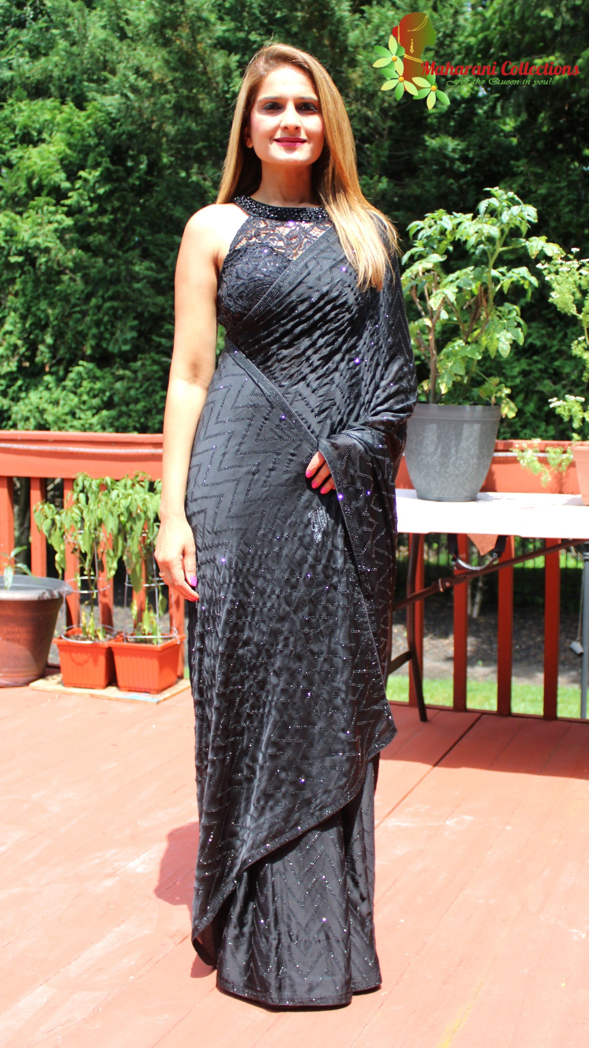 Maharani's Party Wear Silk Sequins Saree - Black (with Stitched Blouse and Petticoat)