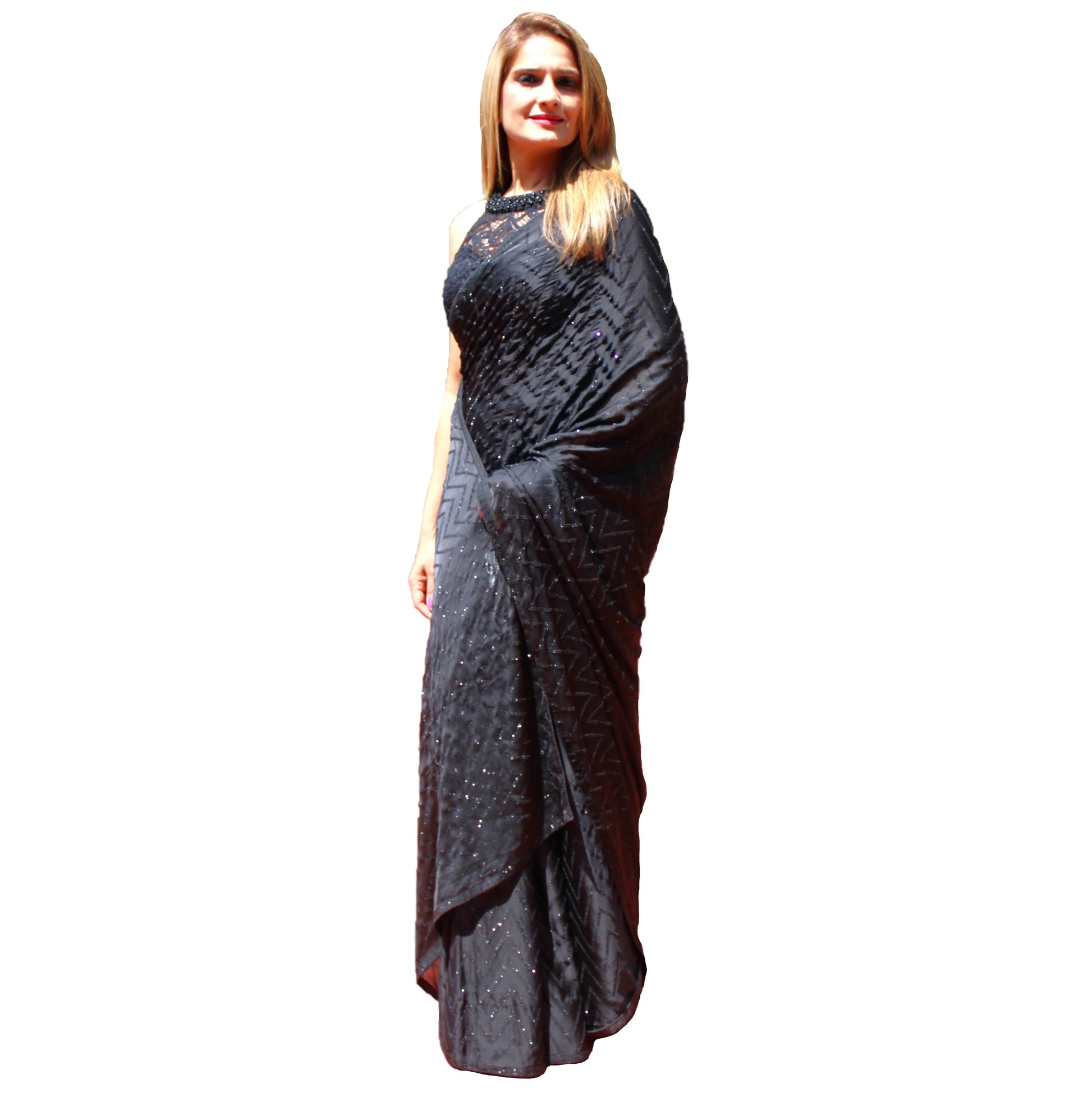 Stunning Black Silk Saree is decorated with all over Sequins work. Comes with free beautifully stitched ready-to-wear sleeveless blouse and the original unstitched blouse piece. Stitched Satin petticoat is also included. Fall and Pico is done, so this beautiful Saree is ready to wear the moment you get it.