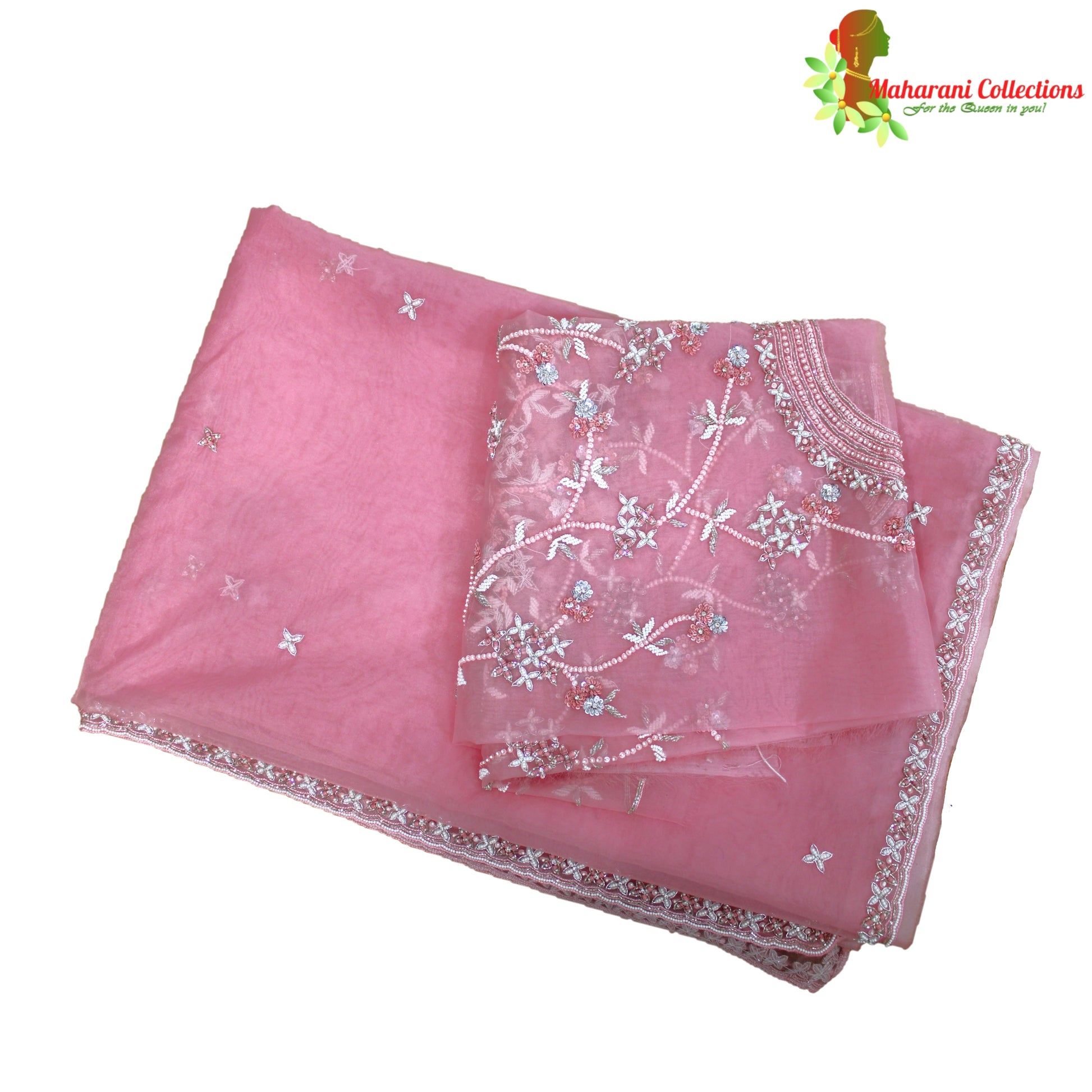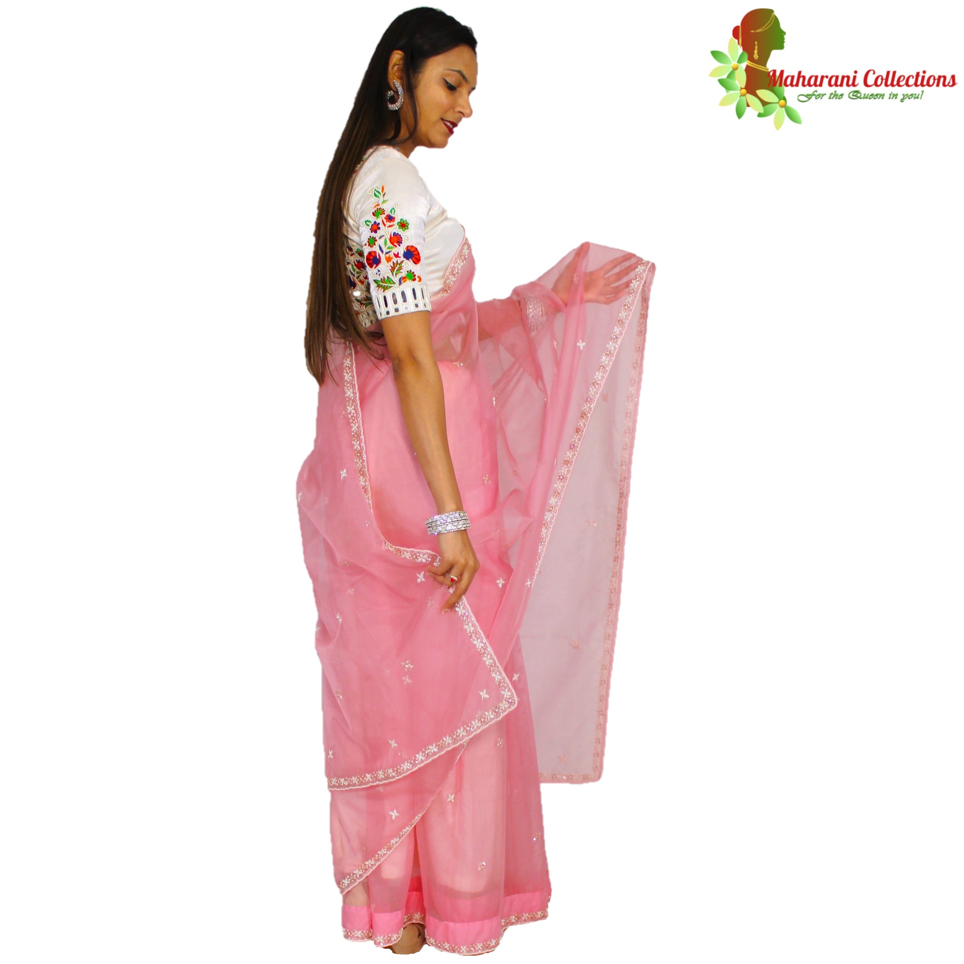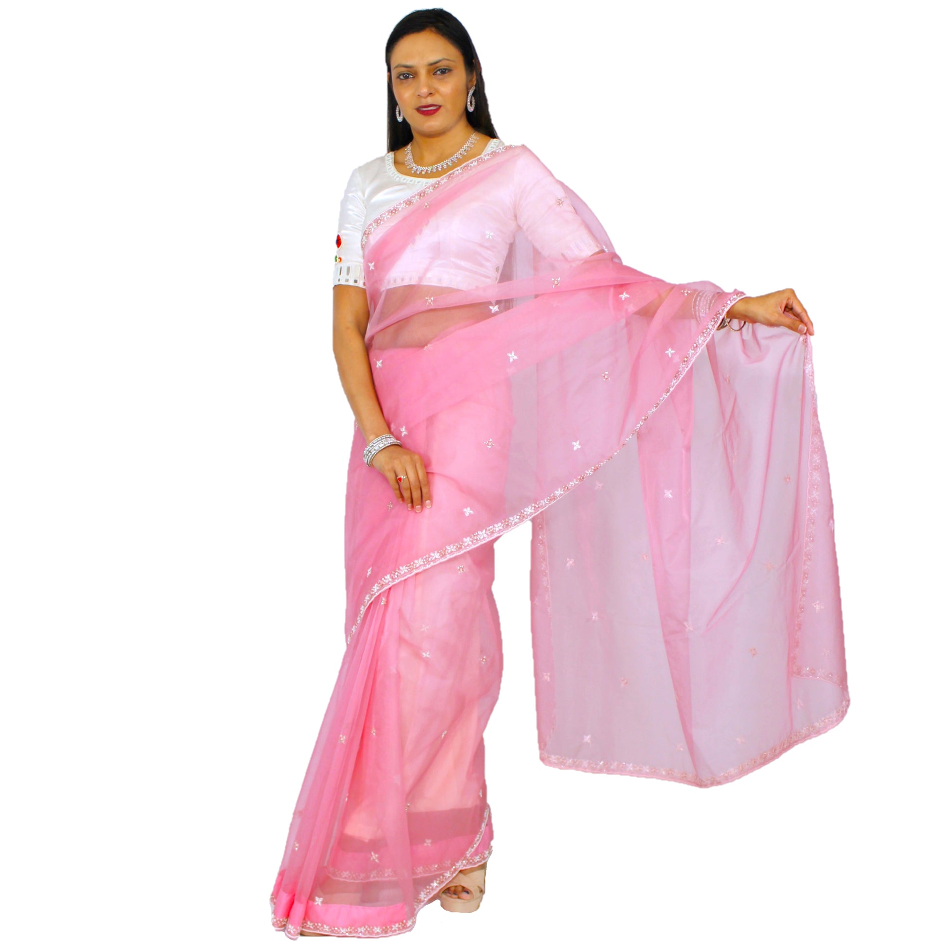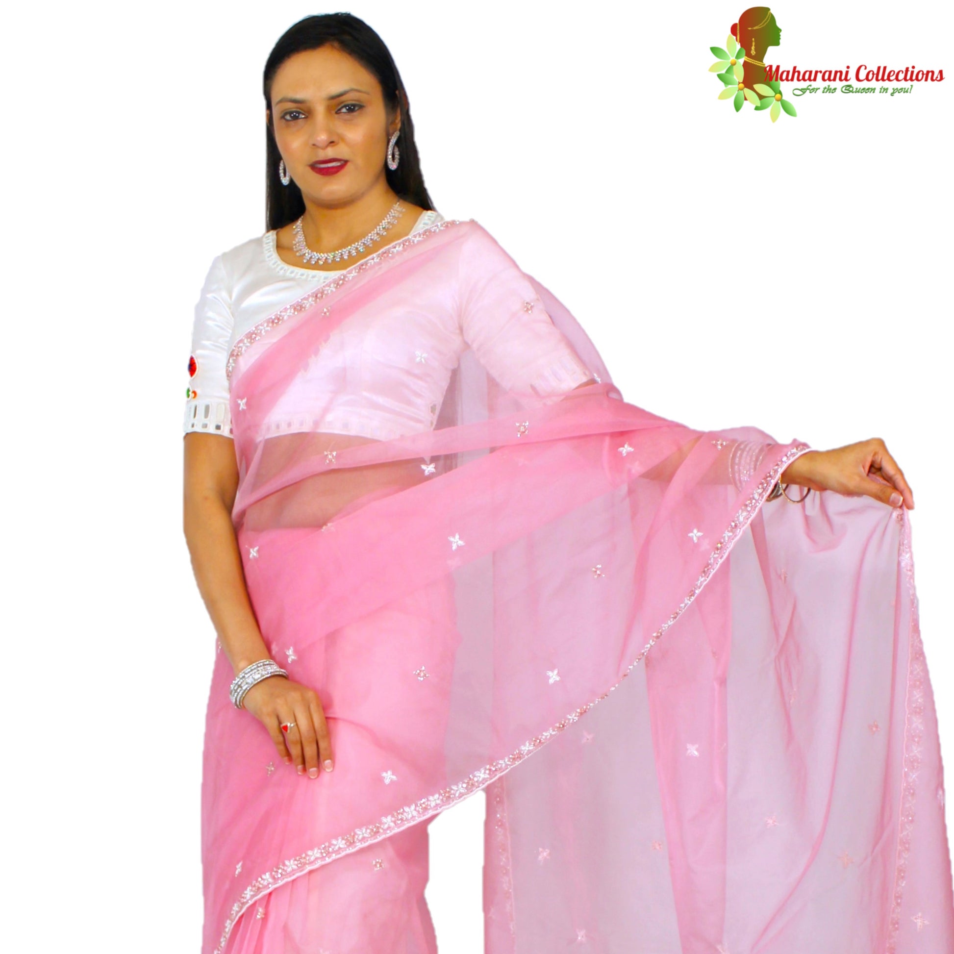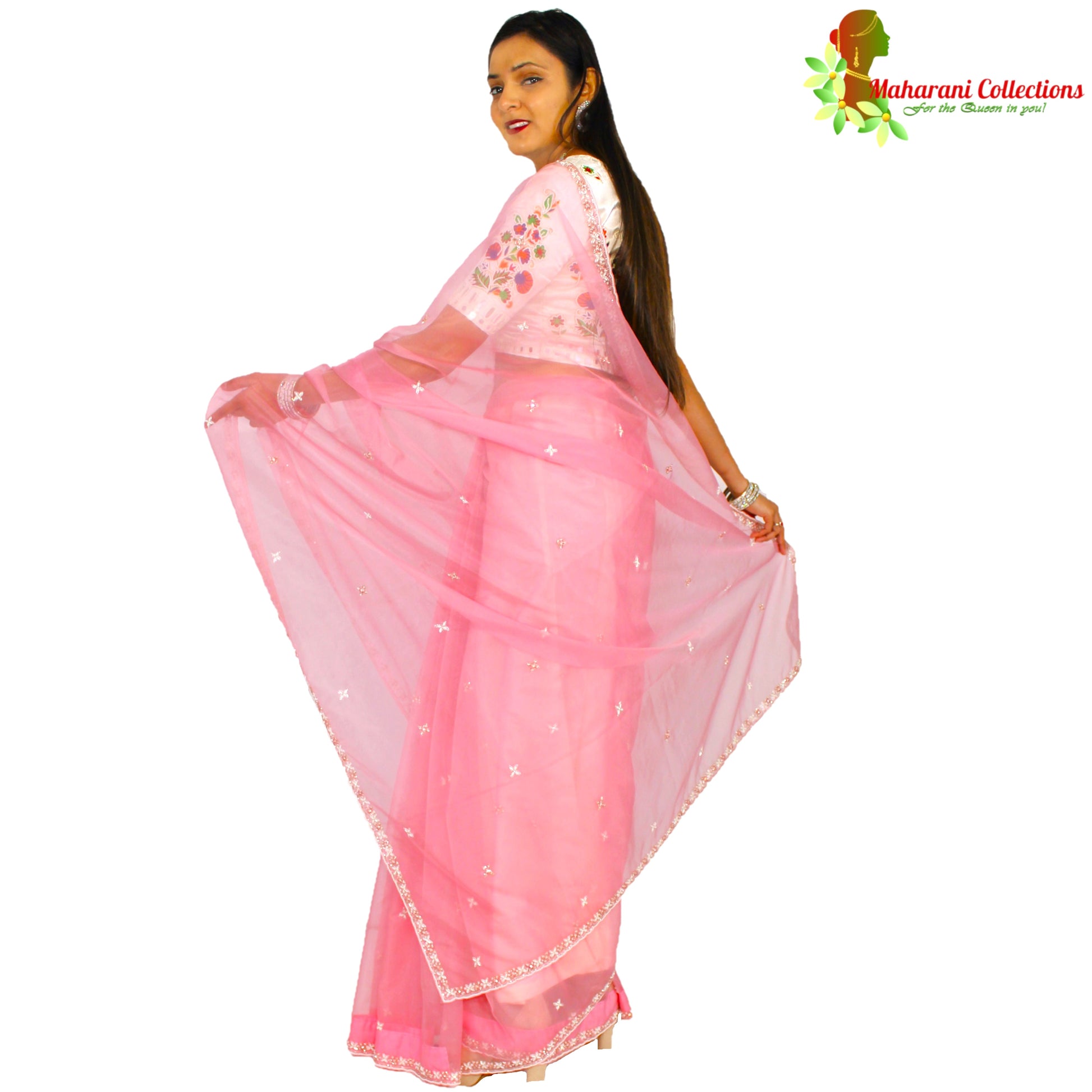 Look captivatingly royal in Maharani Collection's Party Wear Tissue Chiffon Saree! This glittering Peach saree is lovingly hand-crafted with a soft and shiny fabric, embellished with pearls, sequins and glass beads in an all-over floral pattern. Make heads turn at your upcoming special occasion!