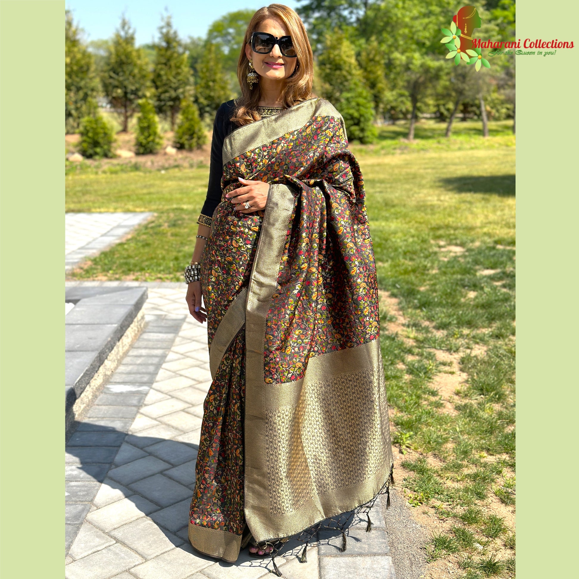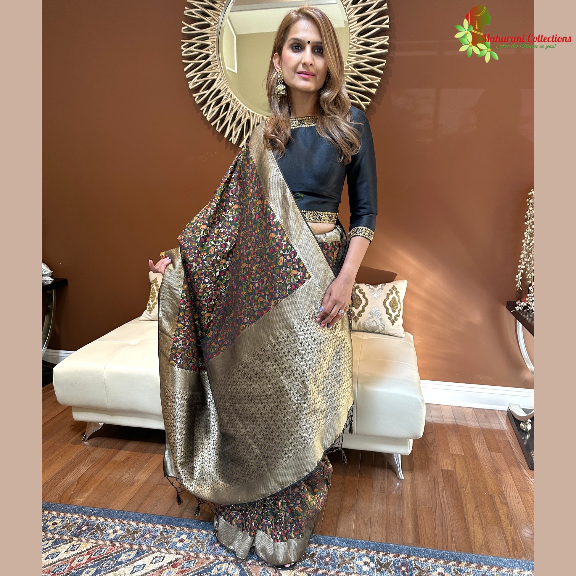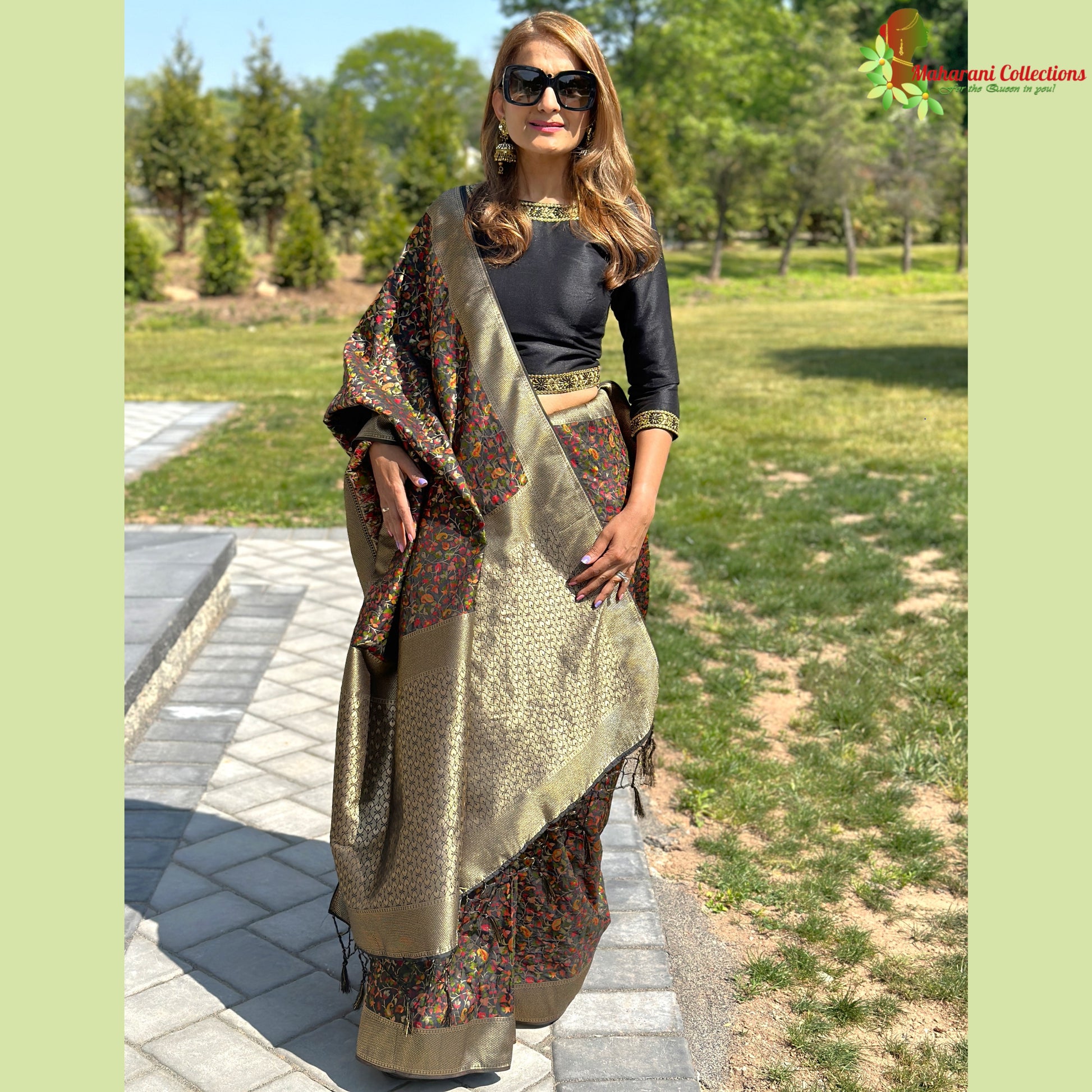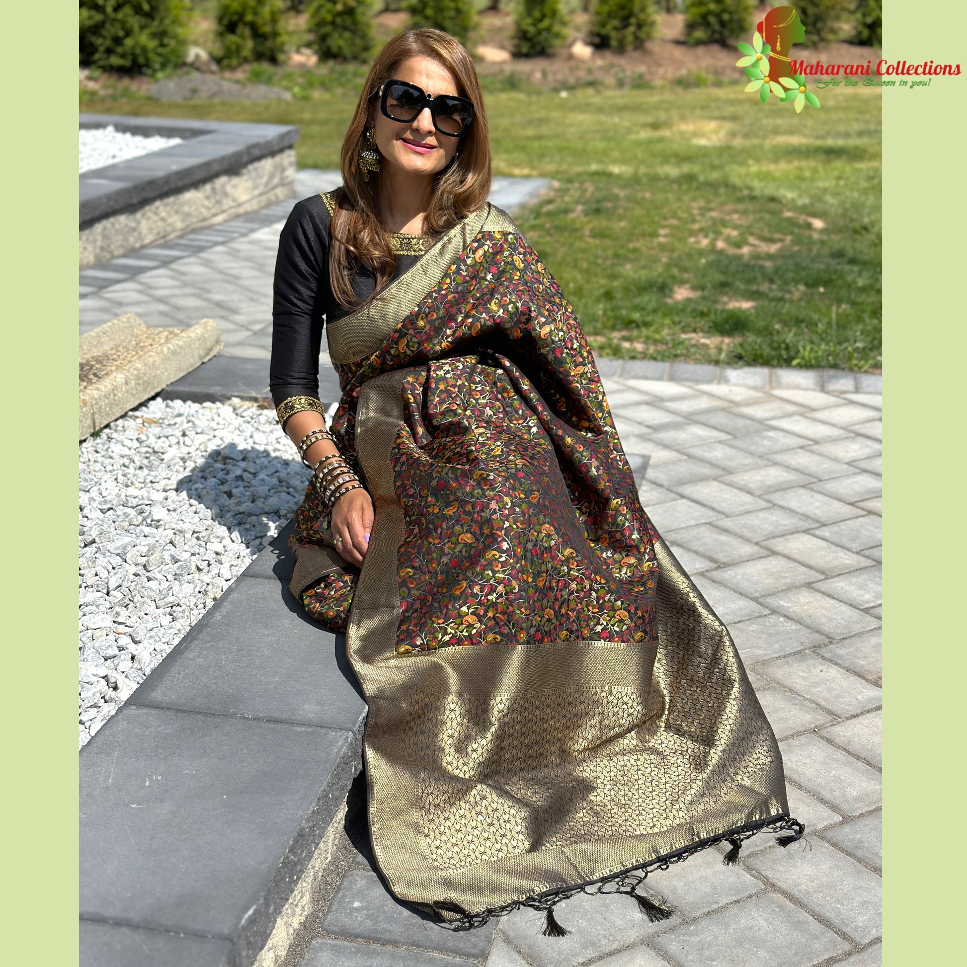 Maharani's Pure Banarasi Jamdani Silk Saree - Black Floral (with stitched blouse and petticoat)