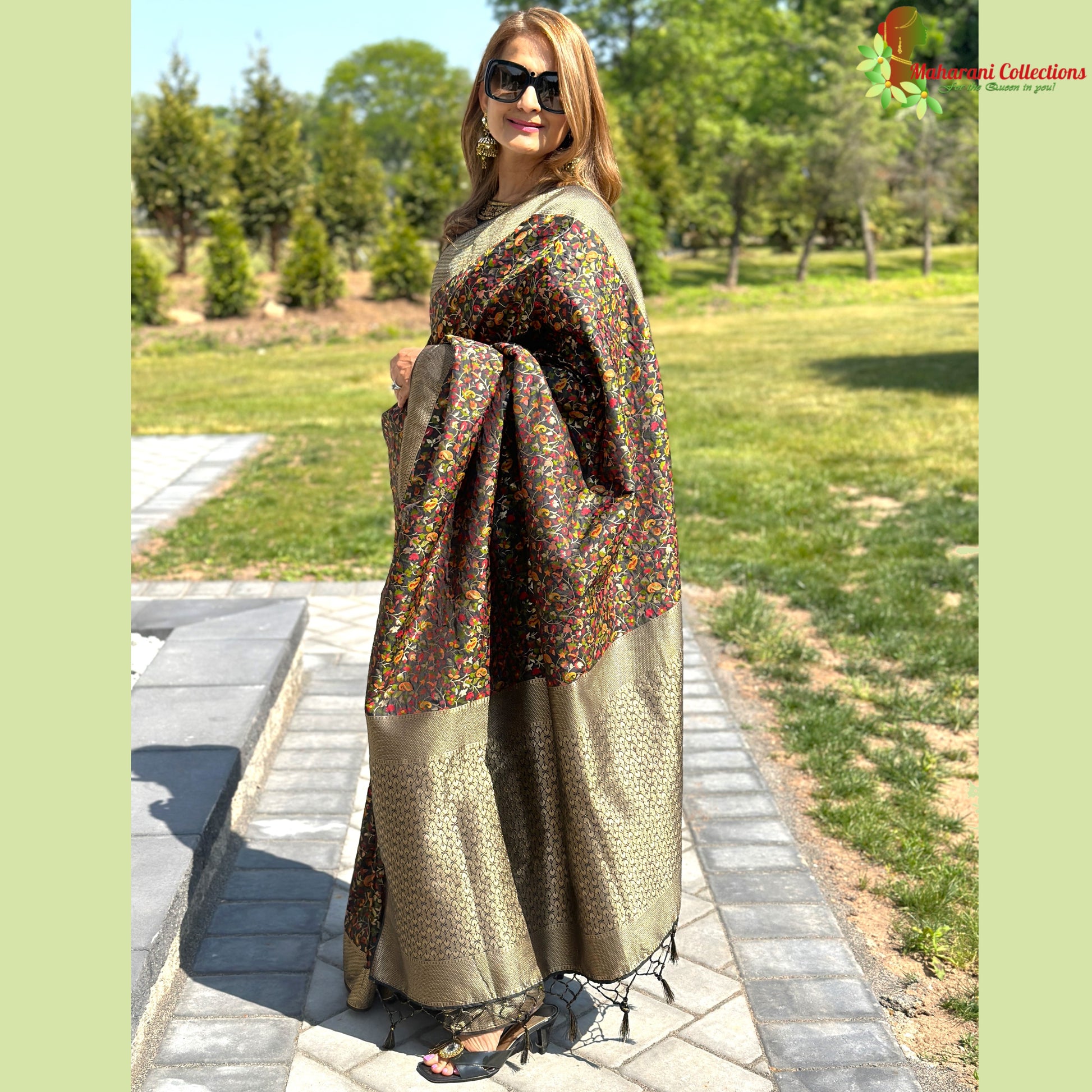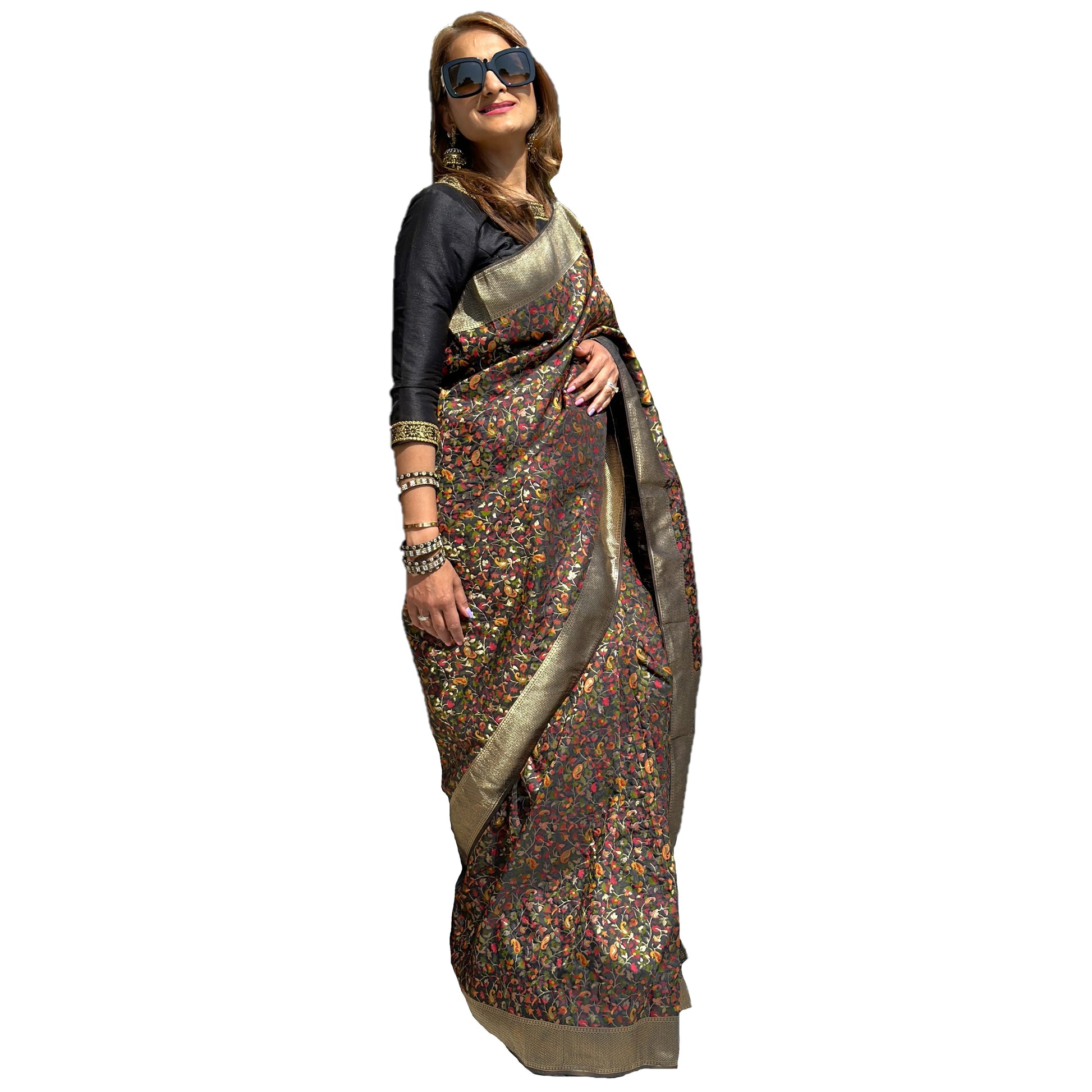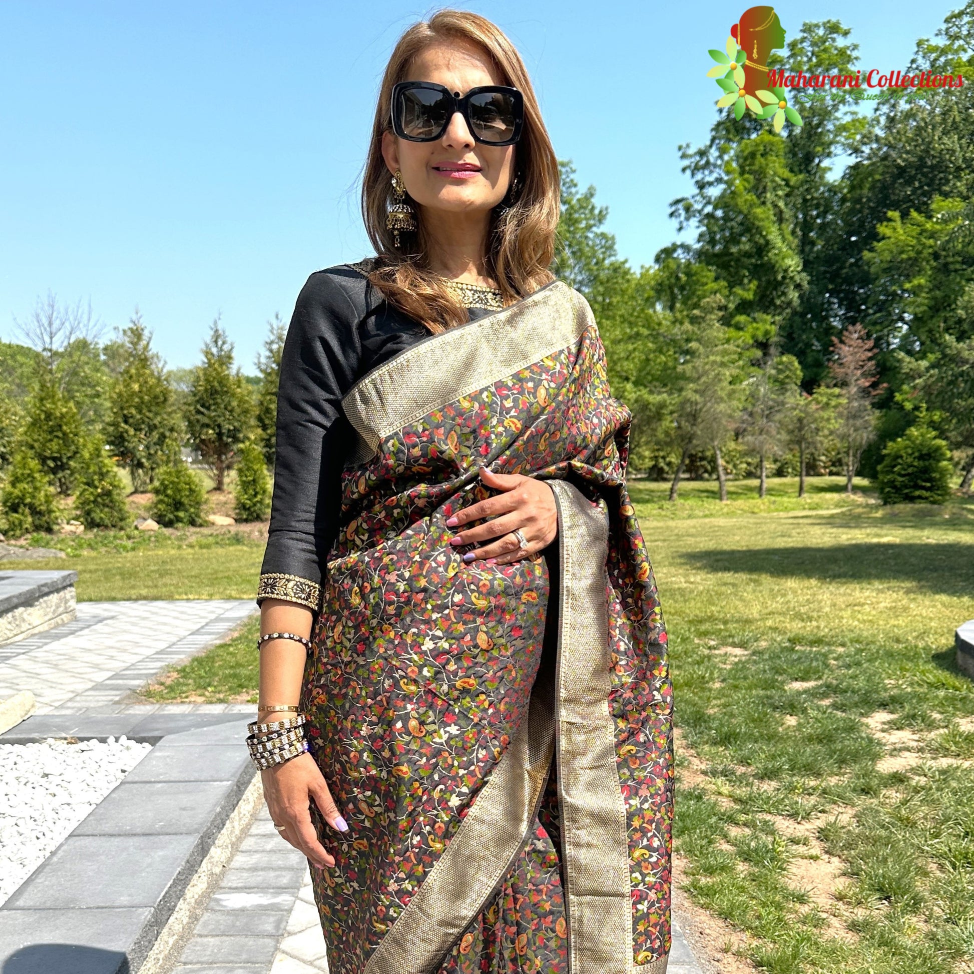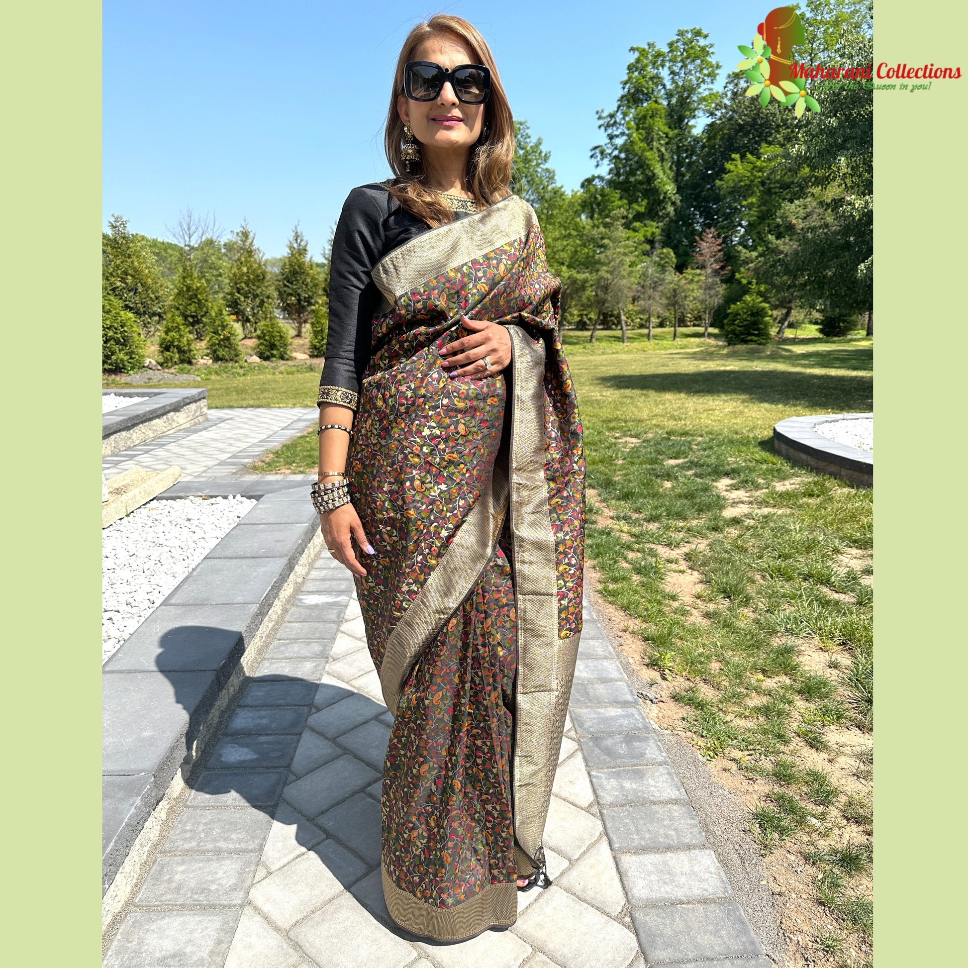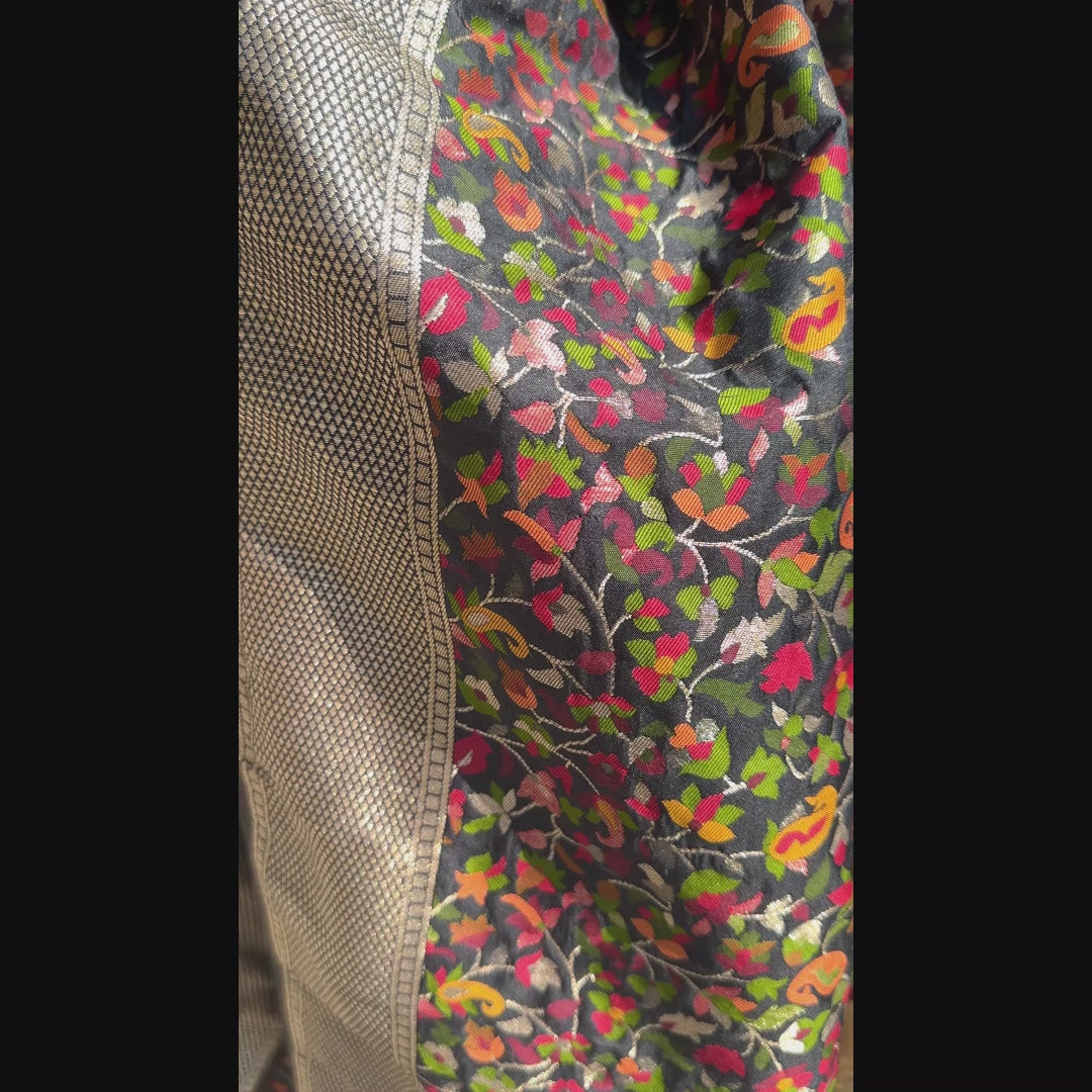 Maharani's Pure Banarasi Jamdani Silk Saree - Black Floral (with stitched blouse and petticoat)