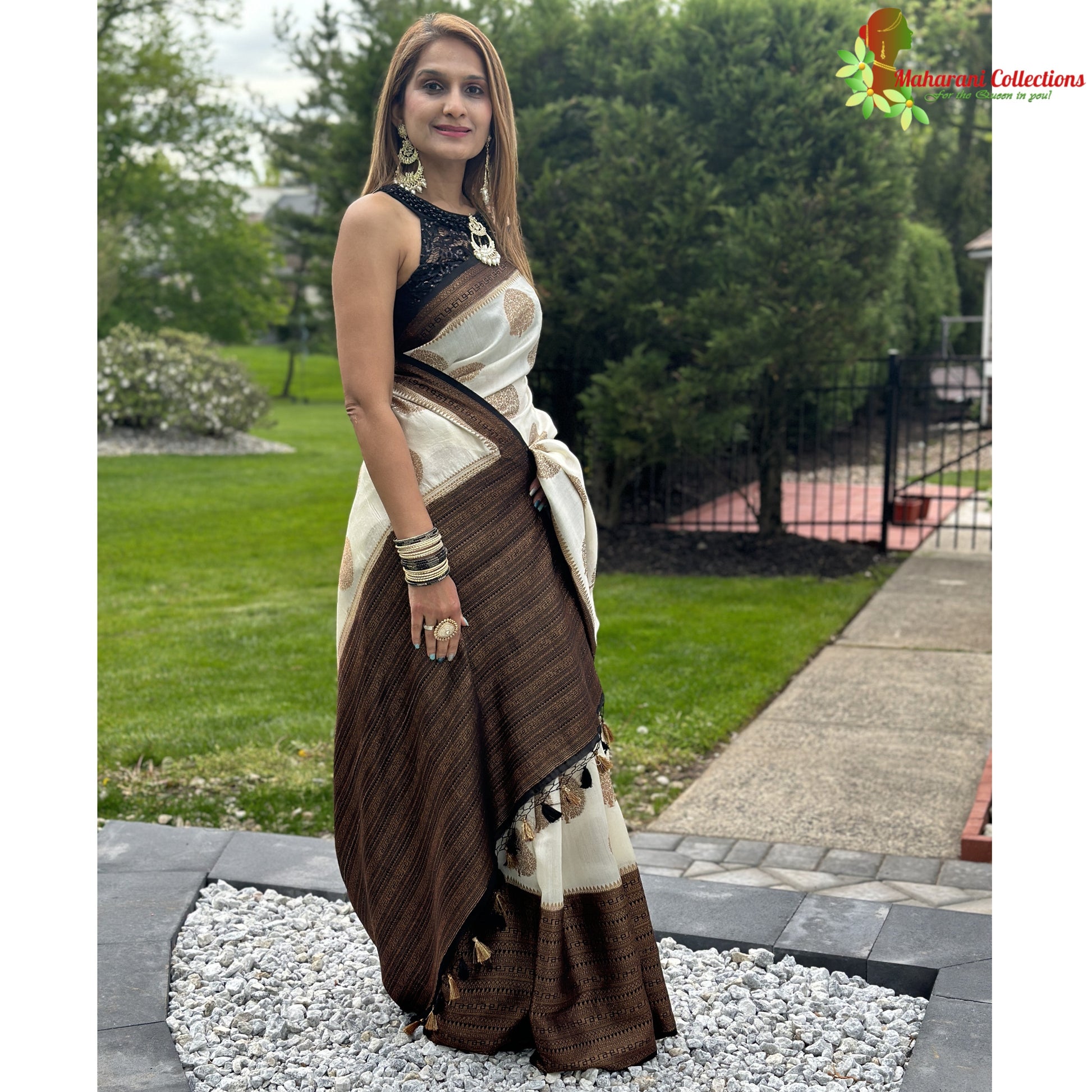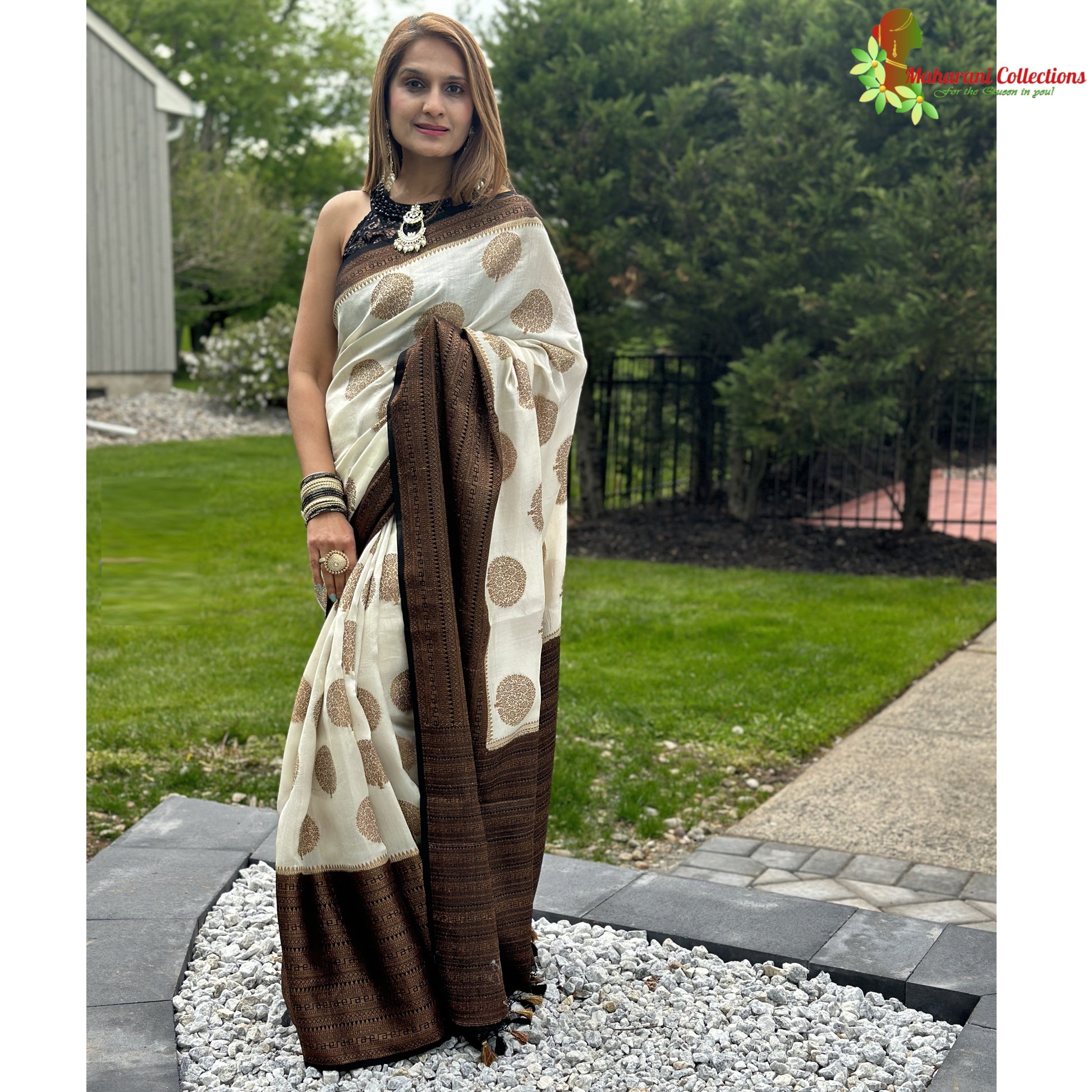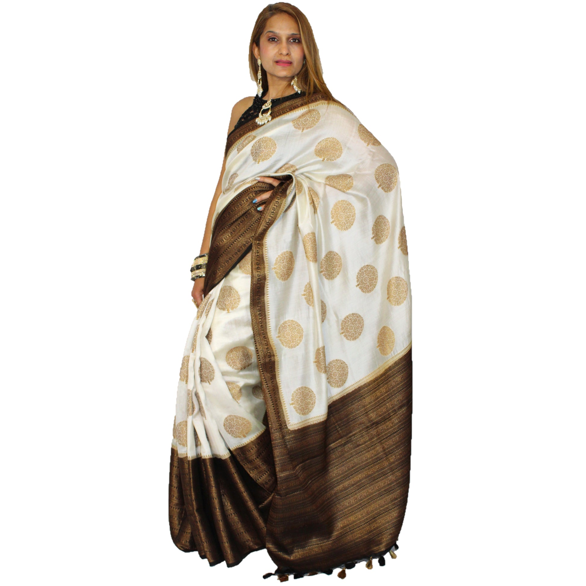 Maharani's Pure Banarasi Silk Saree - Cream (with stitched Blouse and Petticoat)