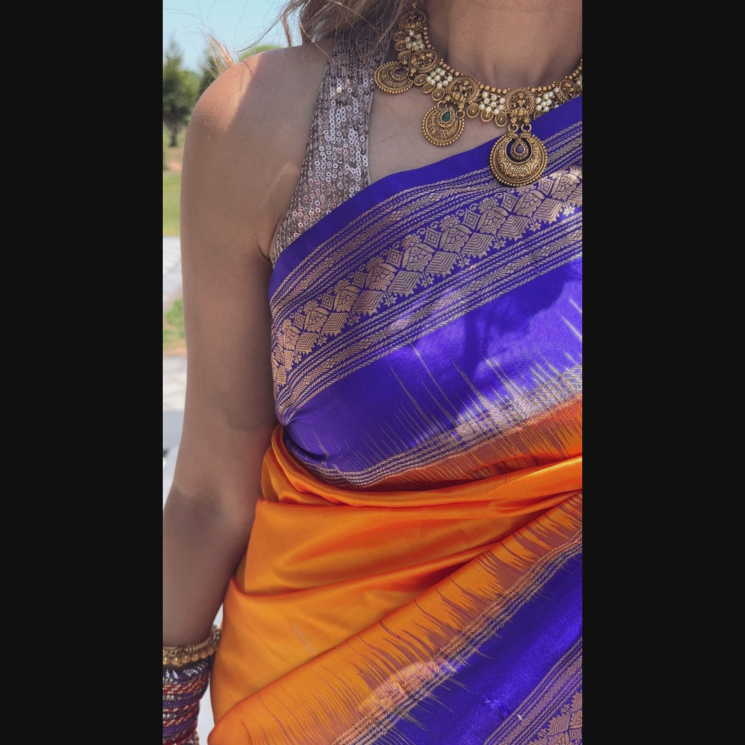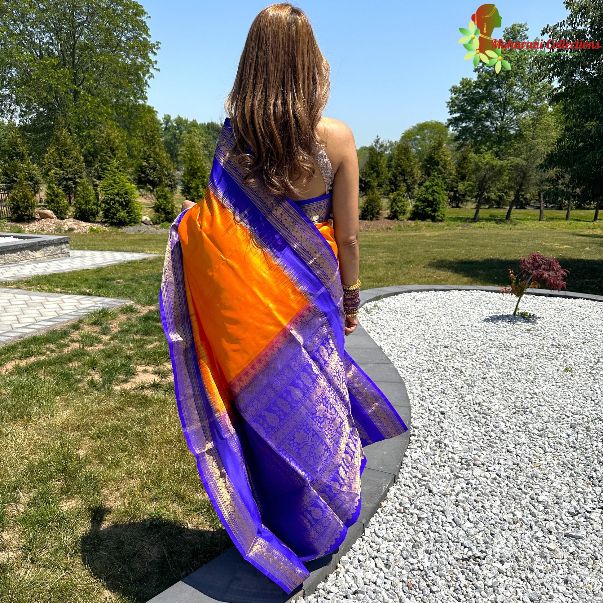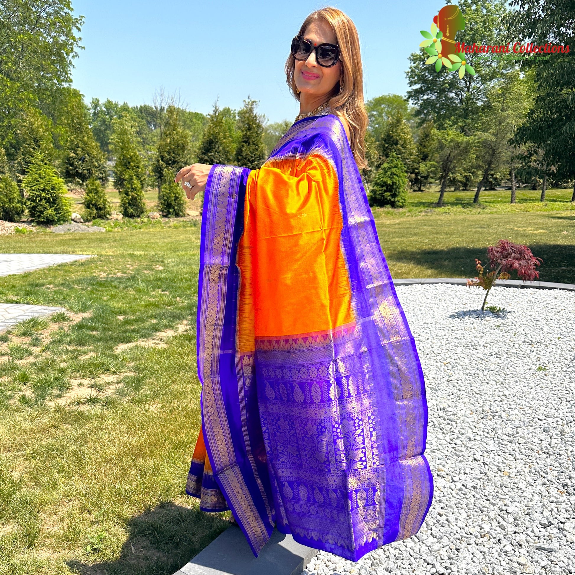 Maharani's Pure Banarasi Silk Saree - Yellow/Orange (with stitched Petticoat)