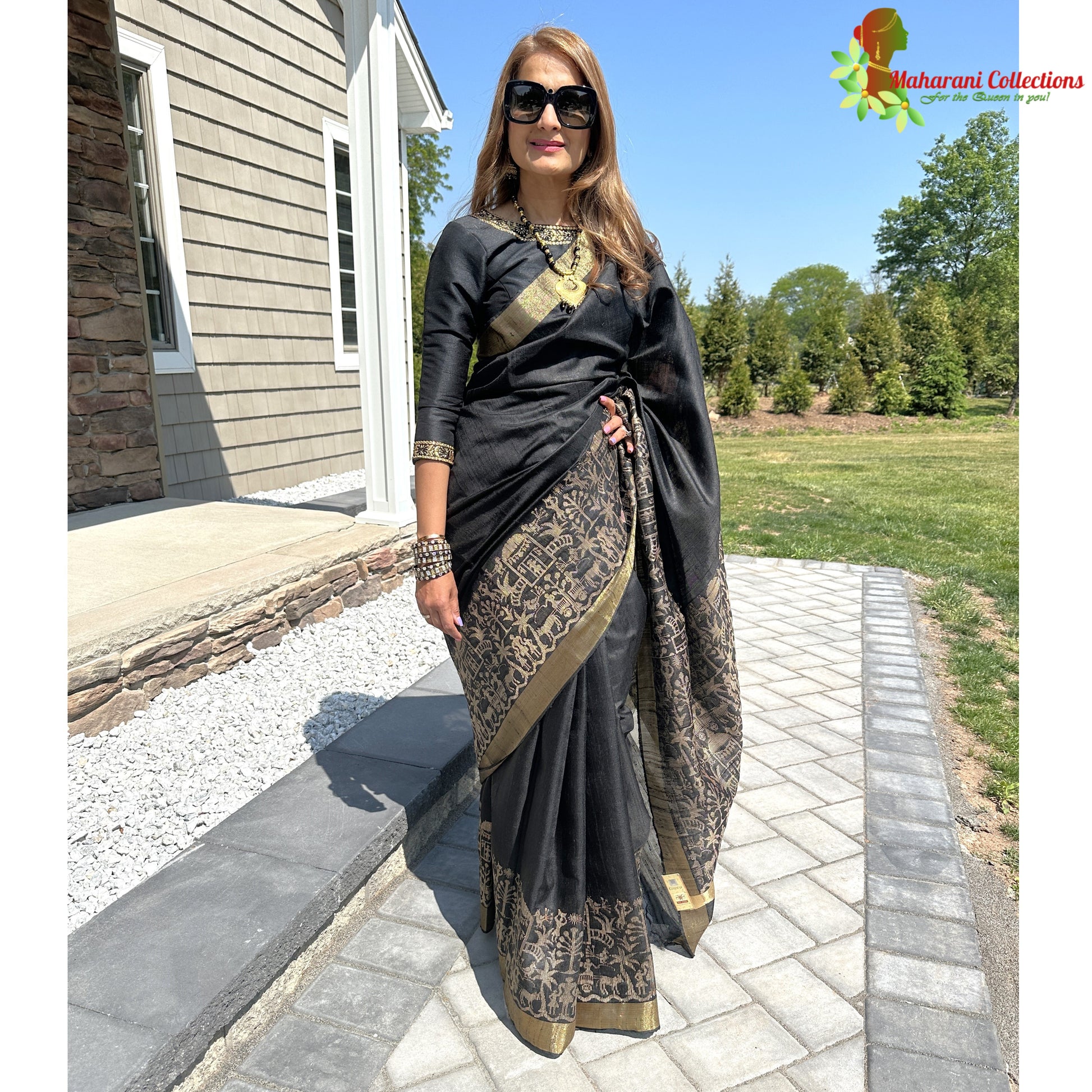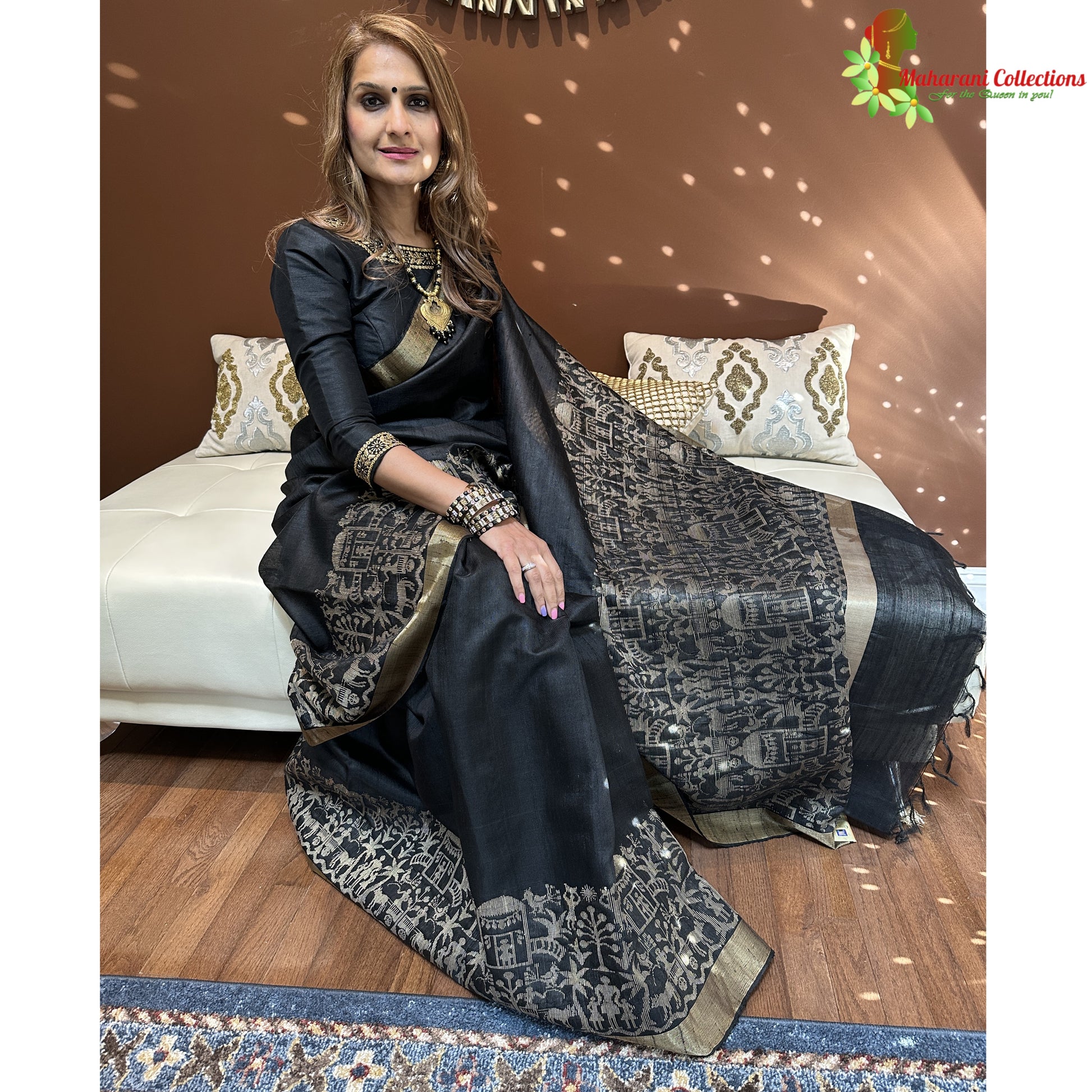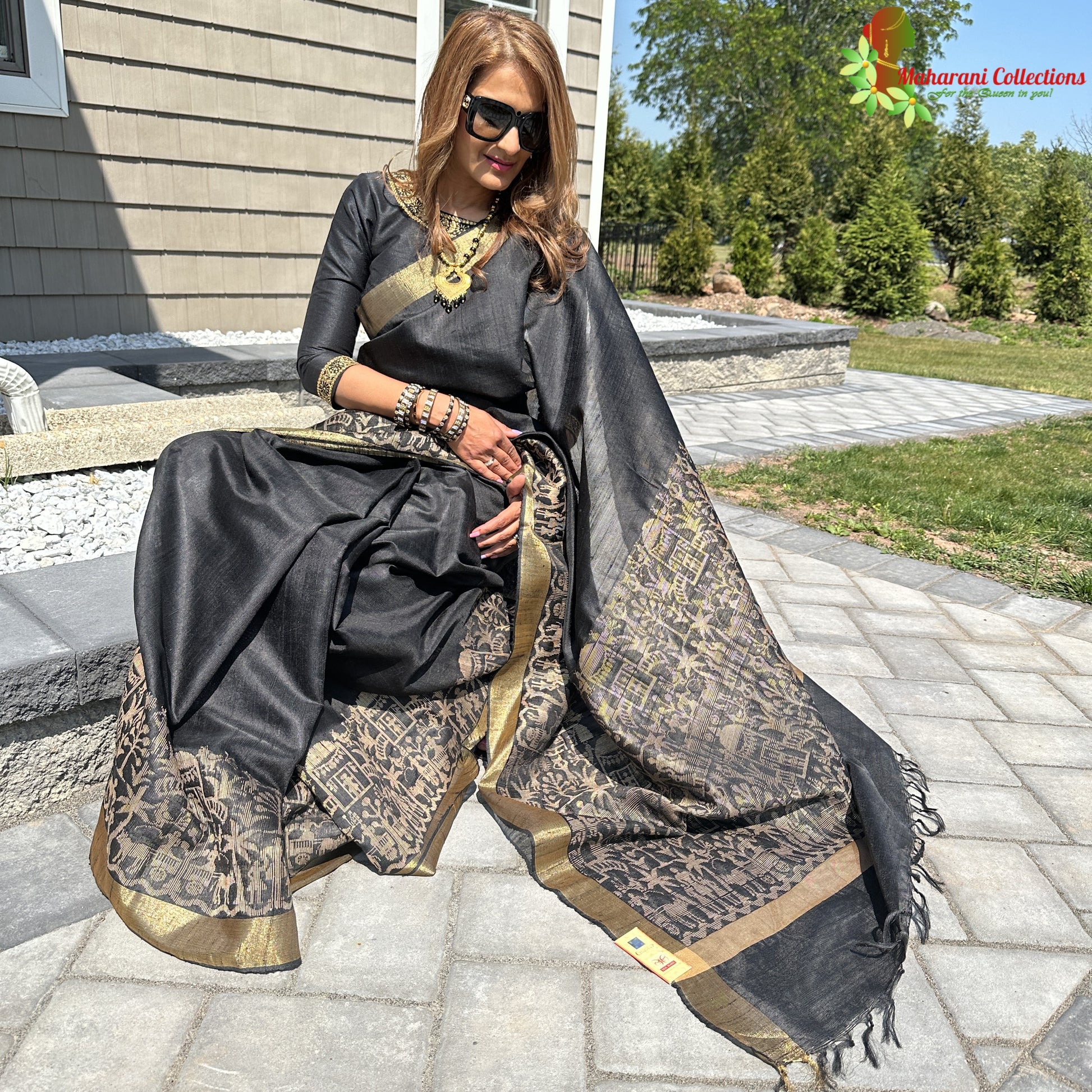 Maharani's Pure Tussar Silk Saree (Silk Mark) - Black (with Stitched Blouse & Petticoat)