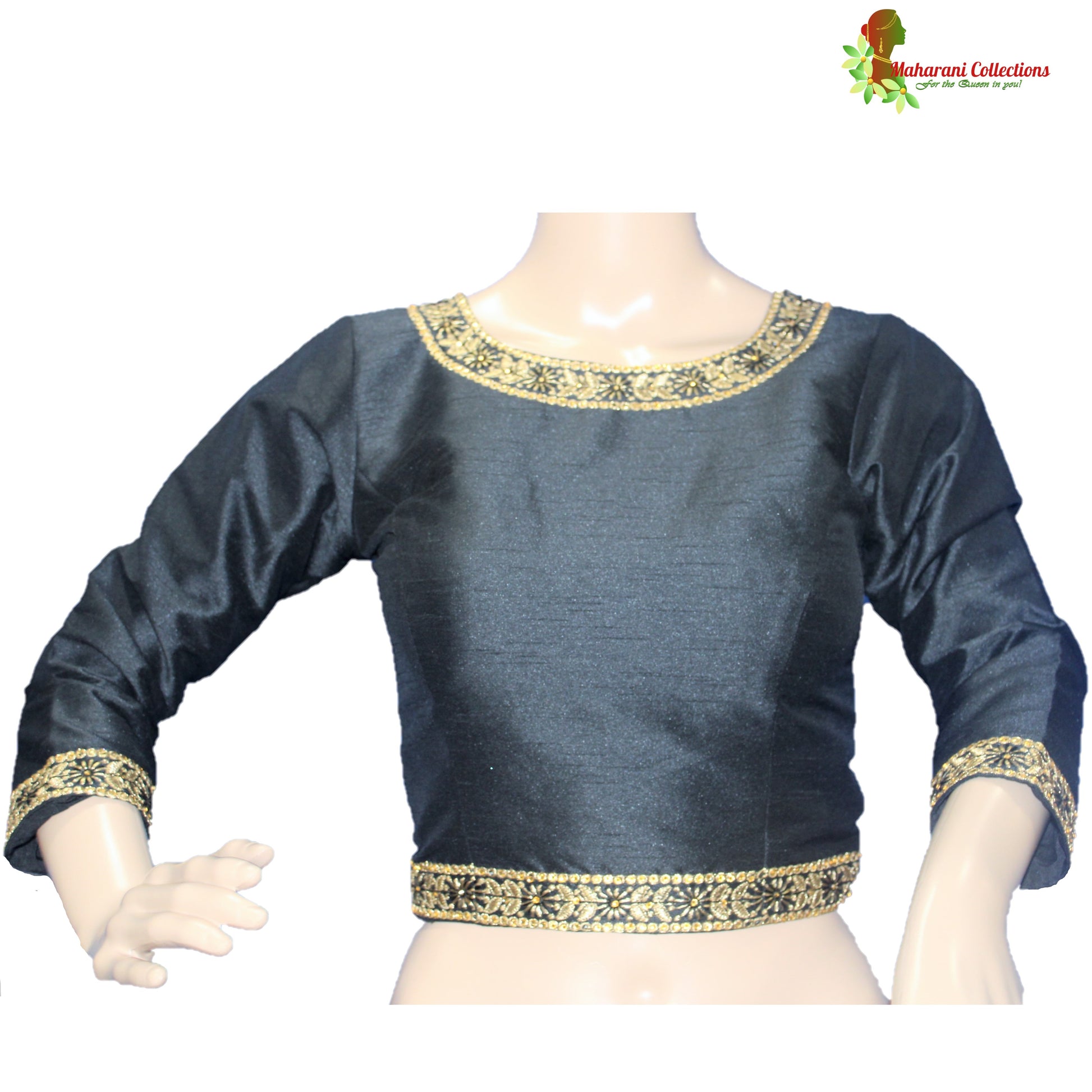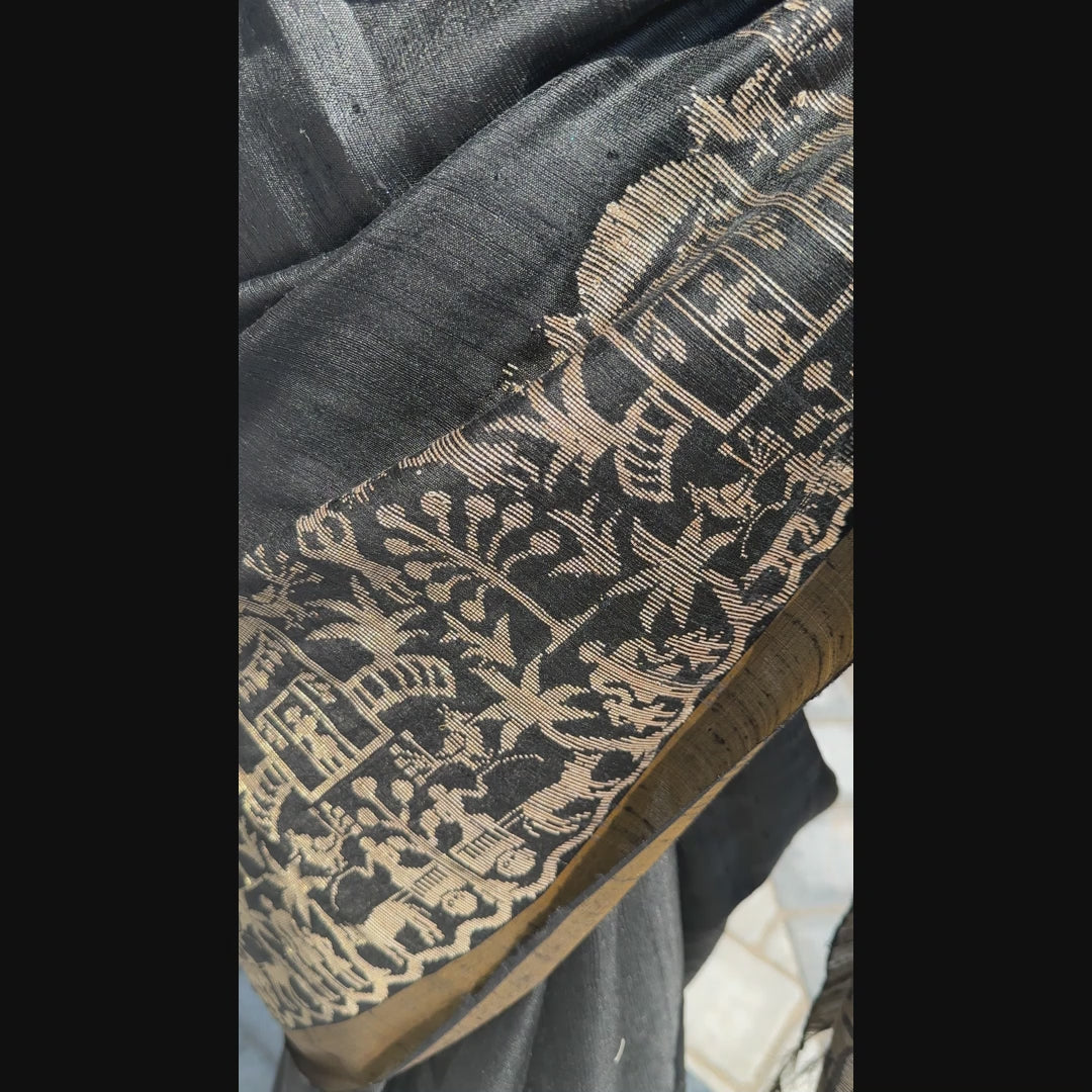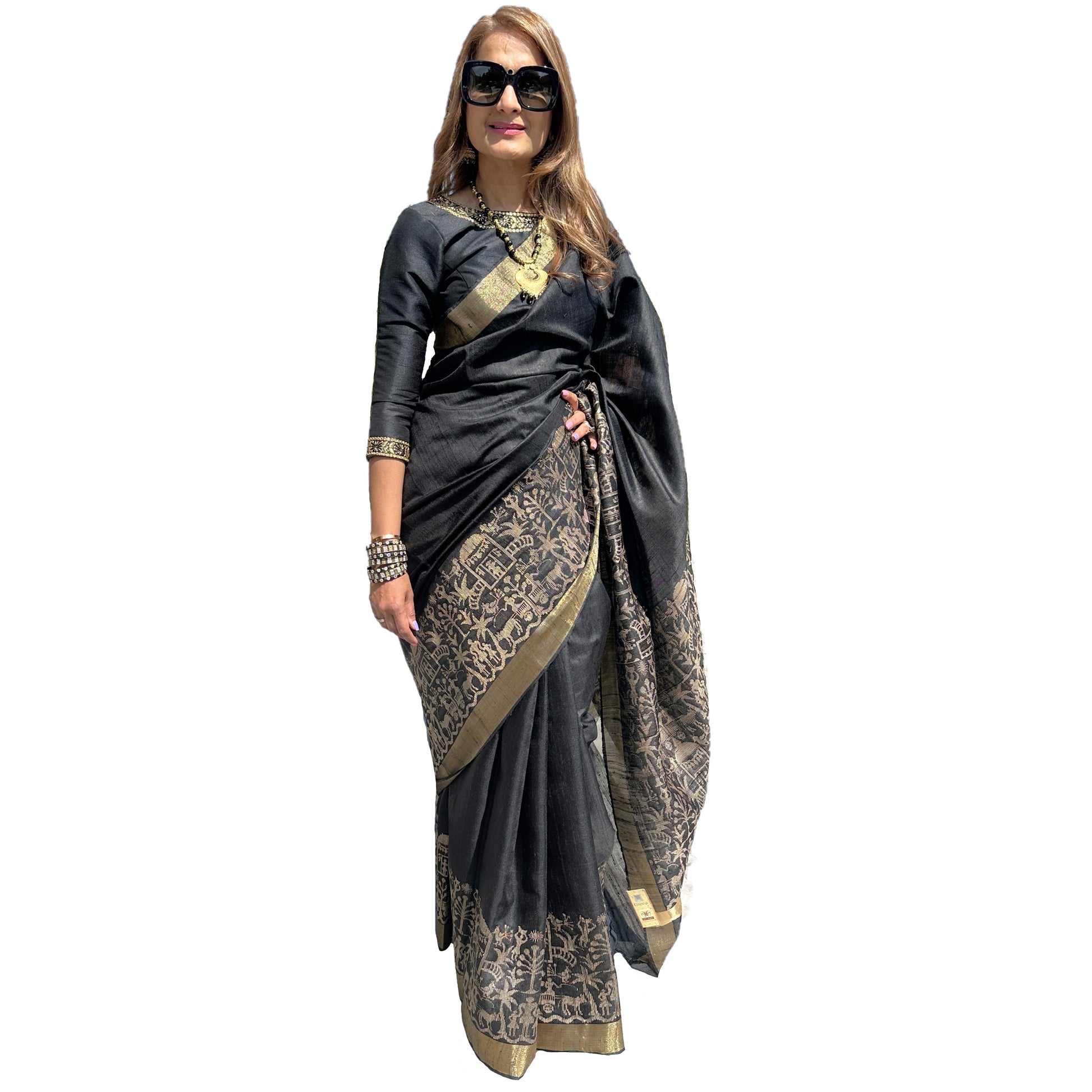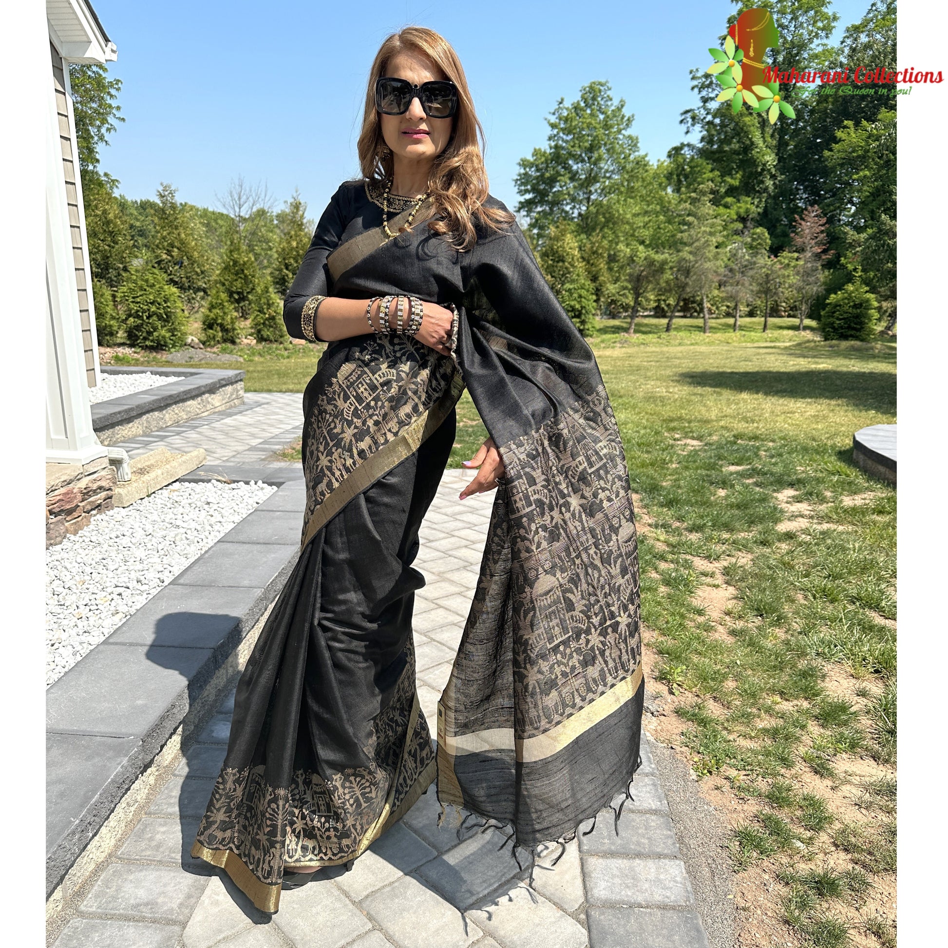Maharani's Pure Tussar Silk Saree (Silk Mark) - Black (with Stitched Blouse & Petticoat)