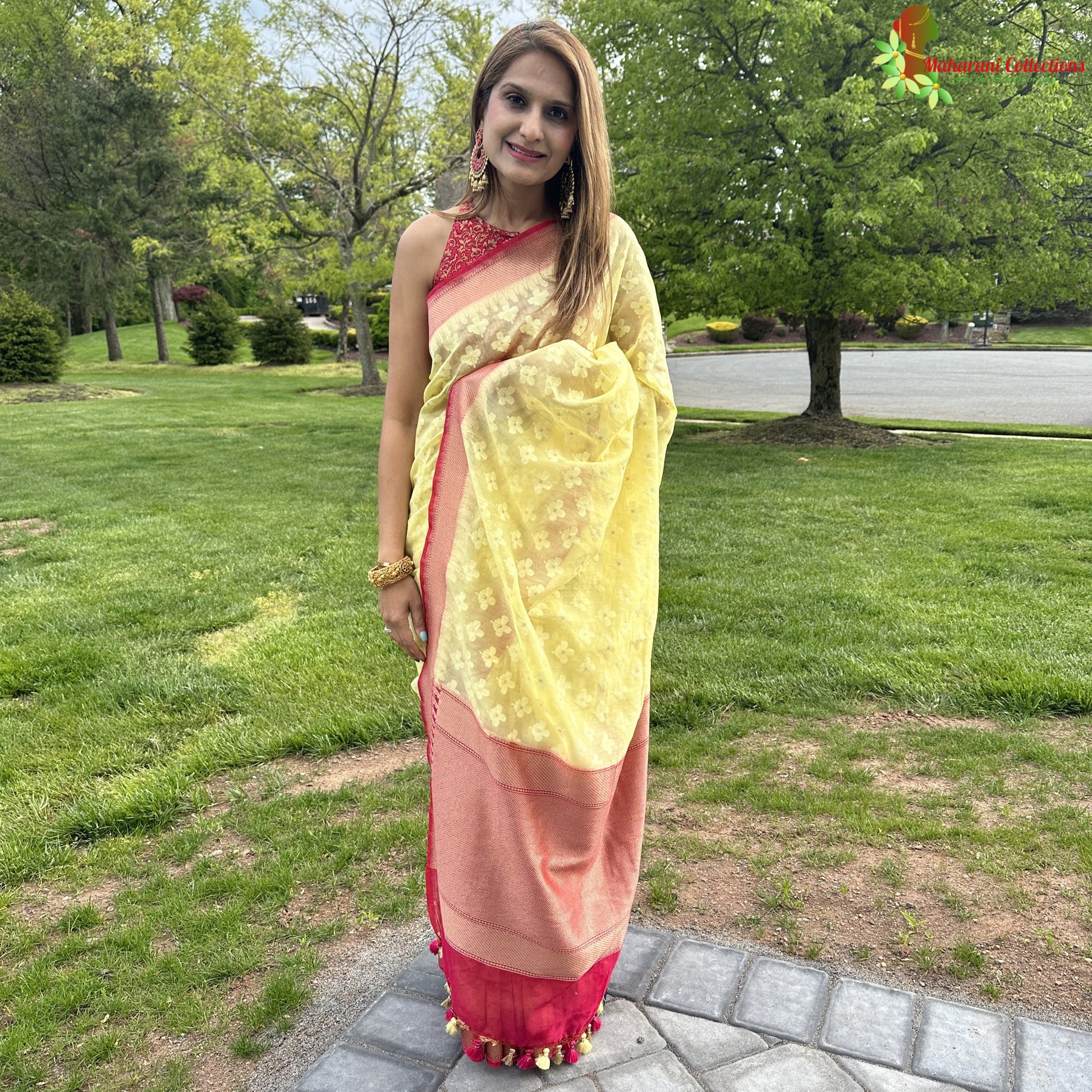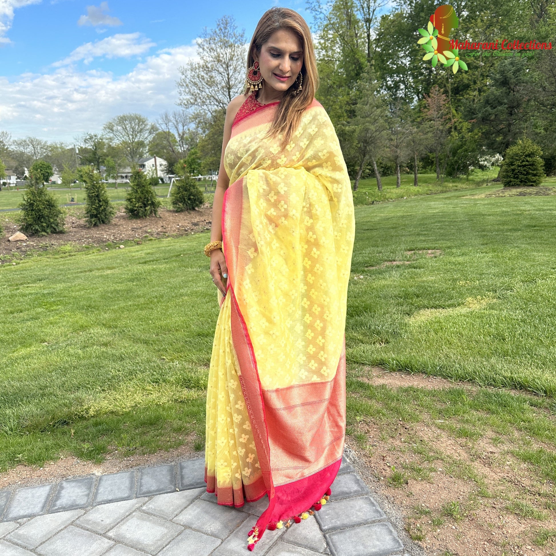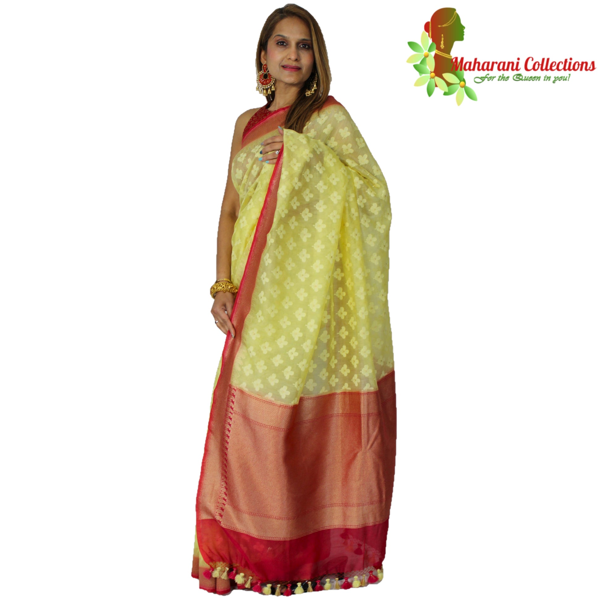 Maharani's Pure Tussar Silk Saree - Lemon Yellow with Golden Zari and Boota Work