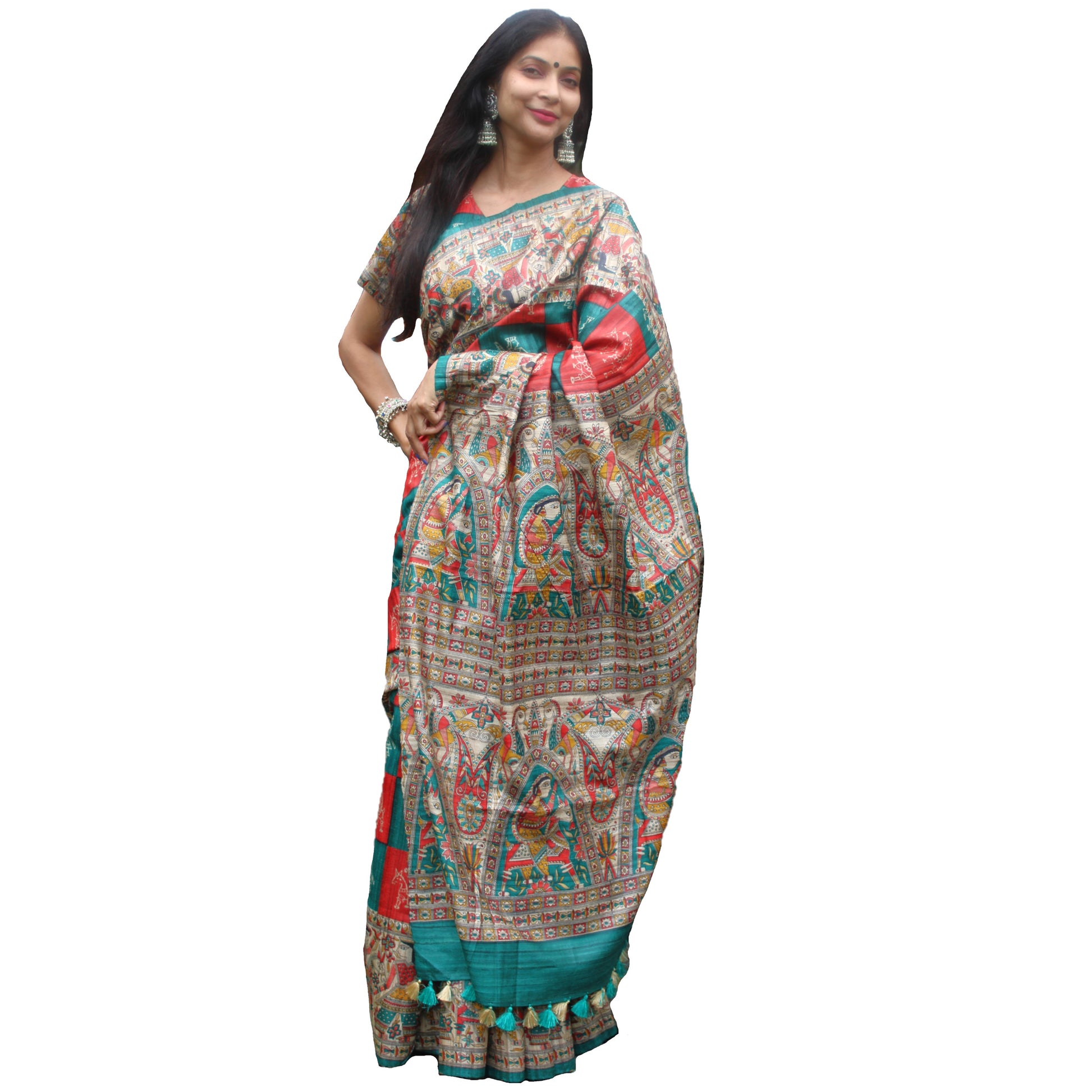 - Saree: Color - Red & Sea Green, Material - Pure Tussar Silk, Work - Details Madhubani Hand-print work
