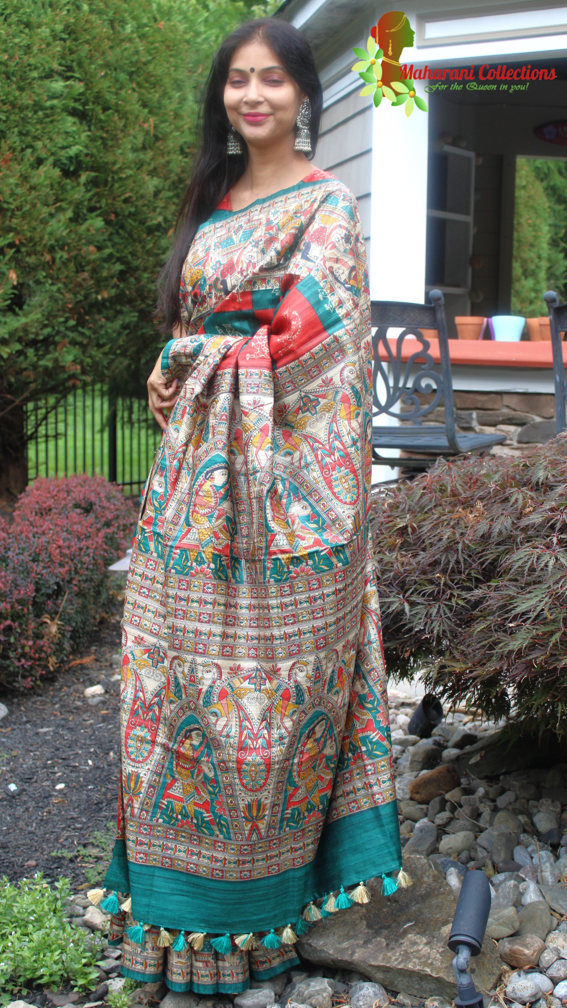 Maharani's Pure Tussar Silk Saree (Silk Mark) - Red & Sea Green with Madhubani Hand Painting