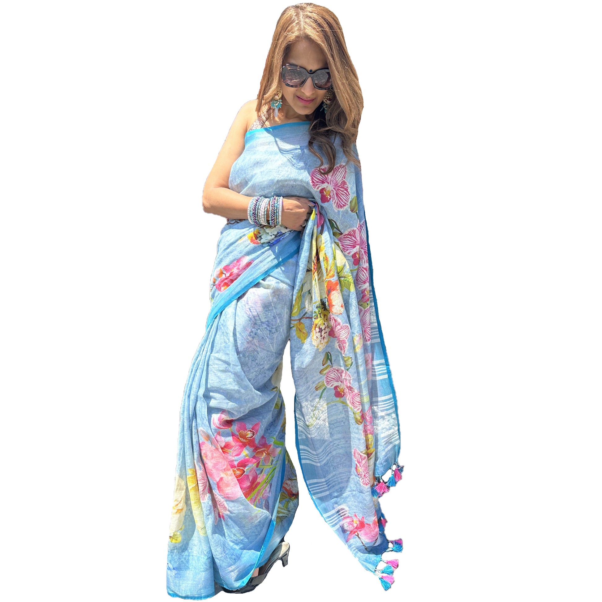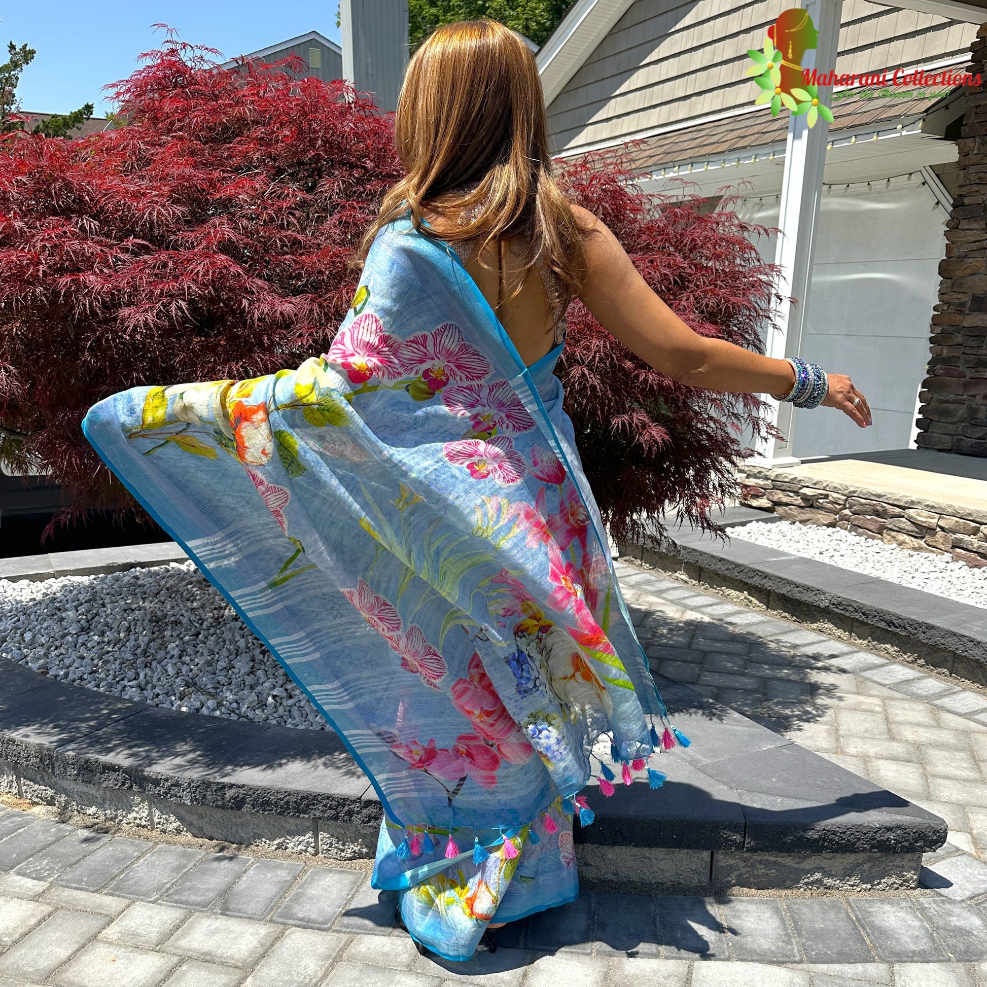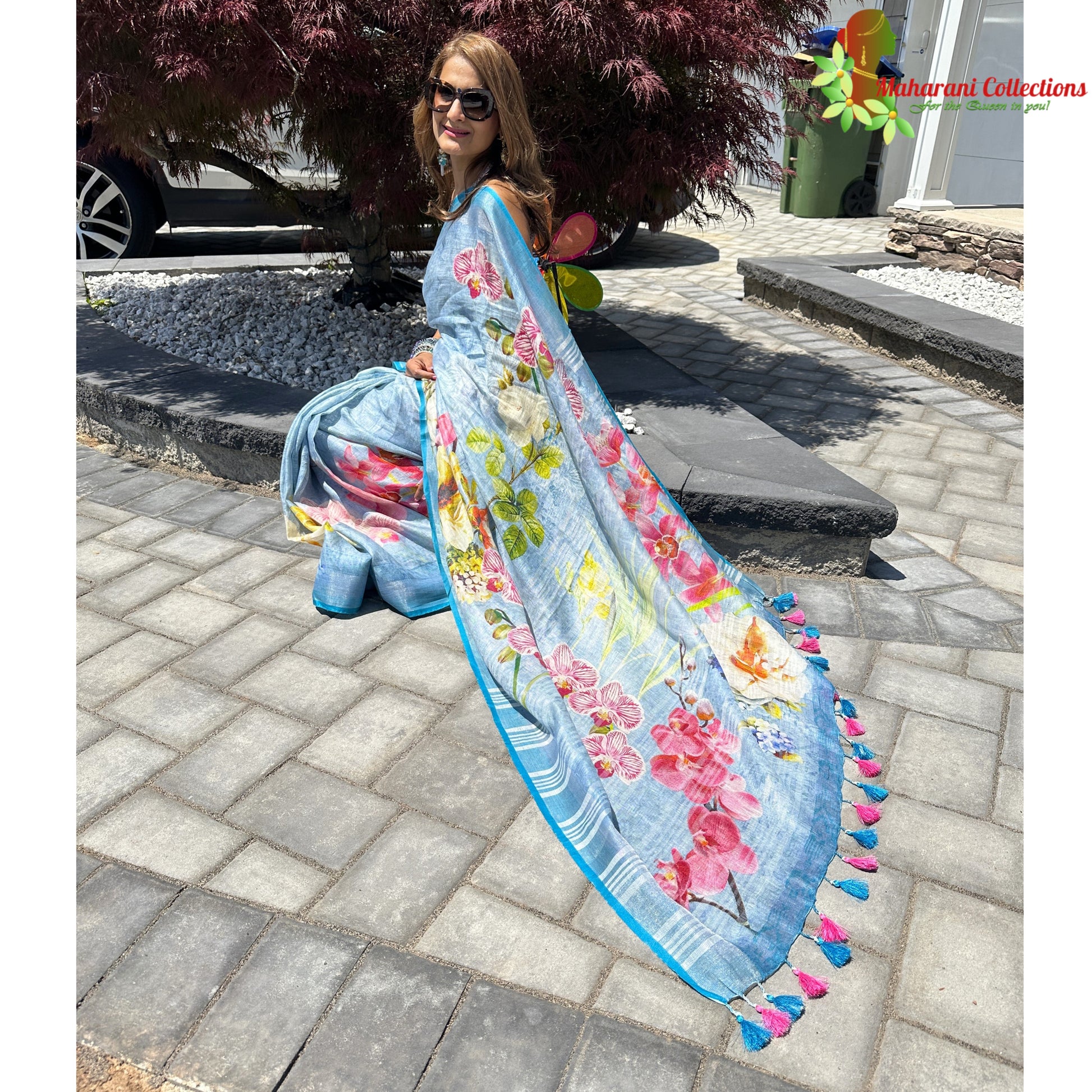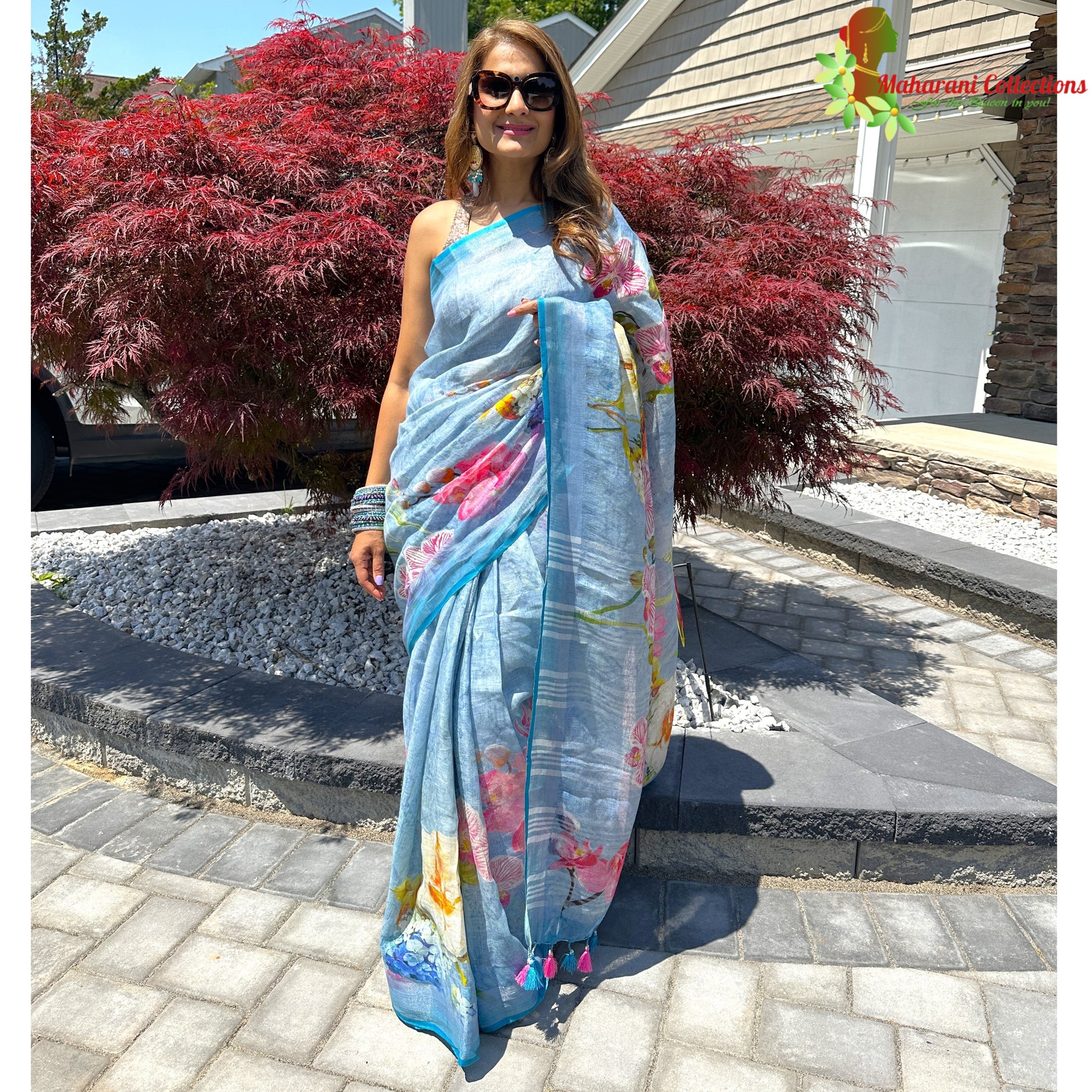 Experience the grandeur of a Maharani's Simple Elegance Matka Silk Saree! Woven with pure Mulberry Silk and stitched with original and authentic material, these luxurious sarees will make you dazzle! Featuring a beautiful, light blue floral shades and open weave, these lightweight sarees exude elegance and shine and are perfect for any occasion. Look & feel like a queen with Maharani's Simple Elegance Matka Silk!