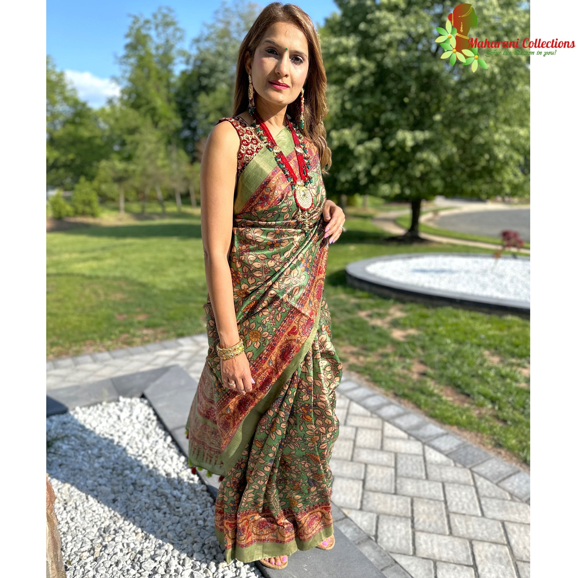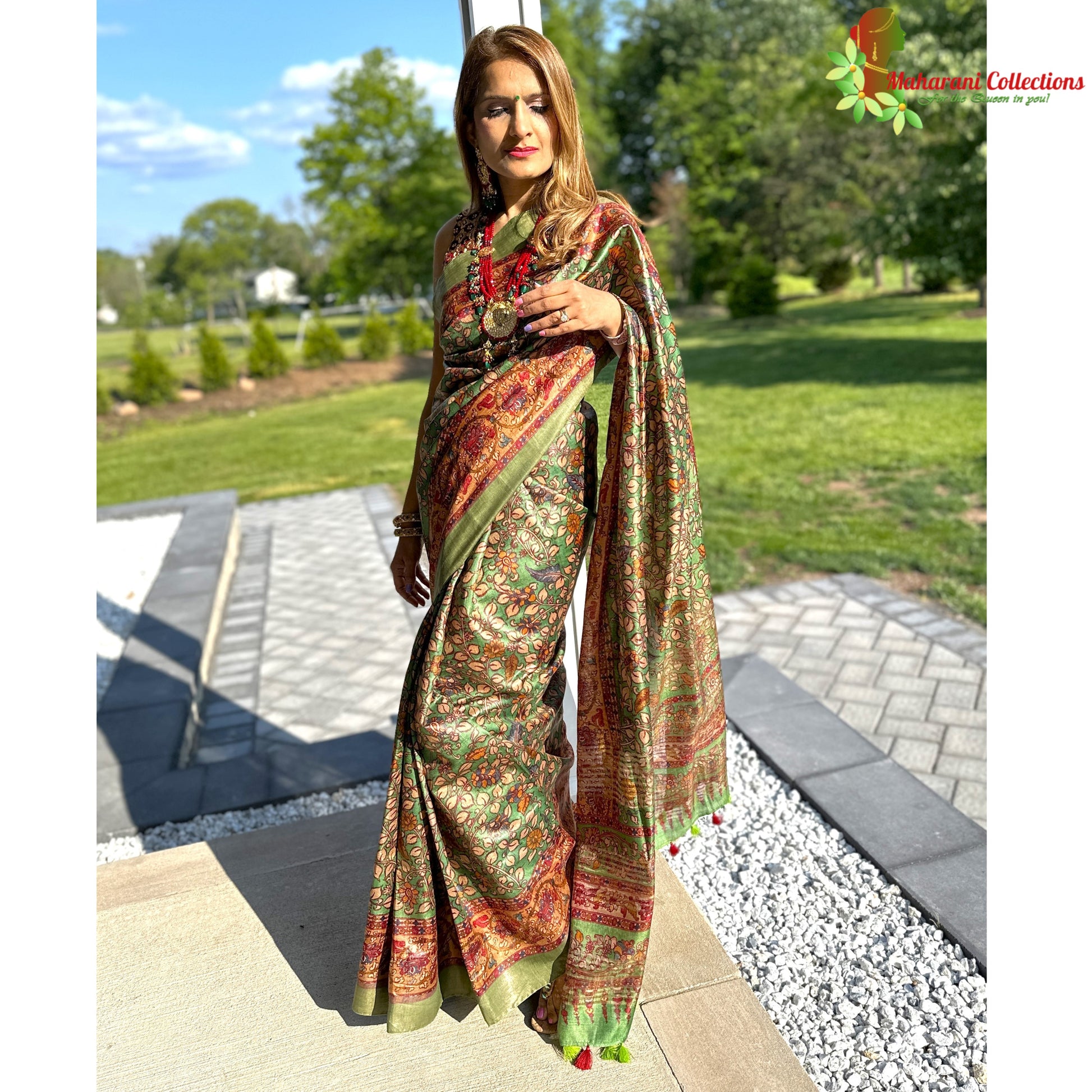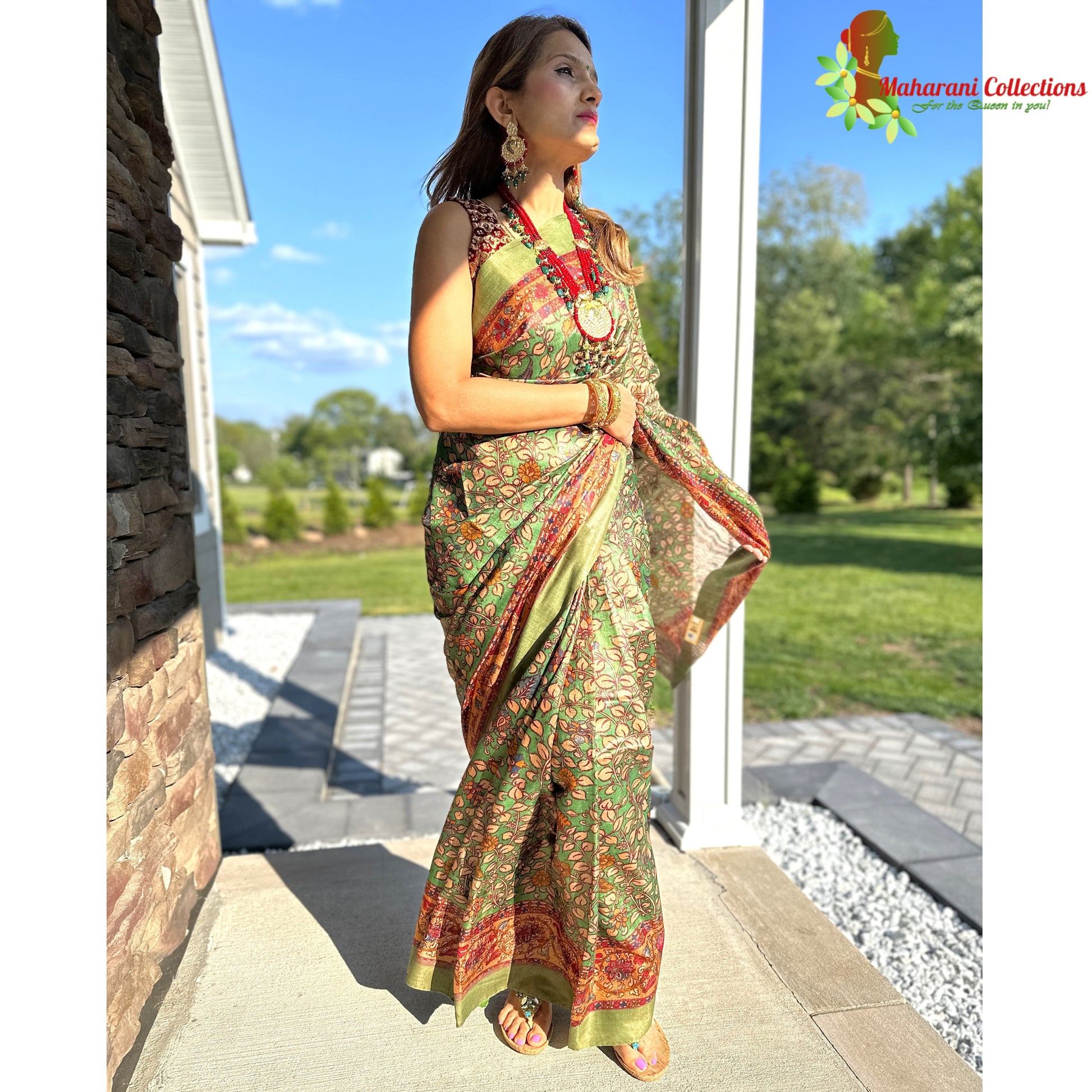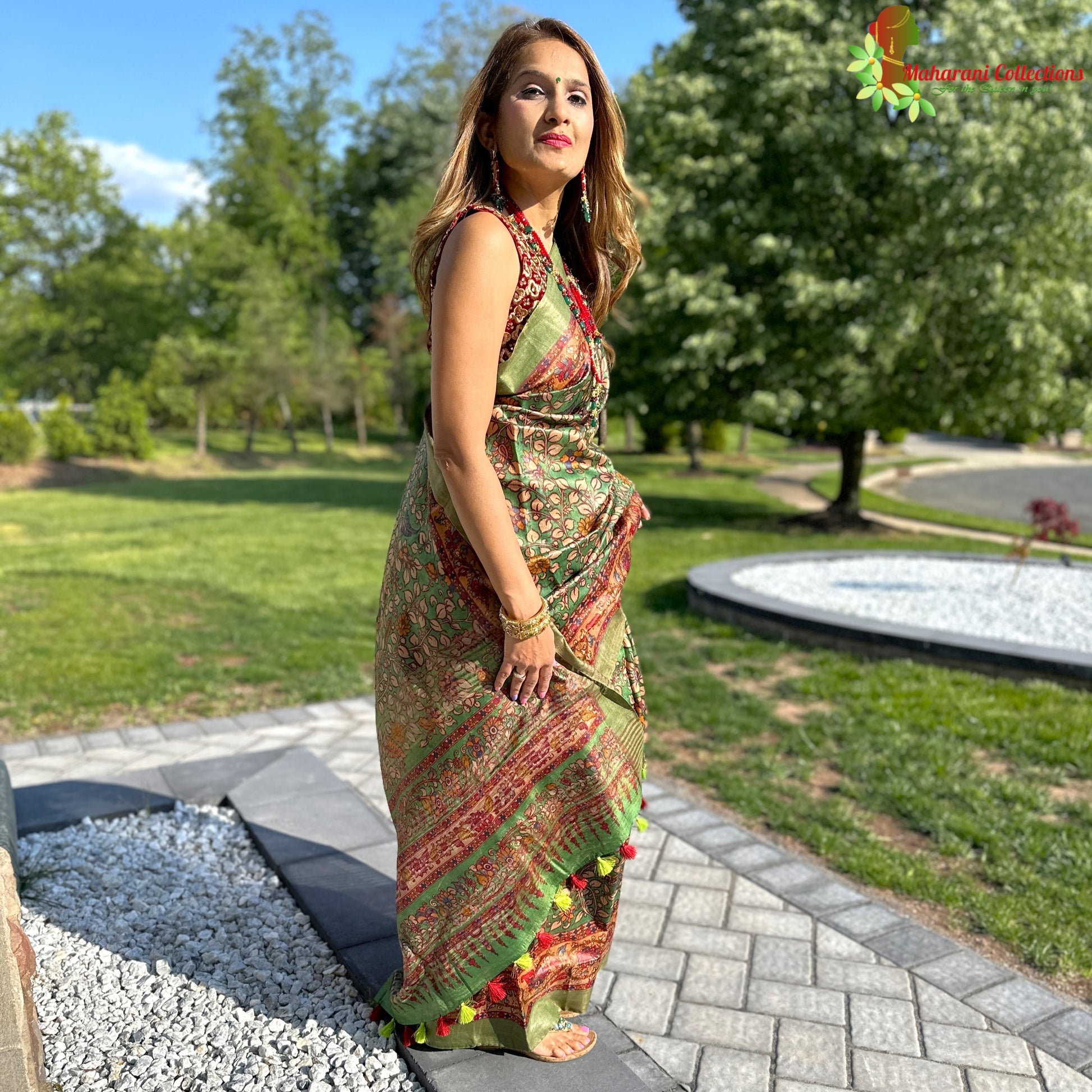 Maharani's Simple Elegance Matka Silk Saree - Green Floral (with stitched blouse and petticoat)