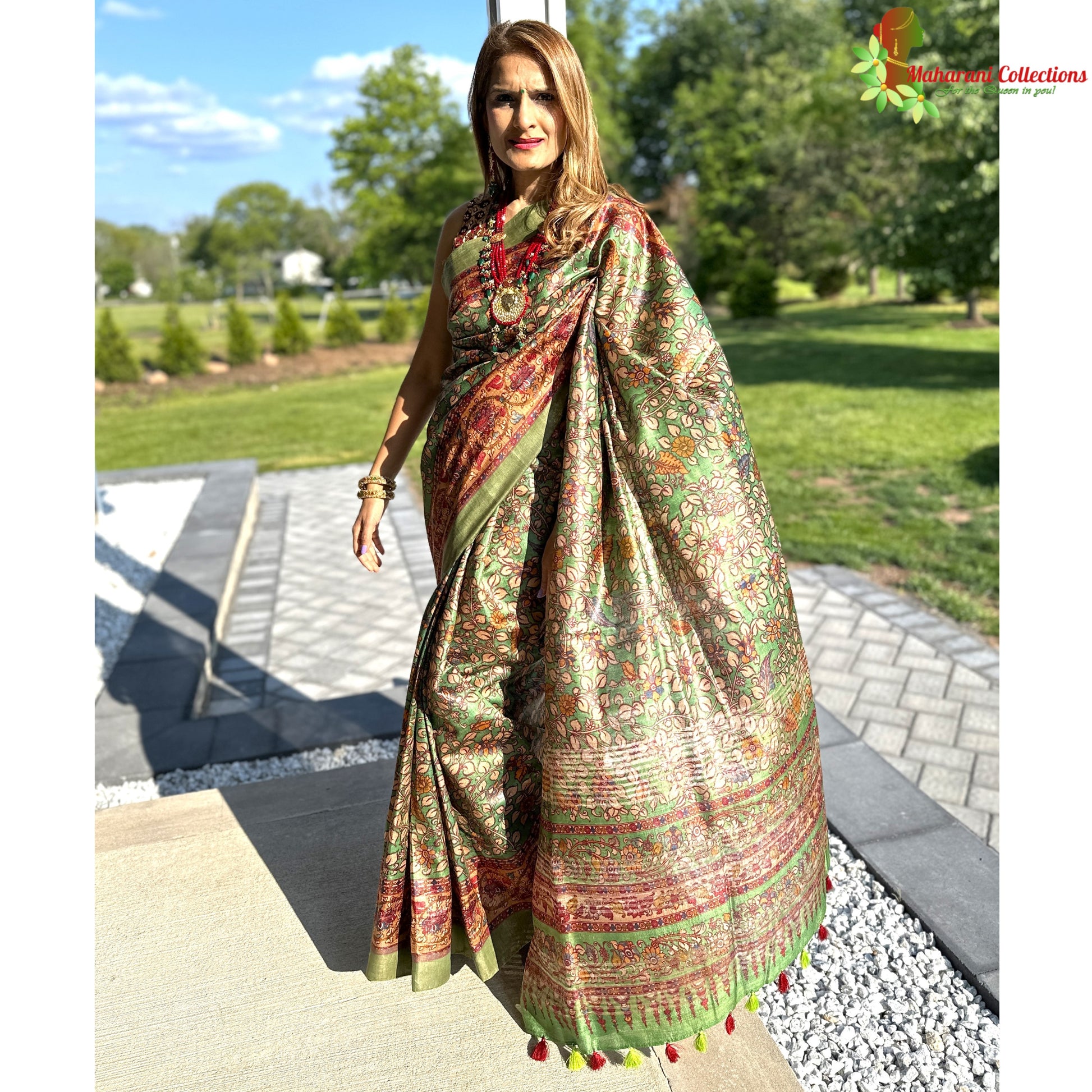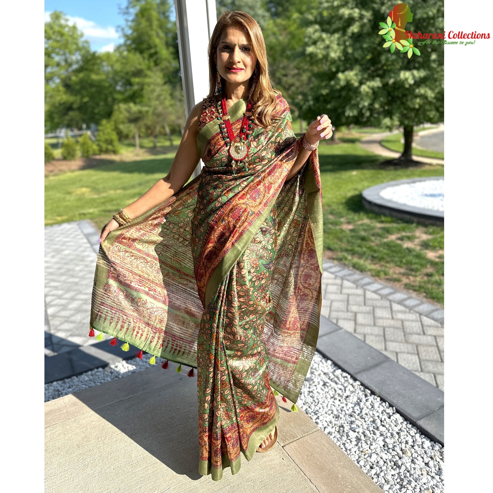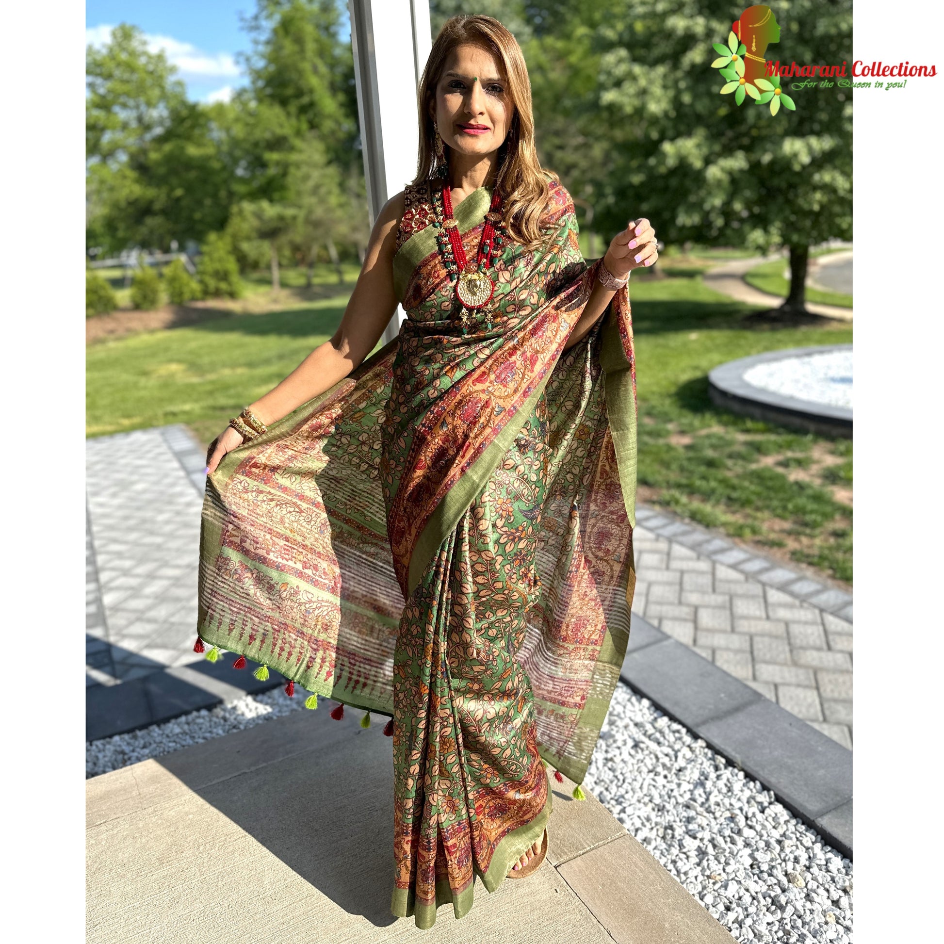 Maharani's Simple Elegance Matka Silk Saree - Green Floral (with stitched blouse and petticoat)