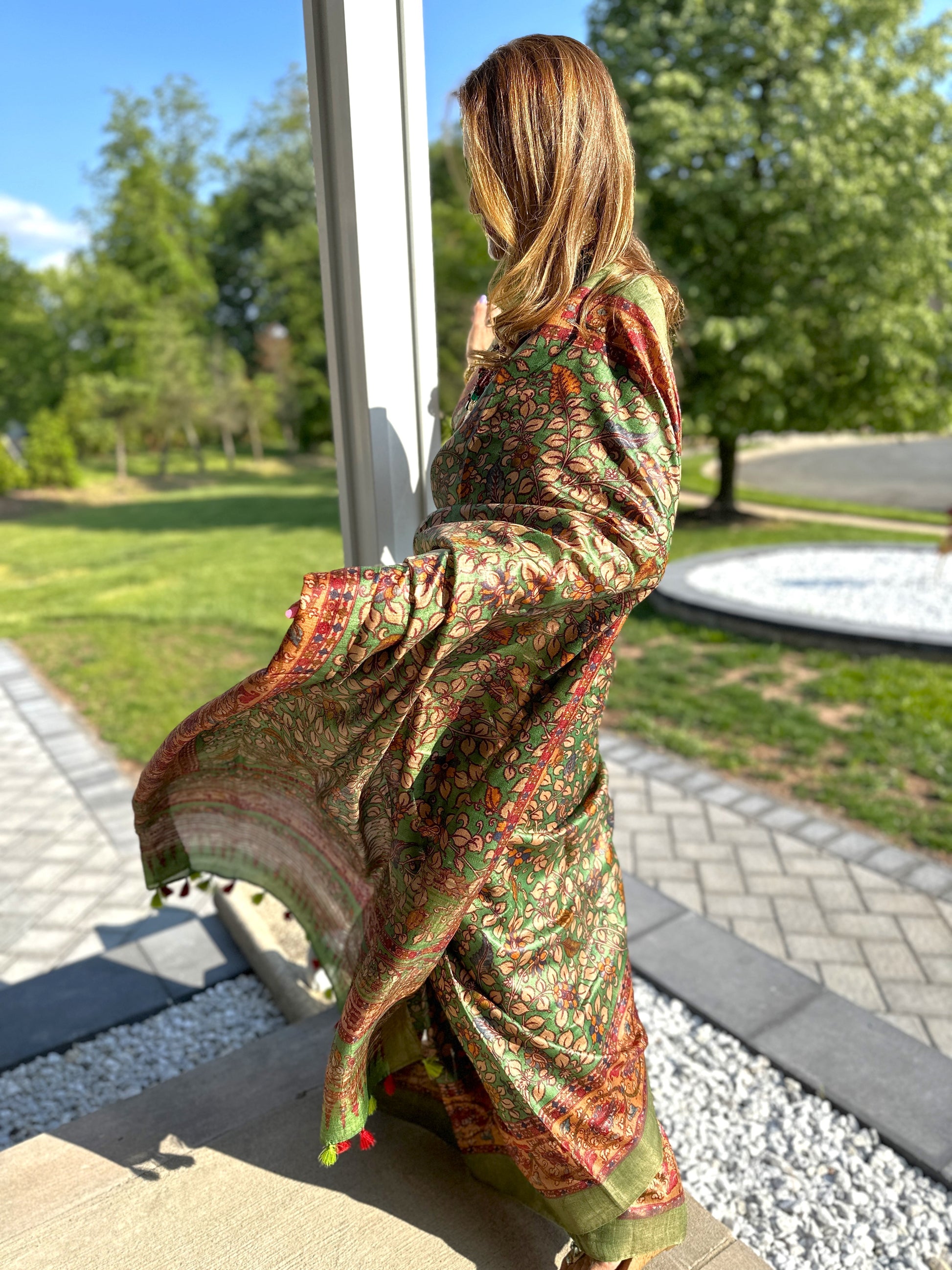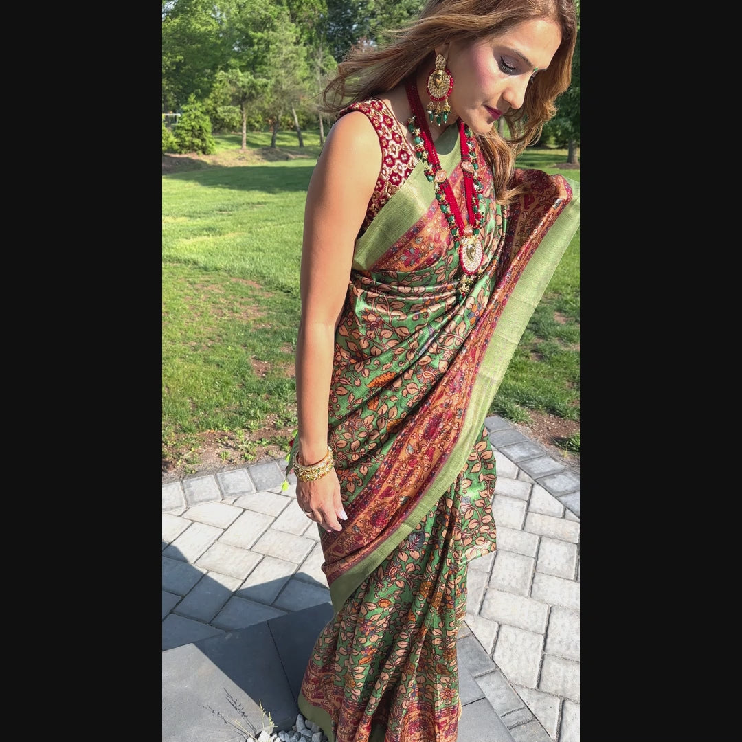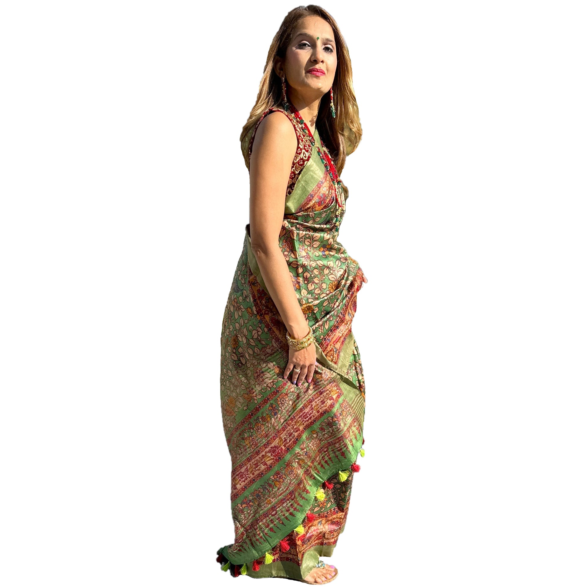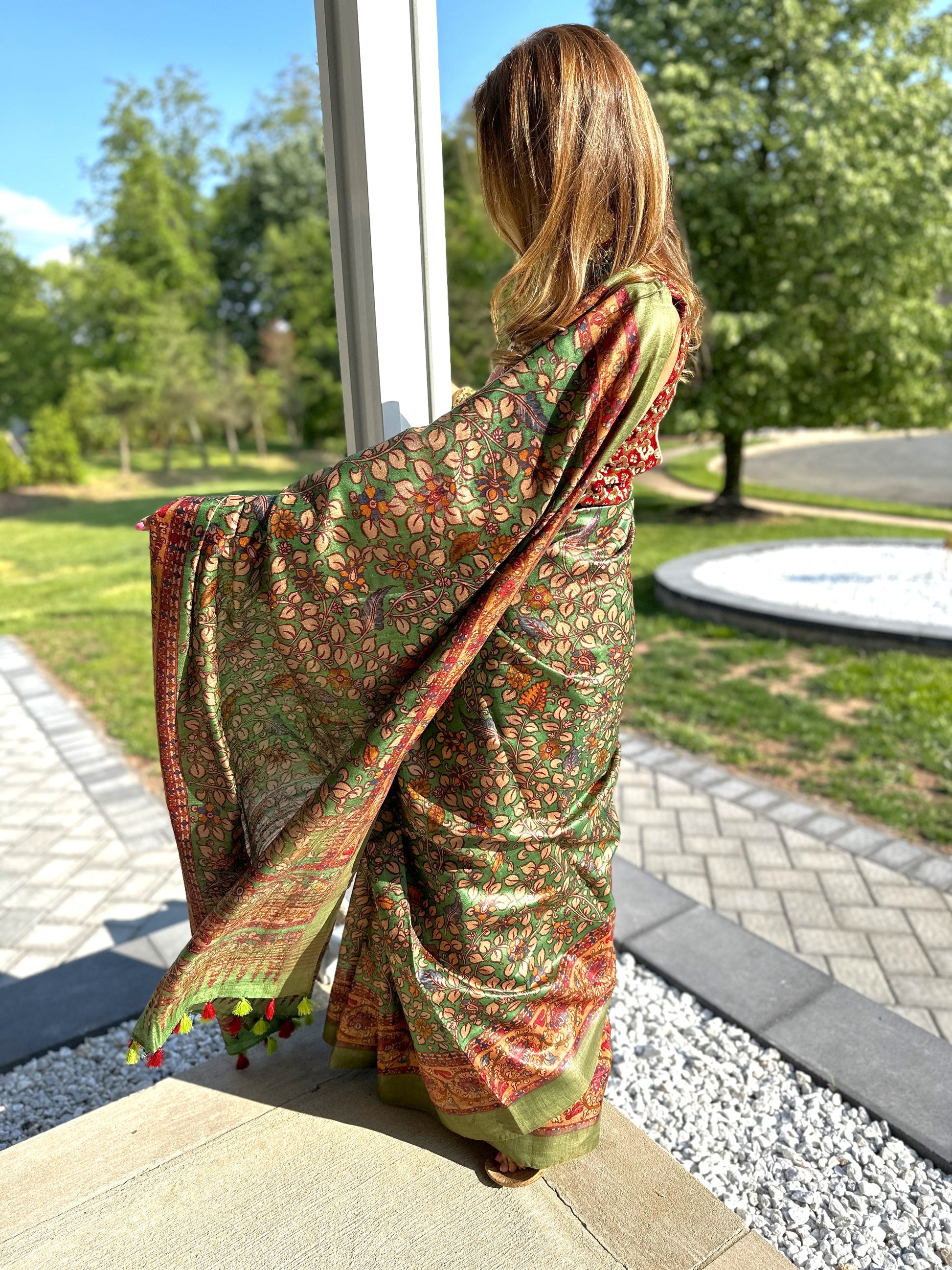 Maharani's Simple Elegance Matka Silk Saree - Green Floral (with stitched blouse and petticoat)