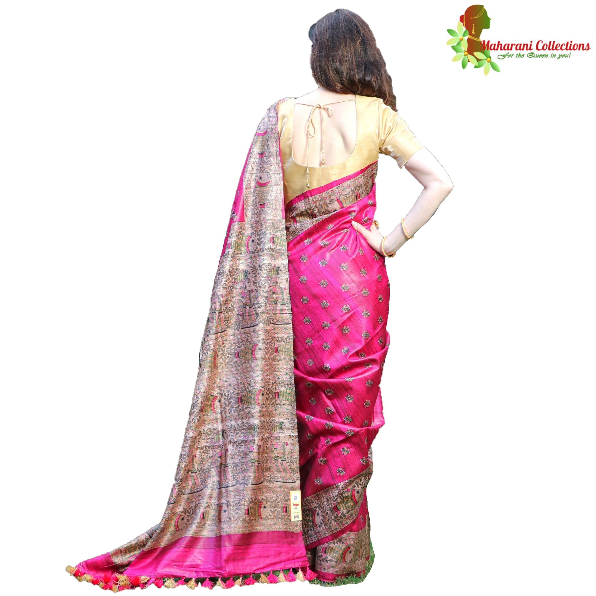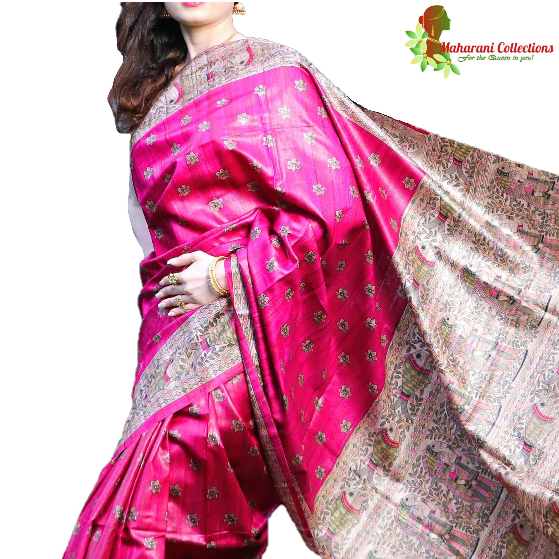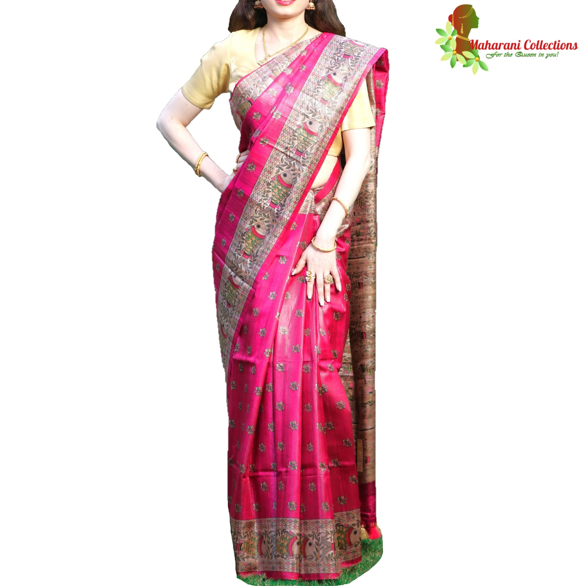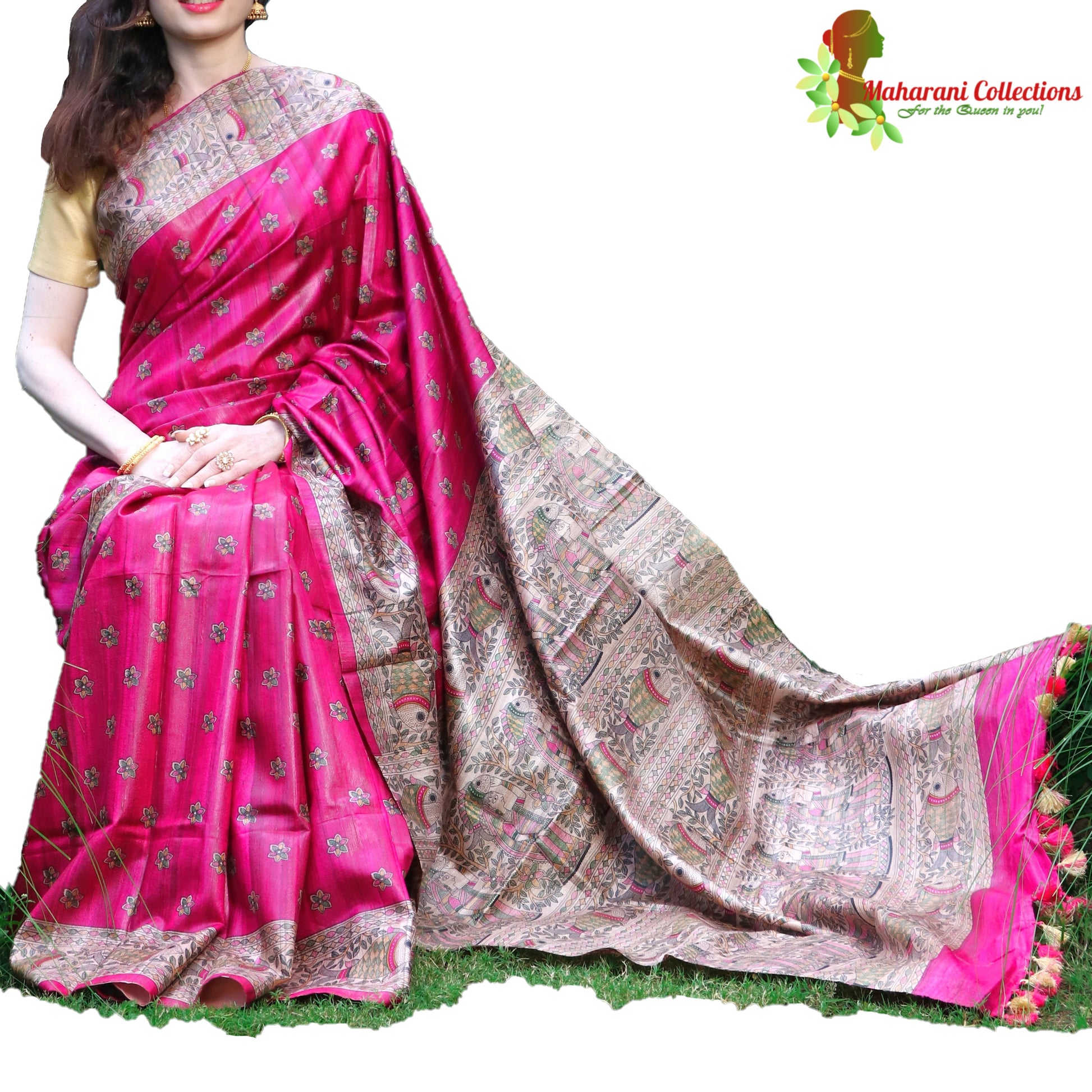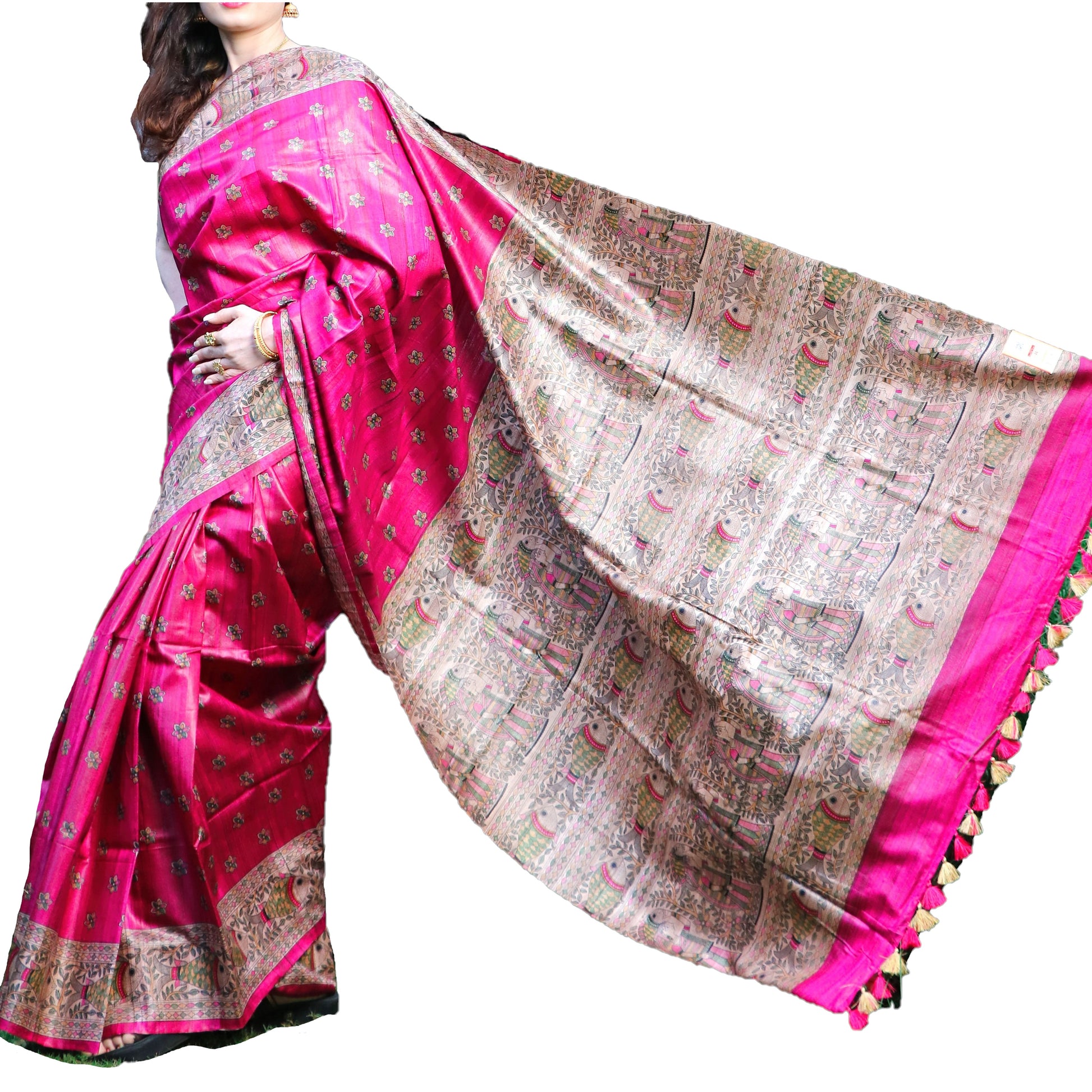 Elegant Pure Handloom Bhagalpur Tussar Silk Saree with Madhubani Work Throughout and Beautiful Border and Pallu.