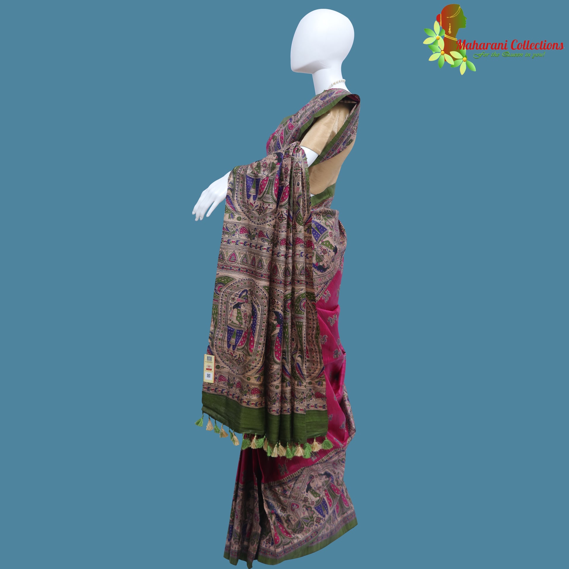 Bhagalpur Silk or Tussar Silk is traditional Silk of India. This natural pure Silk is used to make this gorgeous Maharani Silk Saree. The seal of authentic pure Silk, "Silk Mark" is attached with this Saree.