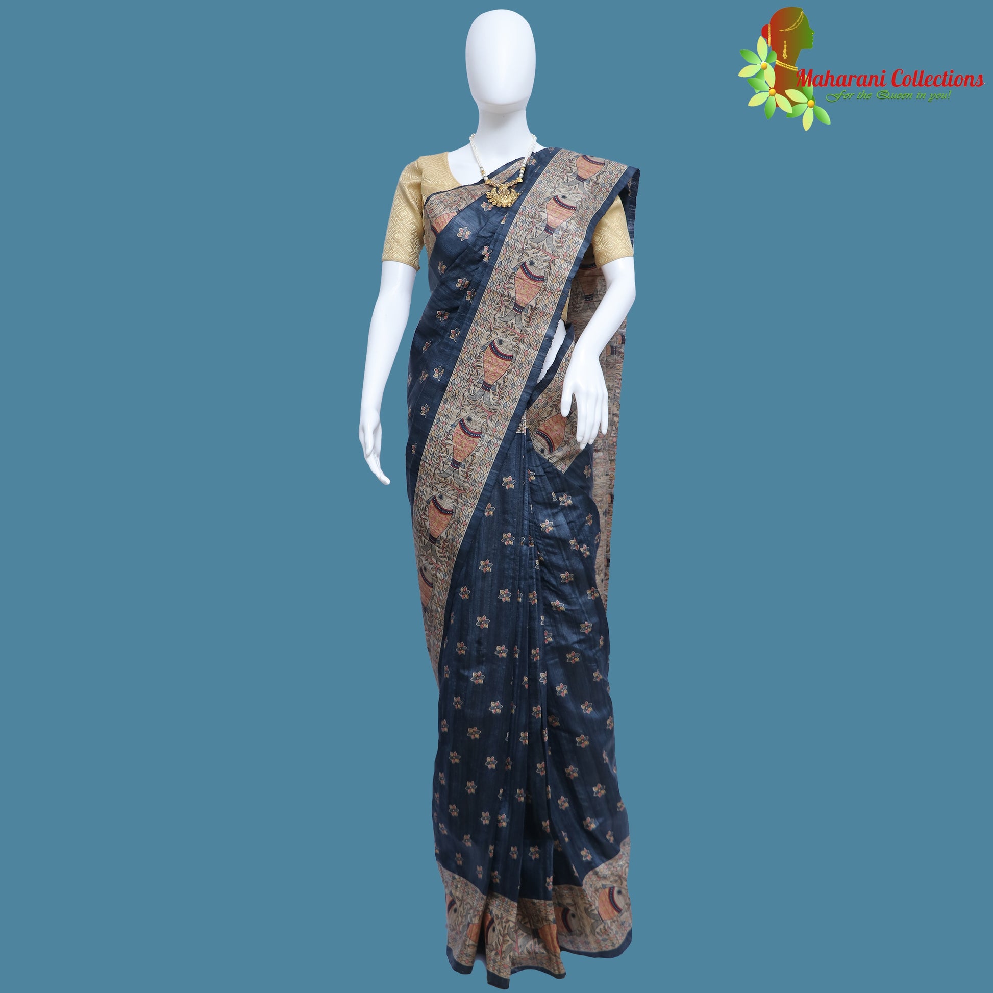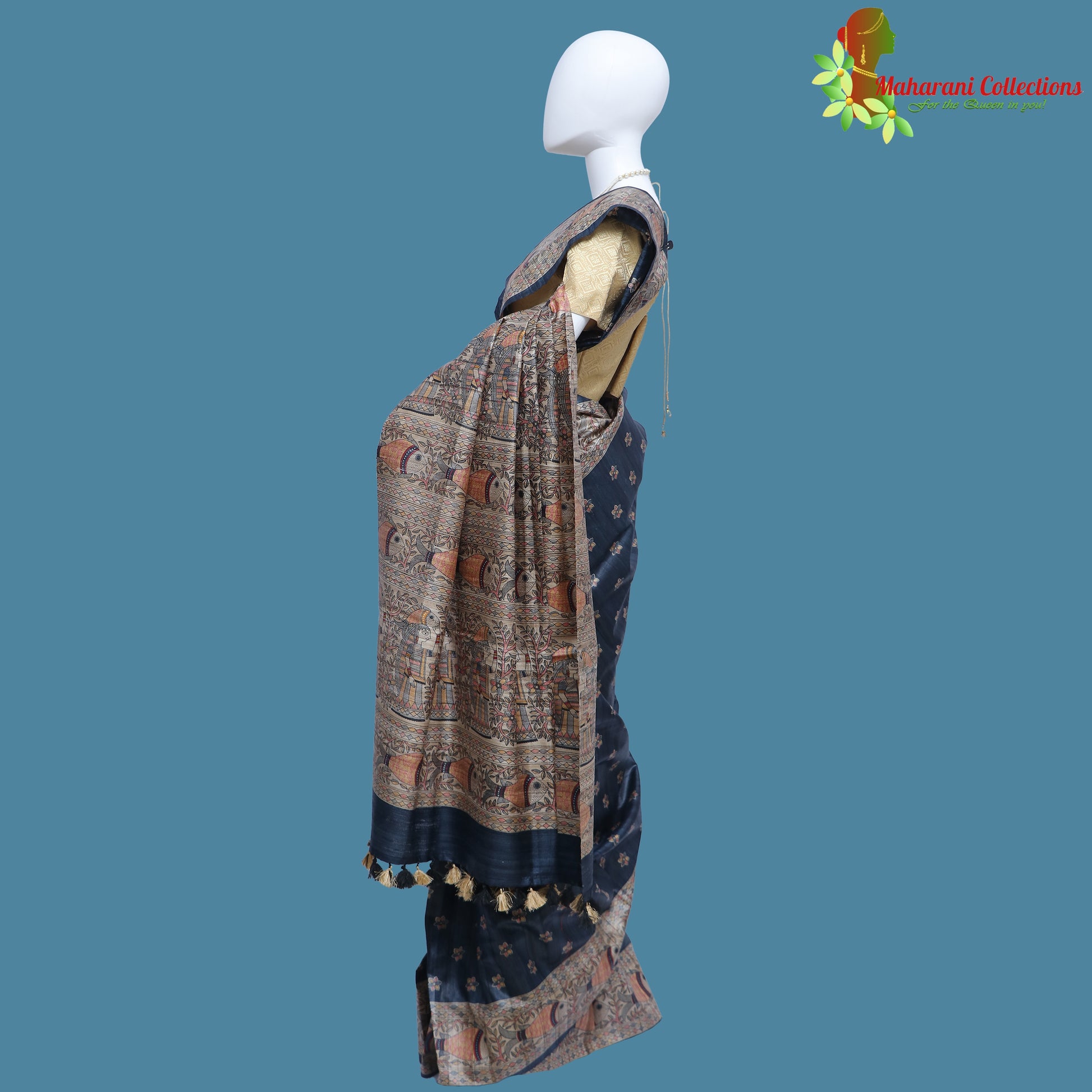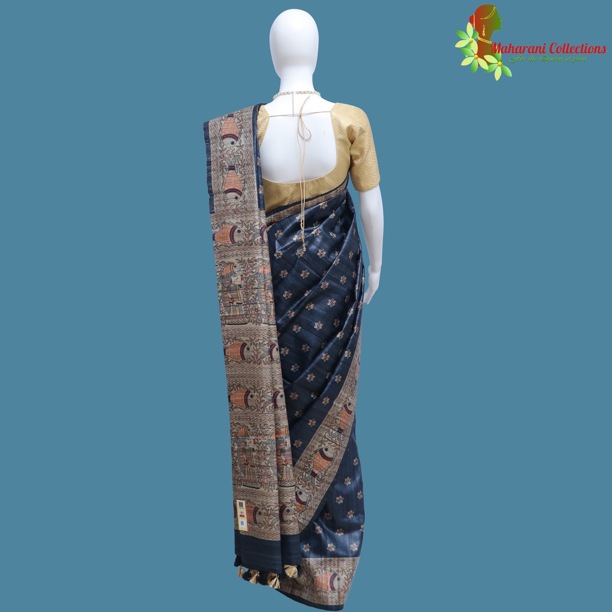 Pure Bhagalpur Tussar Silk Saree (Silk Mark) - Slate Blue Madhubani Work