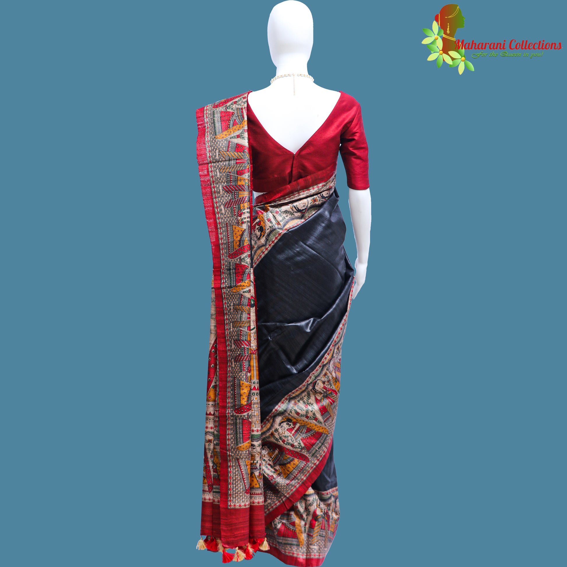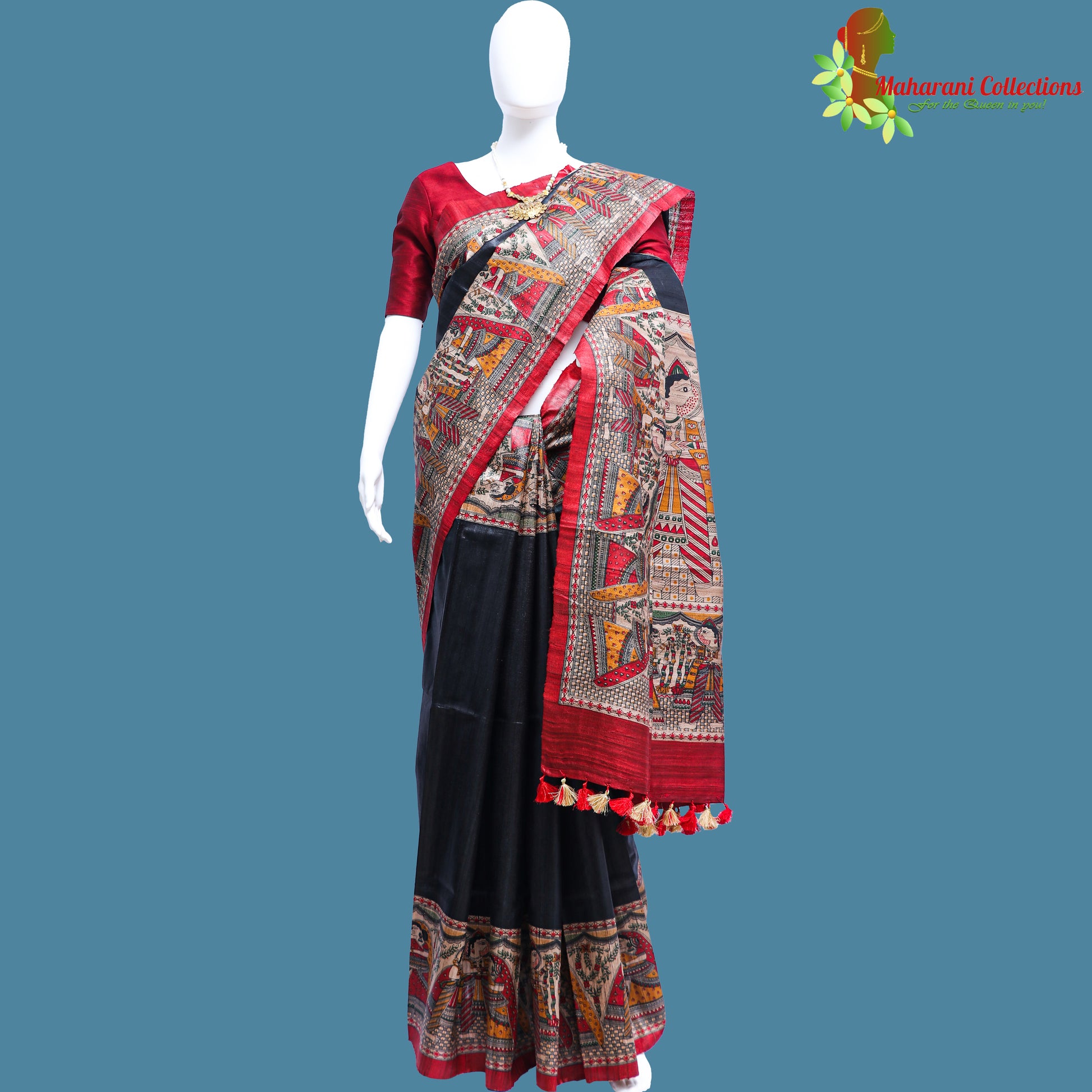 Pure Bhagalpur Tussar Silk Saree (Silk Mark) - Black Madhubani Work