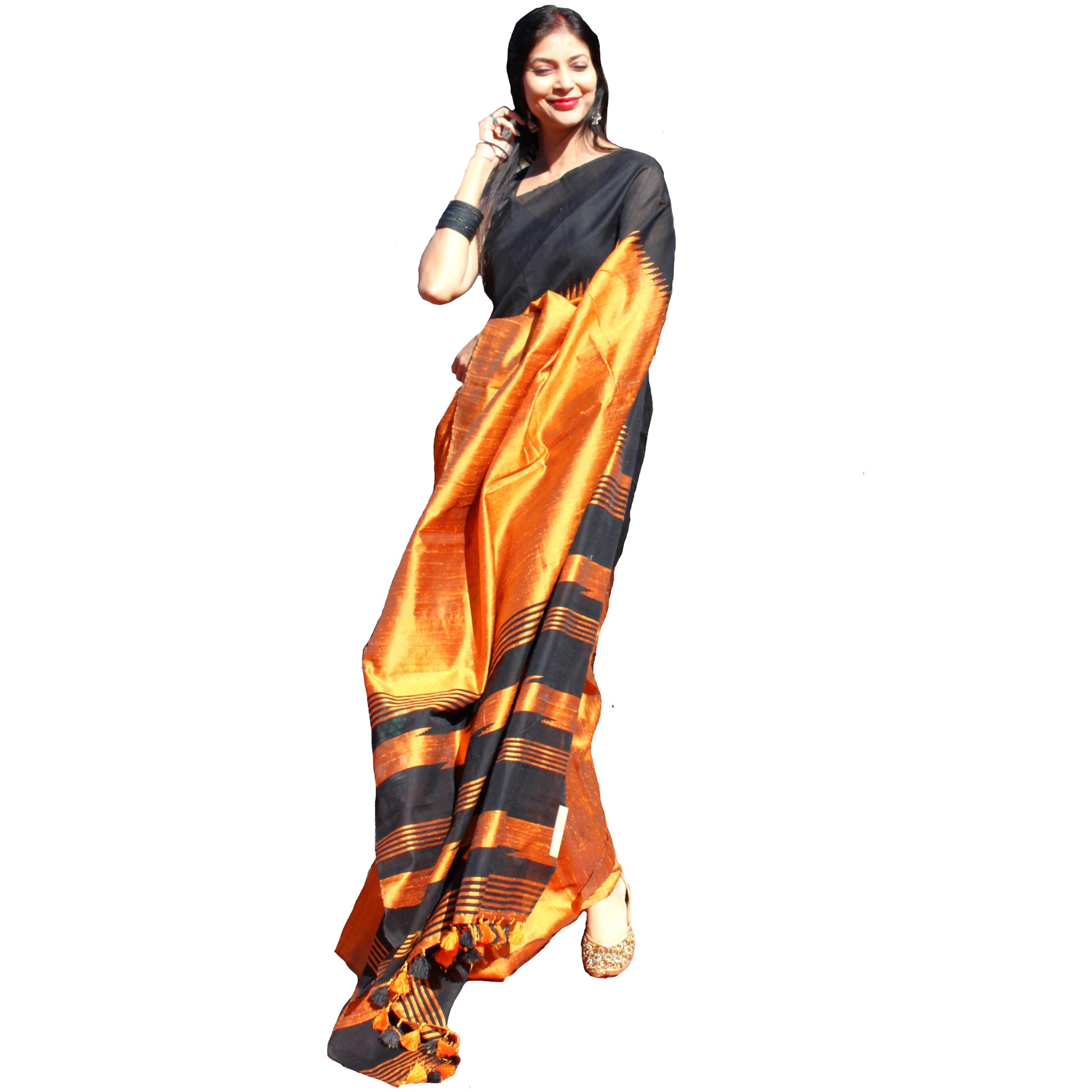 Indulge in pure luxury with this exquisite black and orange Bhagalpuri handloom tussar silk saree, boasting a beautiful silk mark and intricate golden zari work. This stunning piece also comes with a fall and pico and an unstitched blouse piece, offering an unparalleled level of sophistication and class. Elevate your look even more with a matching readymade blouse from our extensive collection.