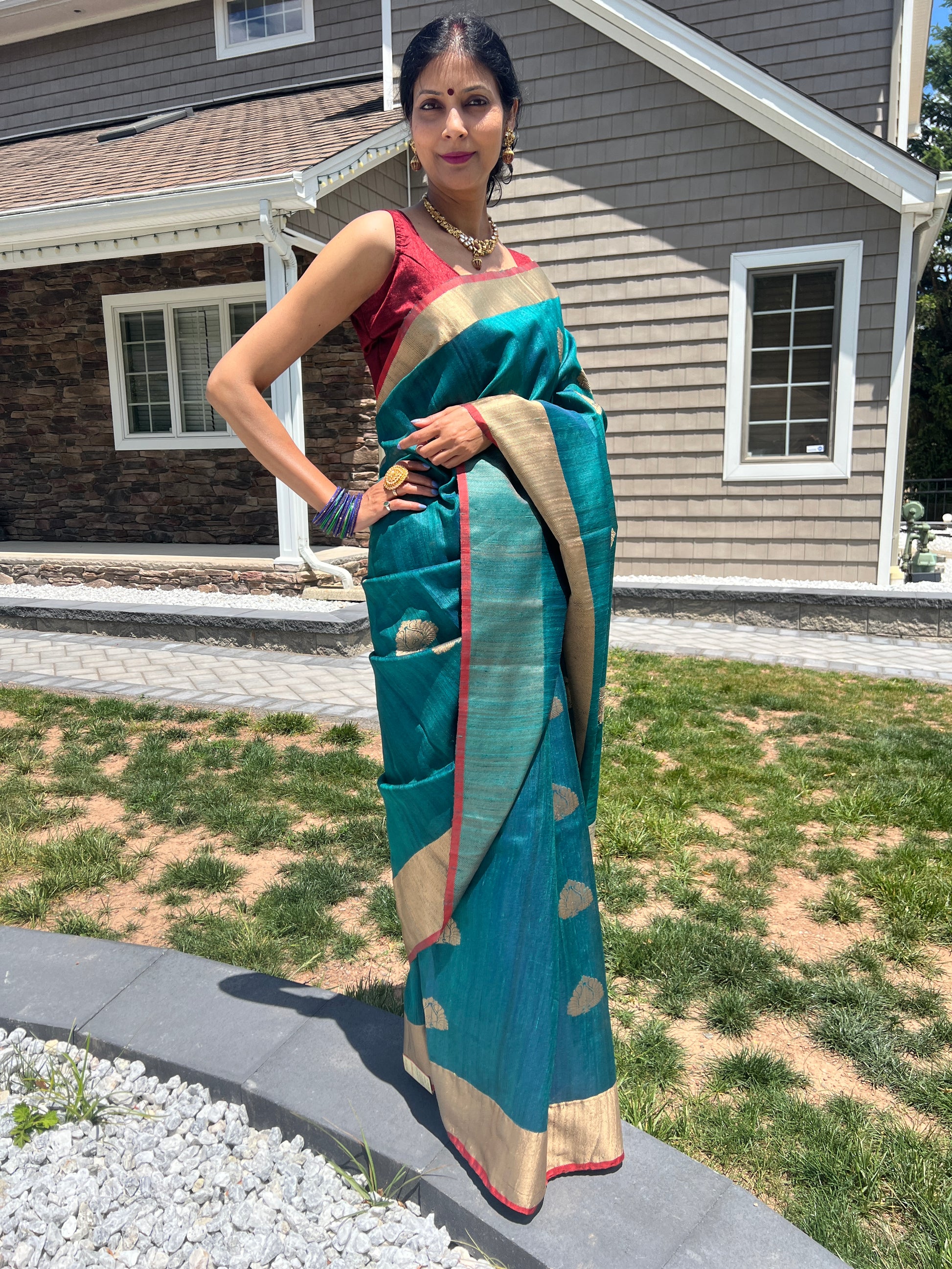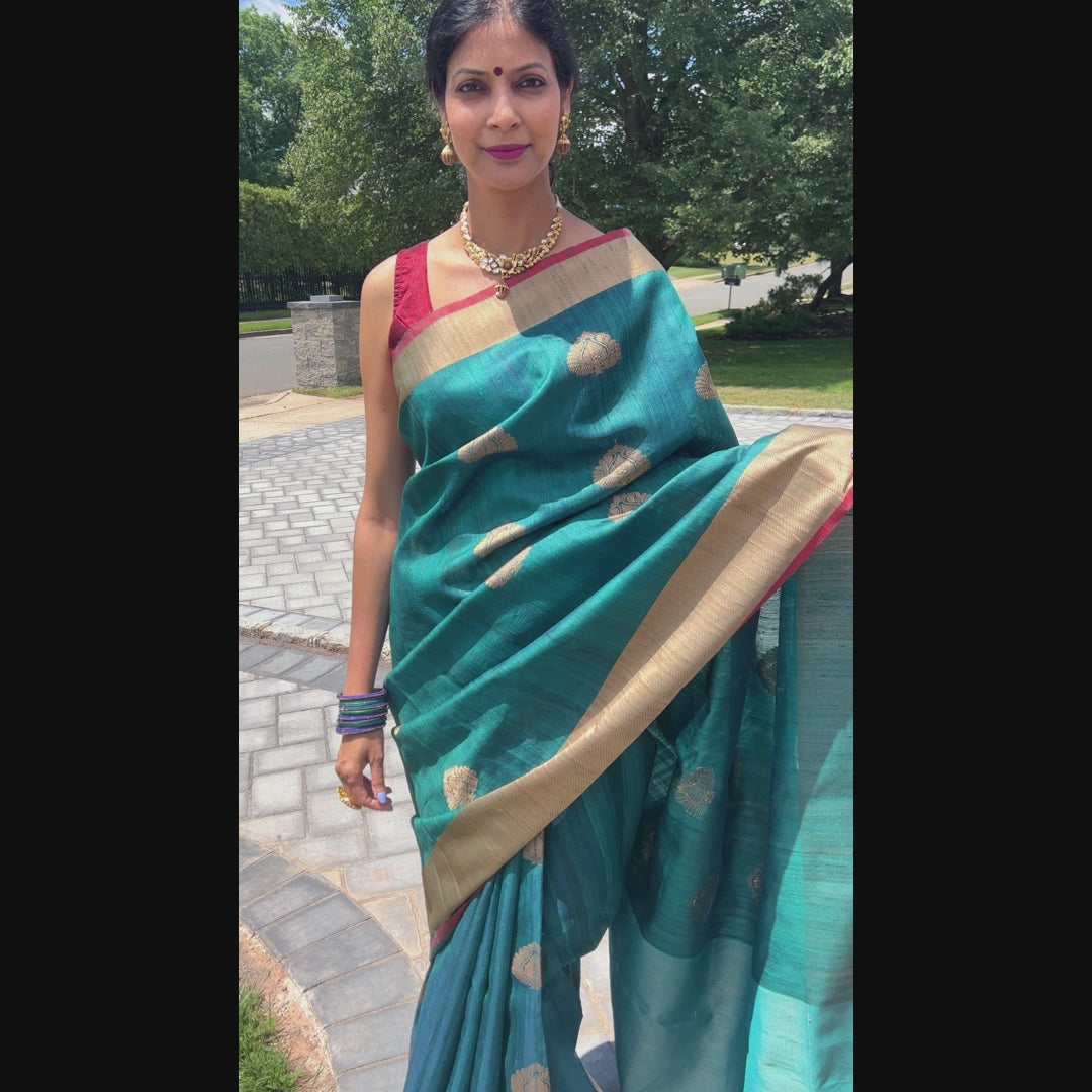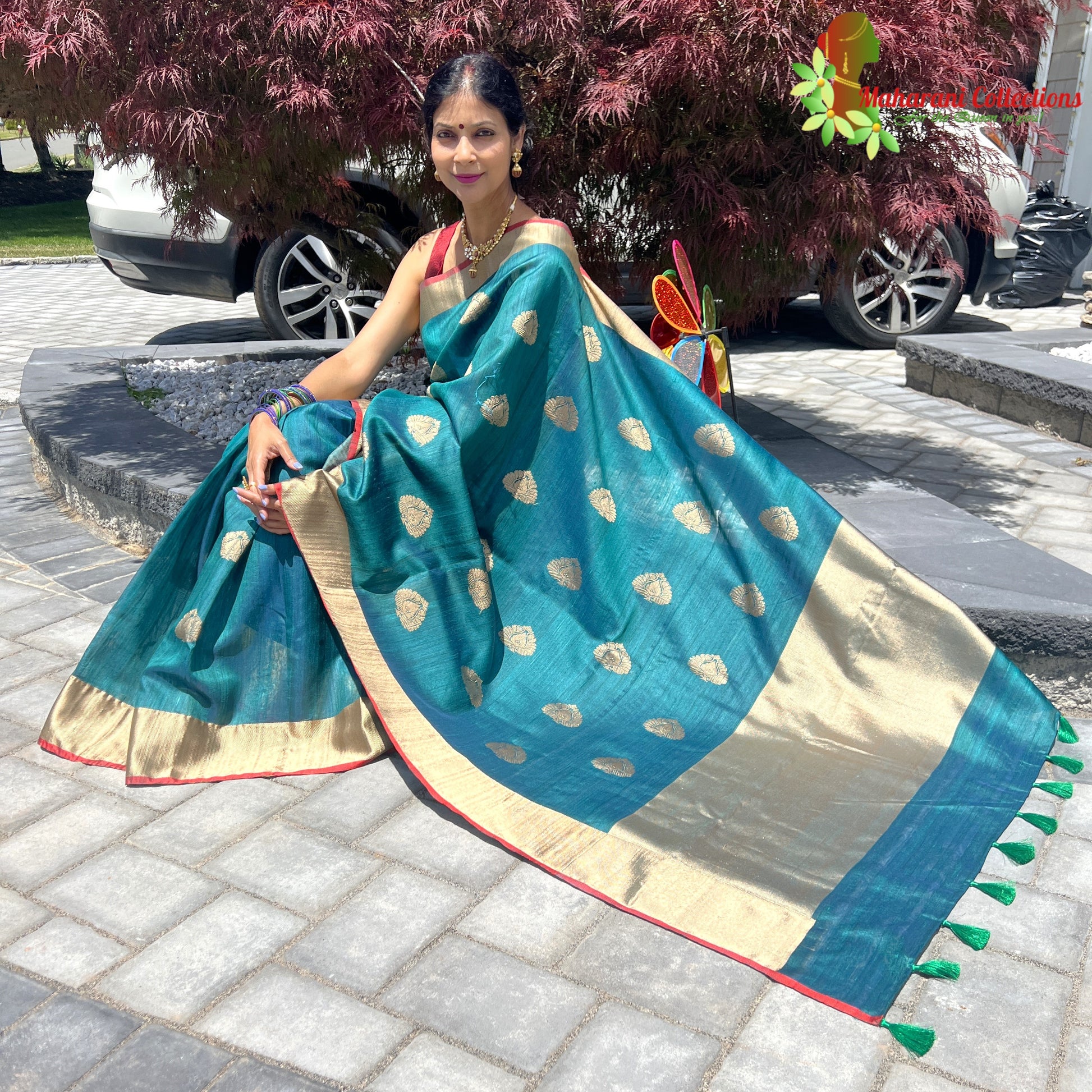 Maharani's Pure Tussar Silk Saree (Silk Mark) - Pine Green (with Stitched Blouse & Petticoat)