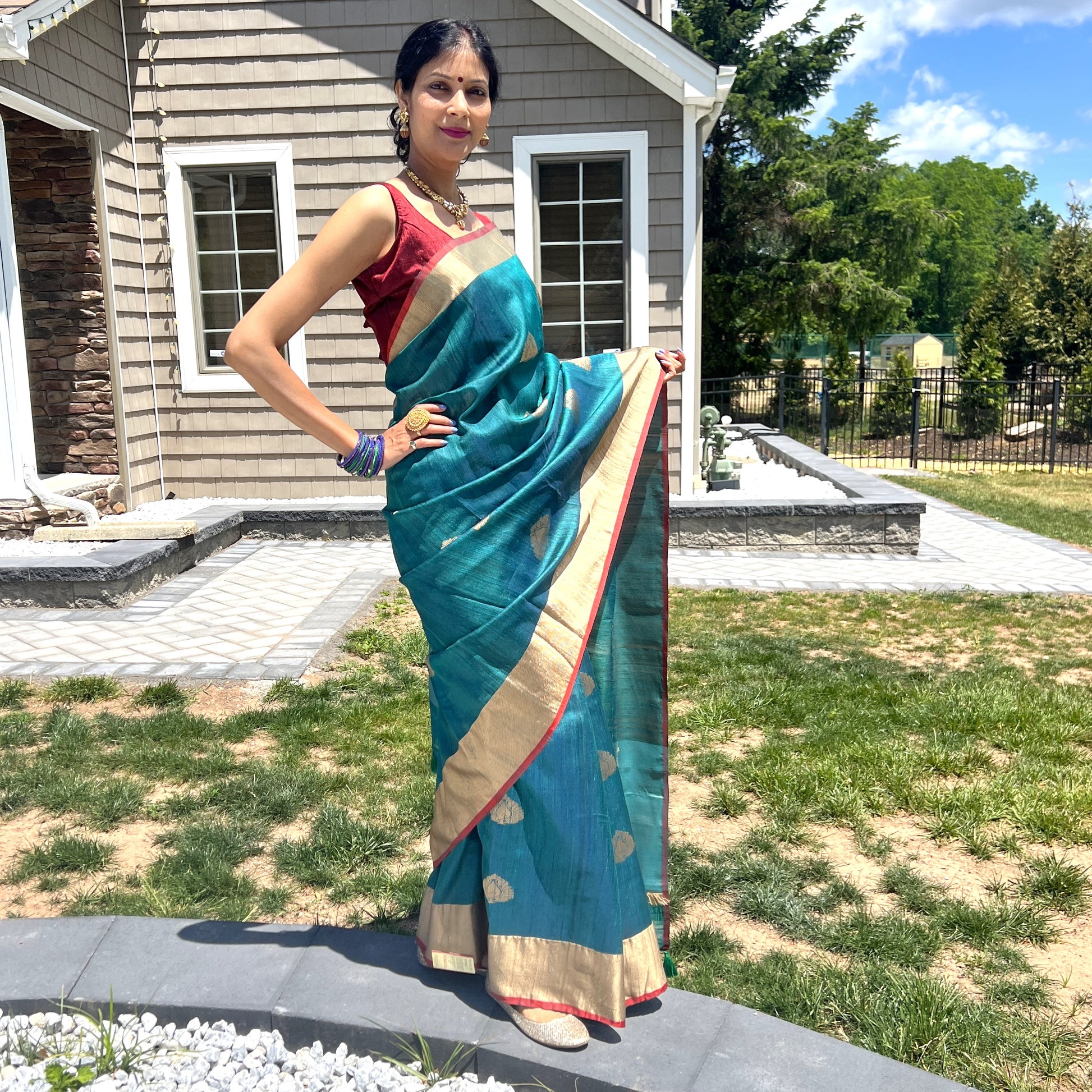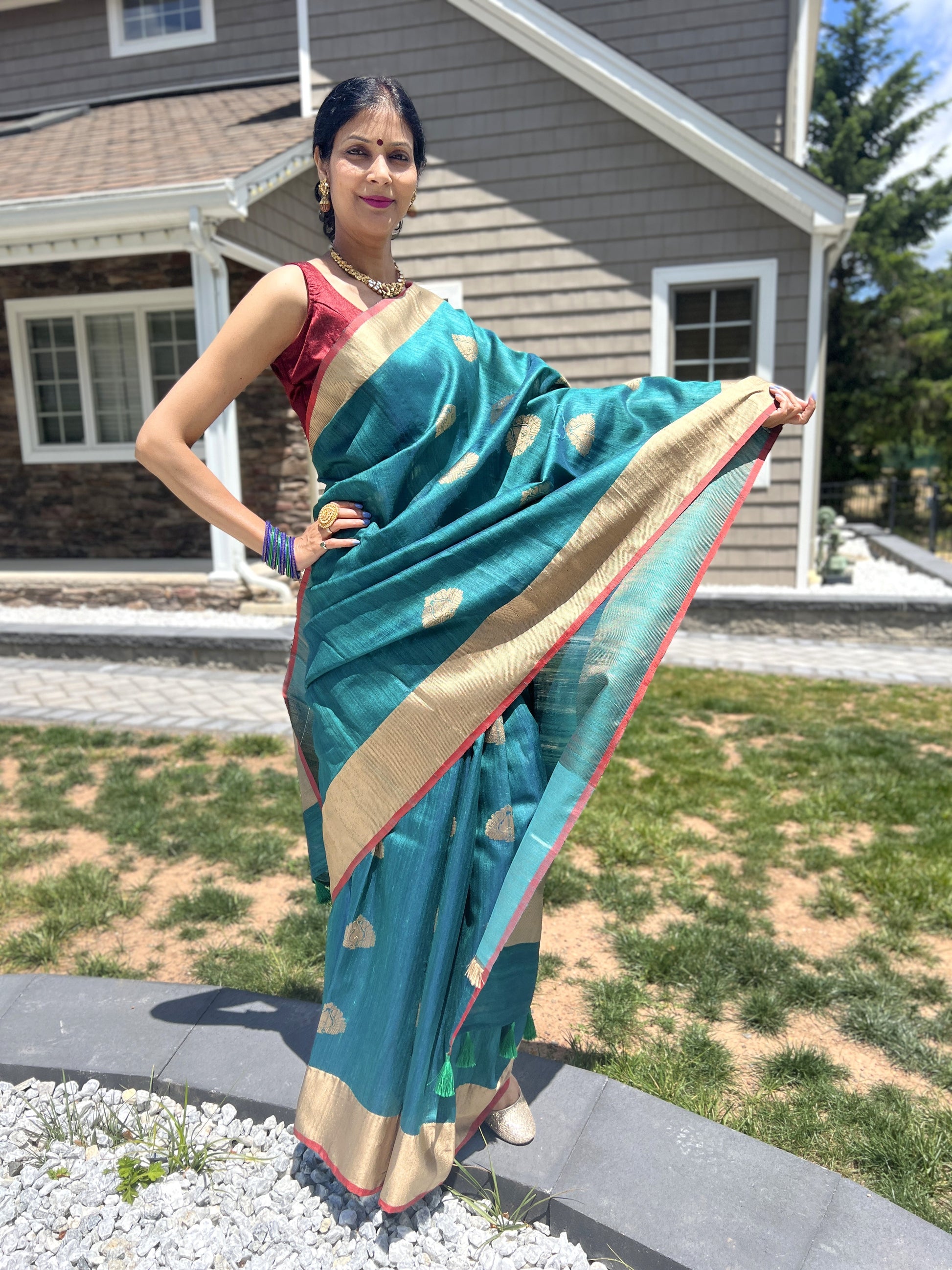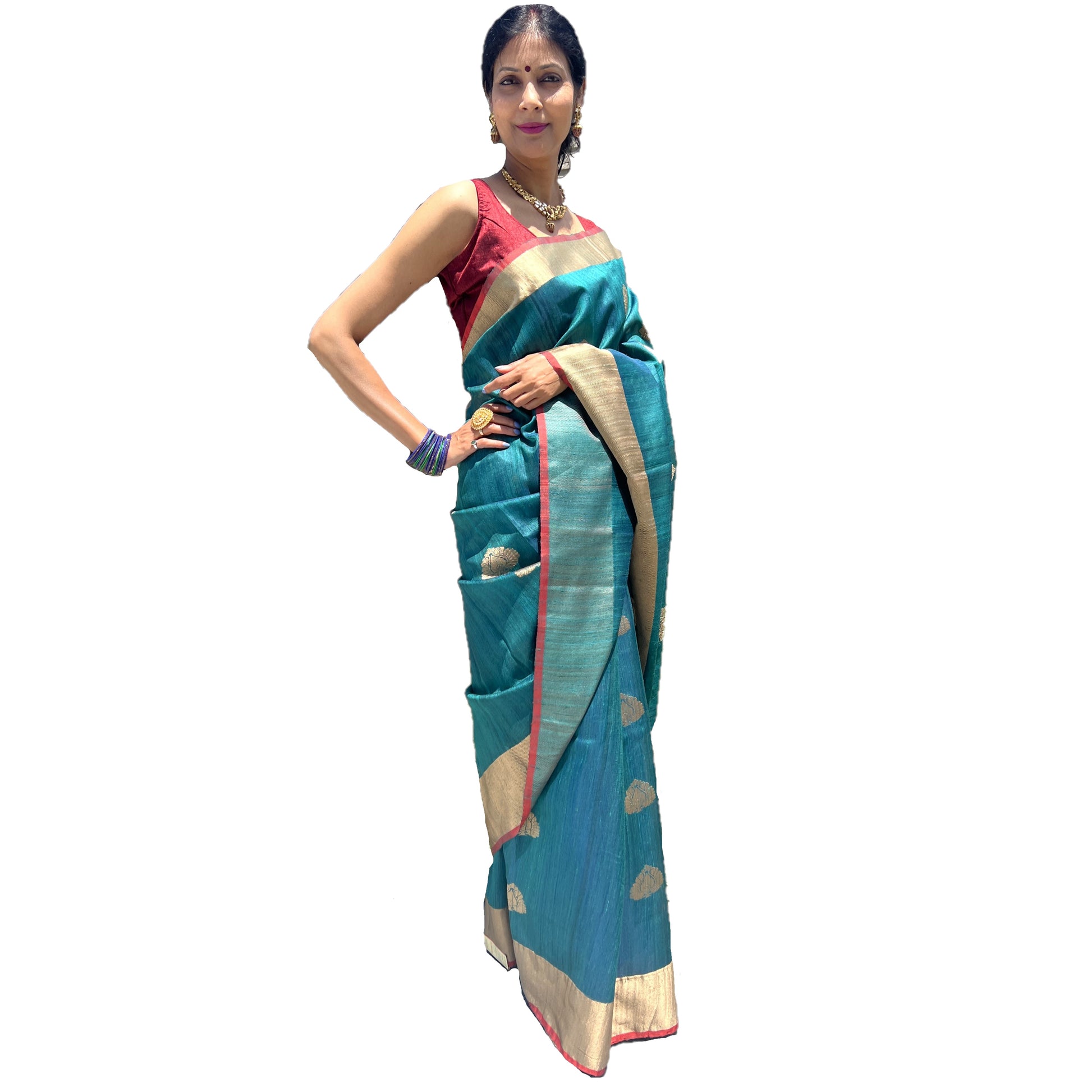 Maharani's Pure Tussar Silk Saree (Silk Mark) - Pine Green (with Stitched Blouse & Petticoat)