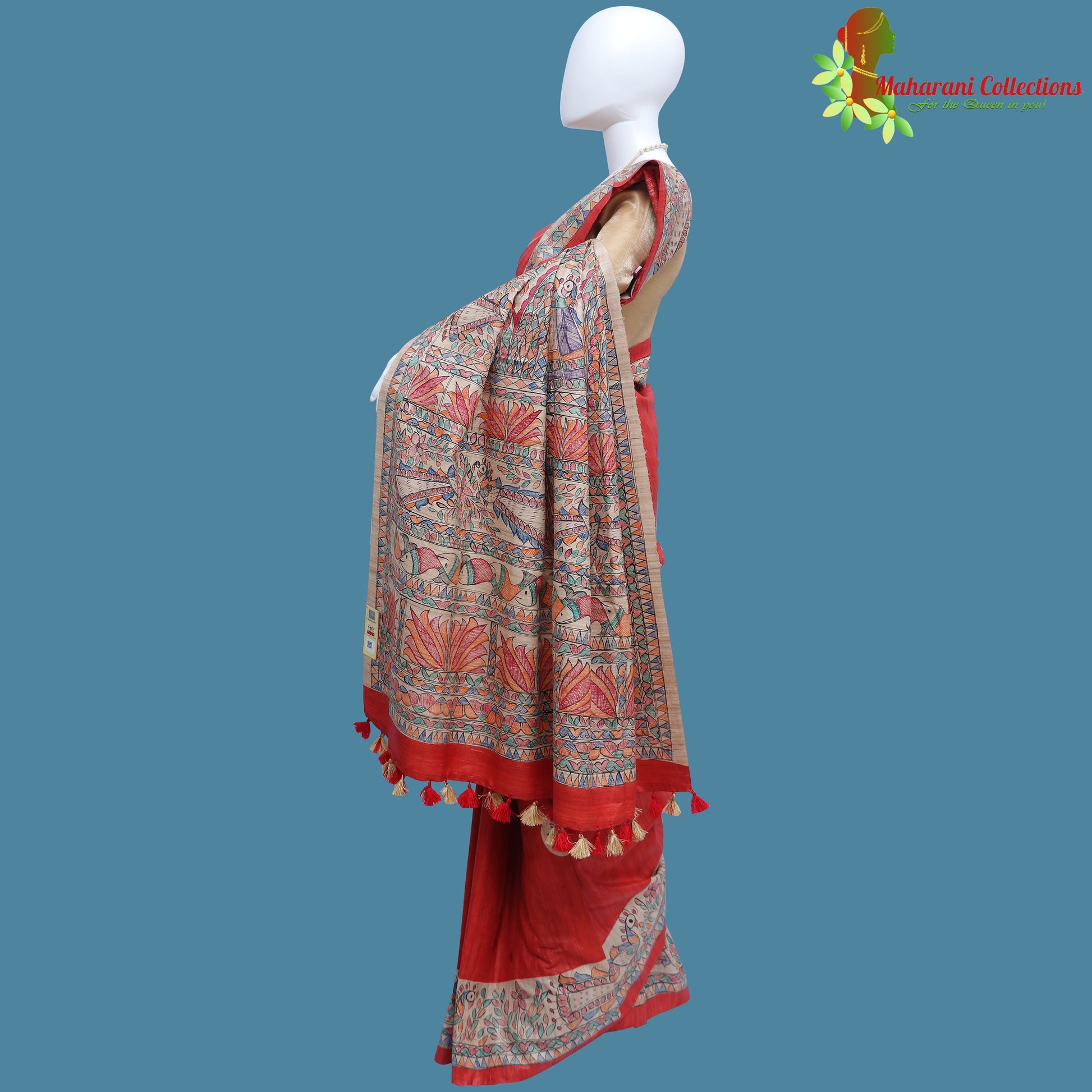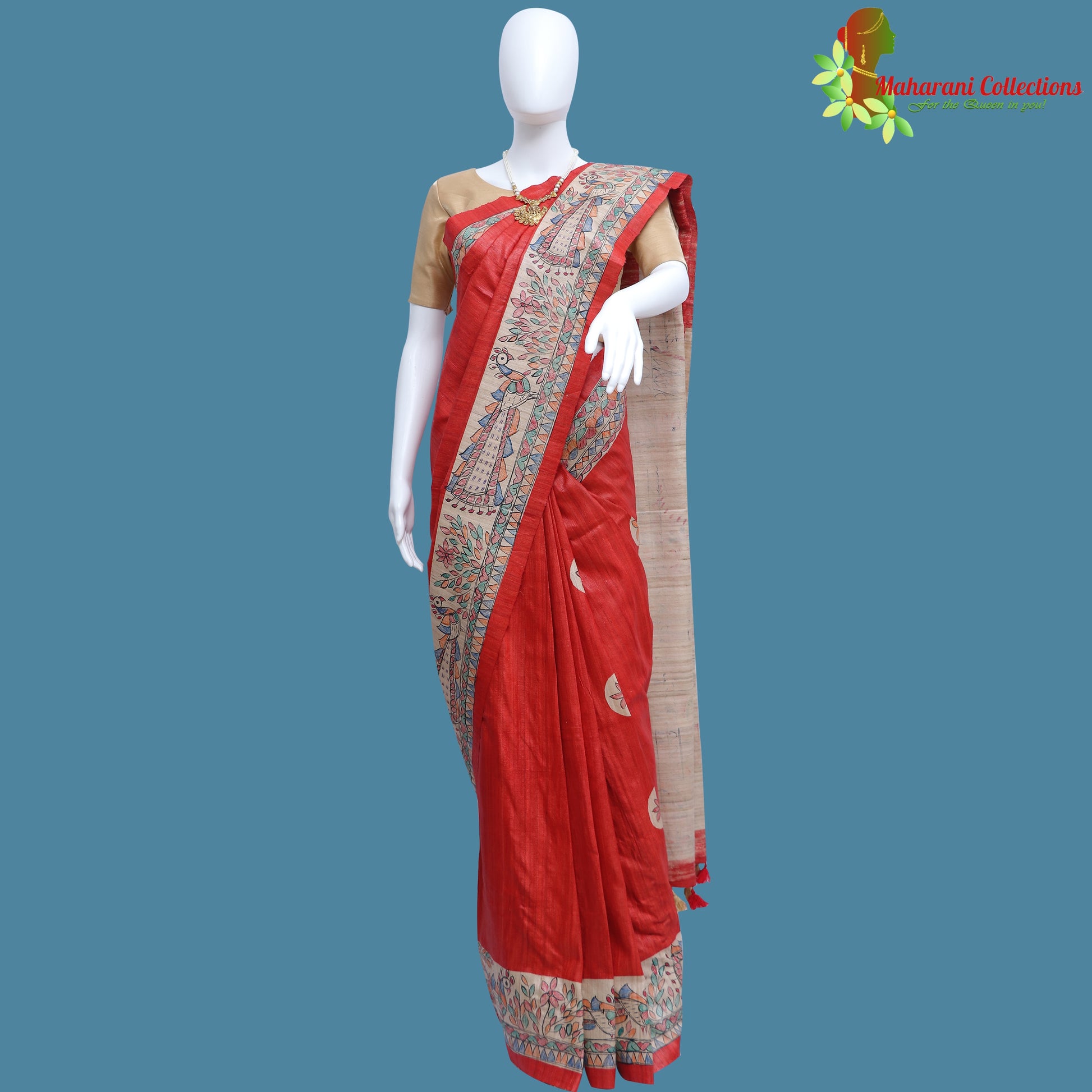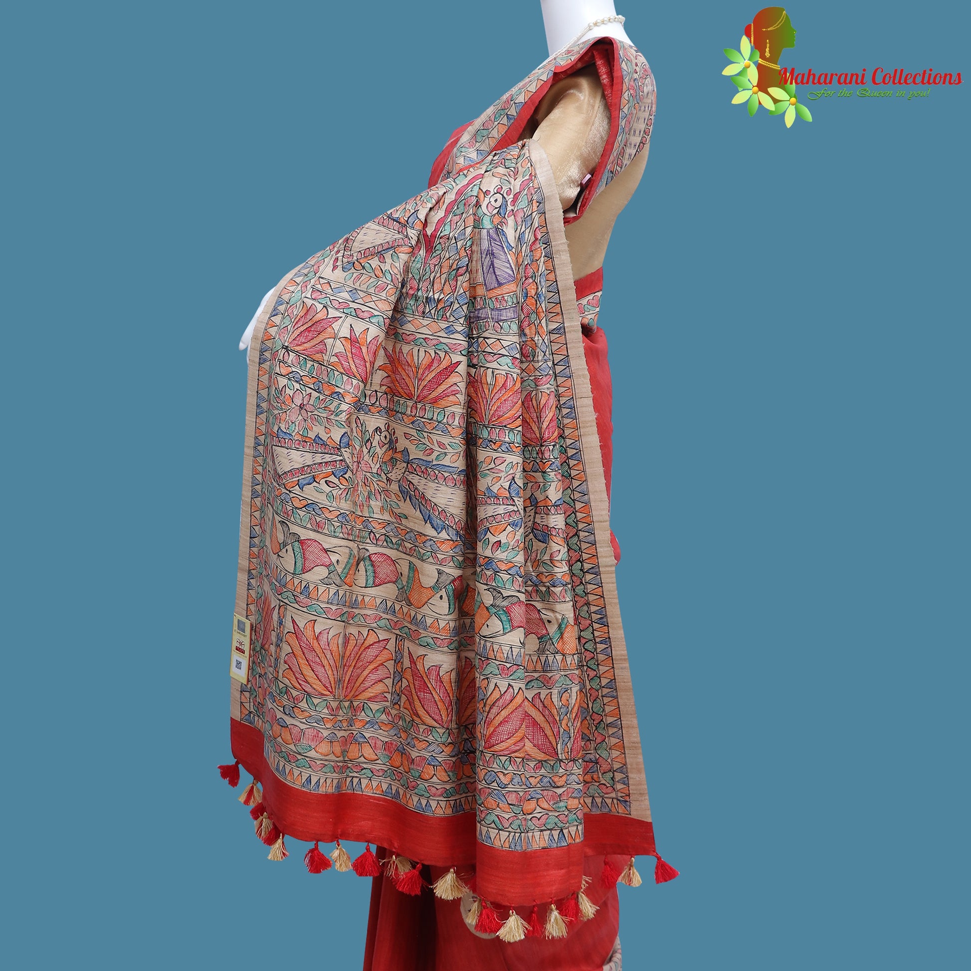 Pure Bhagalpur Tussar Silk Saree (Silk Mark) - Red Madhubani Work