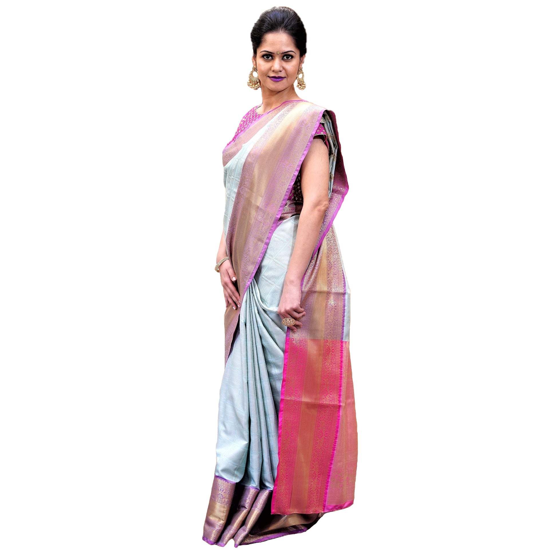 Blue and Pink authentic handloom weaved Kanjivaram (Kanchipuram) Silk Saree with golden Zari work, contrasting border and Pallu and Maharani's elegance!